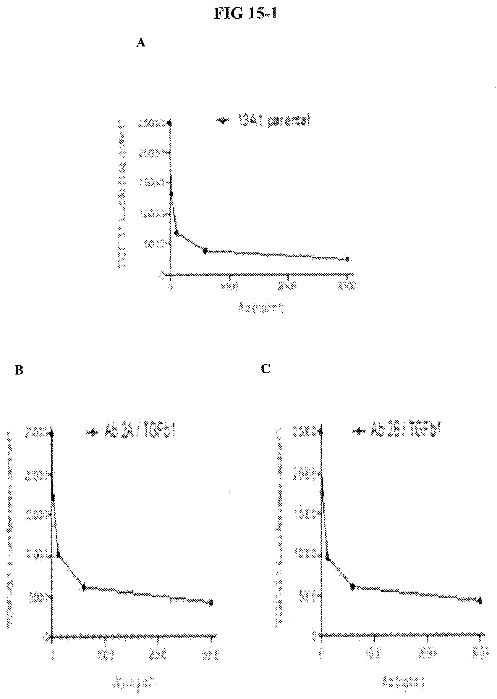 Exemplary and preferred conservative amino acid substitutions include any of: glutamine (Q) for glutamic acid (E) and vice versa; leucine (L) for valine (V) and vice versa; serine (S) for threonine (T) and vice versa; isoleucine (I) for valine (V) and vice versa; lysine (K) for glutamine (Q) and vice versa; isoleucine (I) for methionine (M) and vice versa; serine (S) for asparagine (N) and vice versa; leucine (L) for methionine (M) and vice versa; lysine (L) for glutamic acid (E) and vice versa; alanine (A) for serine (S) and vice versa; tyrosine (Y) for phenylalanine (F) and vice versa; glutamic acid (E) for aspartic acid (D) and vice versa; leucine (L) for isoleucine (I) and vice versa; lysine (K) for arginine (R) and vice versa. Amino acid substitutions may also be introduced to substitute an amino acid with a particularly preferable property. For example, a Cys may be introduced a potential site for disulfide bridges with another Cys. A His may be introduced as a particularly “catalytic” site (i.e., His can act as an acid or base and is the most common amino acid in biochemical catalysis). Pro may be introduced because of its particularly planar structure, which induces β-turns in the protein's structure. Two amino acid sequences are “highly homologous” or “substantially homologous” when at least about 70% of the amino acid residues (preferably at least about 80%, and most preferably at least about 90 or 95%) are identical, or represent conservative substitutions. The CDR regions of two antibodies are substantially homologous when one or more amino acids, or one or a few, or one to three, or one or two are substituted with a similar or conservative amino acid substitution, and wherein the antibody/antibodies have the profile of binding and activities of one or more of the antibodies, particularly one or more of antibody 13A1-2A, 13A1-2B, 13A1-2C, 13A1-2D, 13A1-2E, 13A1-2F, 13A1-2G, 13A1-2H, 13A1-2I, 13A1-2J, 13A1-AF, 13A1-AG, 13A1-AH, 13A1-BF, 13A1-BG, 13A1-BH, 13A1-CF, 13A1-CG, 13A1-CH, 13A1-DF, 13A1-DG, 13A1-DH, 13A1-EF, 13A1-EG and/or 13A1-EH disclosed herein. An antibody may be substantially homologous wherein one, two or three amino acids, or up to three amino acids, wherein one, two, three or four, or up to four amino acids, in the CDR domain regions are substituted with another amino acid and wherein the antibody retains the profile of antibody binding and activities. Exemplary CDR domain region amino acid substitutions are provided herein. Thus, in accordance with the invention, antibody CDR domain sequences, particularly the 13A1 murine antibody CDR domain sequences, have been modified whereby amino acid substitutions therein and variant CDR domain sequences are provided in the antibodies herein. In accordance with the invention, the antibodies of the present invention comprising new, variant or altered CDR domain sequences from murine 13A1 antibody remarkably retain TGFB-1 binding, specificity and neutralization, and possess further improved attributes, including having variable region sequences, particularly including framework region sequences, which have increased similarity to antibody variants produced naturally in humans. Thus, in accordance with the invention TGF-β1 antibodies, particularly TGF-β1 specific antibodies, are provided having heavy chain variable region comprising a CDR1 sequence TNYWMH (SEQ ID NO:27), NYWMH (SEQ ID NO:64) or NYWTH (SEQ ID NO:65), a CDR2 sequence TIYPGNSDTNYNQKFK (SEQ ID NO:28), TIYPGNSDTNYNQKFQ (SEQ ID NO:29) or TIYPGNSDTNYNQKFKD (SEQ ID NO:75), and a CDR3 sequence EDSRSLYYNGWDYFDY (SEQ ID NO:9), EDSRSLNFNGWDYFDY (SEQ ID NO:67), EDSRSLYYNGWDYFDH (SEQ ID NO:68), or EDSRSLNFNGWDYFDH (SEQ ID NO:69); or a CDR1 sequence TNYWMH (SEQ ID NO:27), a CDR2 sequence TIYPGNSDTNYNQKFK (SEQ ID NO:28), and a CDR3 sequence EDSRSLYYNGWDYFDY (SEQ ID NO:9); or a CDR1 sequence TNYWMH (SEQ ID NO:27), a CDR2 sequence TIYPGNSDTNYNQKFQ (SEQ ID NO:29), and a CDR3 sequence EDSRSLYYNGWDYFDY (SEQ ID NO:9); or a CDR1 sequence TNYWMH (SEQ ID NO:27), a CDR2 sequence TIYPGNSDTNYNQKFK (SEQ ID NO:28) or TIYPGNSDTNYNQKFQ (SEQ ID NO:29), and a CDR3 sequence EDSRSLYYNGW (SEQ ID NO:76). In a further aspect, antibodies of the invention may comprise a light chain variable region sequence comprising a CDR1 sequence RASESVDNYGISFLN (SEQ ID NO:30), KSSESVDNYGISFLN (SEQ ID NO:70) or RASESVDNYGISLLN (SEQ ID NO:72, a CDR2 sequence AASNQGS (SEQ ID NO:31), and a CDR3 sequence QQSKEVPRT (SEQ ID NO:14) or QQSKEVPR (SEQ ID NO: 73). The invention provides a TGF-β1 antibody or fragment thereof wherein the antibody or fragment comprises a heavy chain variable region sequence comprising a CDR1 sequence NYWTH (SEQ ID NO:65), a CDR2 sequence selected from TIYPGNSDTNYNQKFK (SEQ ID NO:28) and TIYPGNSDTNYNQKFQ (SEQ ID NO:29); and a CDR3 sequence selected from EDSRSLNFNGWDYFDY (SEQ ID NO:67), EDSRSLYYNGWDYFDH (SEQ ID NO:68) and EDSRSLNFNGWDYFDH (SEQ ID NO:69). In an aspect, the invention provides a TGF-β1 antibody or fragment thereof wherein the antibody or fragment comprises a heavy chain variable region sequence comprising a CDR1 sequence NYWTH (SEQ ID NO:65), a CDR2 sequence selected from TIYPGNSDTNYNQKFK (SEQ ID NO:28), TIYPGNSDTNYNQKFQ (SEQ ID NO:29) and TIYPGNSDTNYNQKFKD (SEQ ID NO:75); and a CDR3 sequence selected from EDSRSLNFNGWDYFDY (SEQ ID NO:67), EDSRSLYYNGWDYFDH (SEQ ID NO:68) and EDSRSLNFNGWDYFDH (SEQ ID NO:69). In an aspect, the invention provides a TGF-β1 antibody or fragment thereof wherein the antibody or fragment comprises a heavy chain variable region sequence comprising a CDR1 sequence NYWTH (SEQ ID NO:65), a CDR2 sequence selected from TIYPGNSDTNYNQKFK (SEQ ID NO:28), TIYPGNSDTNYNQKFQ (SEQ ID NO:29) and TIYPGNSDTNYNQKFKD (SEQ ID NO:75); and a CDR3 sequence selected from EDSRSLYYNGWDYFDY (SEQ ID NO:9), EDSRSLNFNGWDYFDY (SEQ ID NO:67), EDSRSLYYNGWDYFDH (SEQ ID NO:68) and EDSRSLNFNGWDYFDH (SEQ ID NO:69). In an aspect, the invention provides a TGF-β1 antibody or 