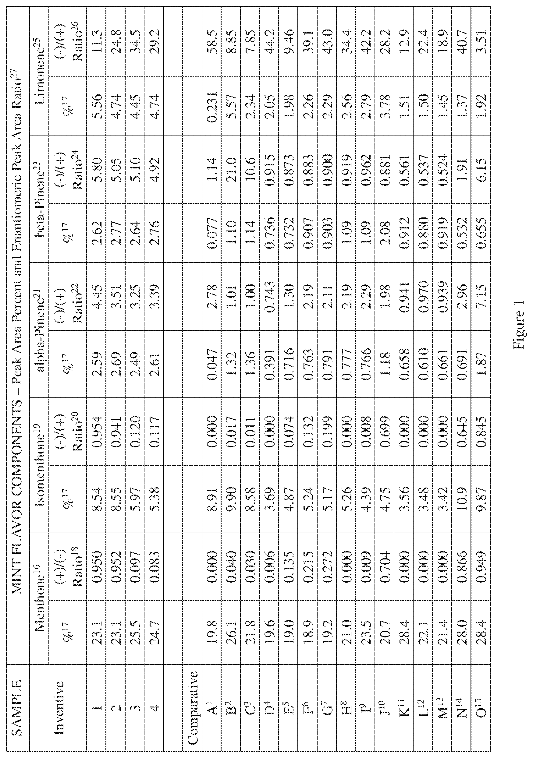 (−)-Menthol, 2216-51-5, 35-45% Menthol Racemic 89-78-1 Menthone/Isomenthone 10458-14-7, 22-26% Racemic 89-80-5, 491-07-6 Menthyl Acetate Racemic 89-48-5 1-12% Synthetic Dementholized Supplier's 0-20% Oil (DMO) Proprietary Mixture Eucalyptol 470-82-6 2.3-6.0% Peppermint Residue Distillate Mixture 0.01-5.0% (“tail cut”) Dihydromint Lactone 92015-65-1 0.035-0.500% L-Limonene 5989-54-8 2.40-8.00% Mint Oil Terpenes 68608-35-5 0.5-6.0% (“front cut”) Thymol 89-83-8 0.03-0.15% trans-Anethole 4180-23-8 0.0-3.00% Peppermint Oil 8006-90-4 0-5% Linalool 78-70-6 0.12-0.40% alpha-Pinene 80-56-8 1.0-5.0% beta-Pinene 127-91-3 0.5-3.0% (−)-Menthol, 2216-51-5, 35-45% Menthol Racemic 89-78-1 Menthone/Isomenthone 10458-14-7, 22-26% Racemic 89-80-5, 491-07-6 Menthyl Acetate Racemic 89-48-5 1-12% Natural and synthetic Supplier's 0-20% mint oil mixture Proprietary Mixture Natural Dementholized Oil 90063-97-1 0-20% Eucalyptol 470-82-6 2.3-6.0% Peppermint Residue Distillate Mixture 0.01-5.0% (“tail cut”) Dihydromint Lactone 92015-65-1 0.035-0.500% L-Limonene 5989-54-8 2.40-8.00% Mint Oil Terpenes 68608-35-5 0.5-6.0% (“front cut”) Thymol 89-83-8 0.03-0.15% trans-Anethole 4180-23-8 0.0-3.00% Peppermint Oil 8006-90-4 0-5% Linalool 78-70-6 0.12-0.40% alpha-Pinene 80-56-8 1.0-5.0% beta-Pinene 127-91-3 0.5-3.0% Sensory/Flavor Data