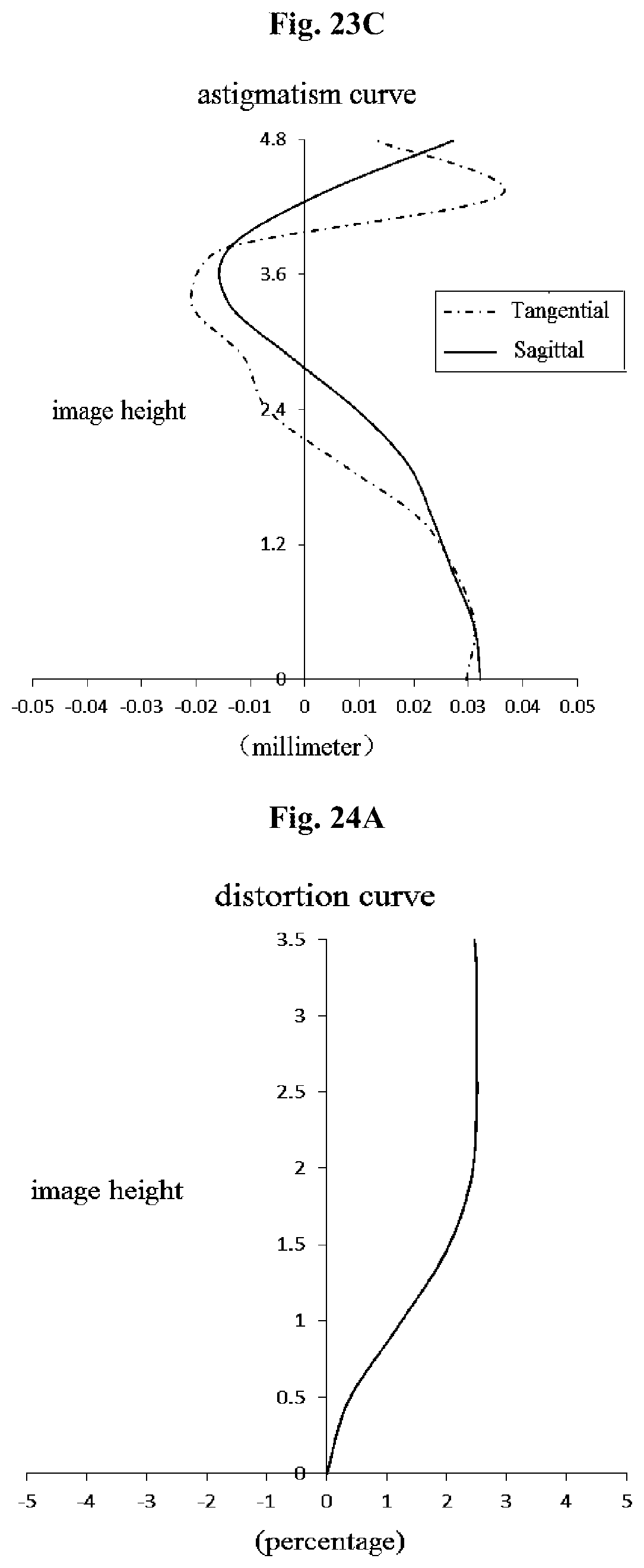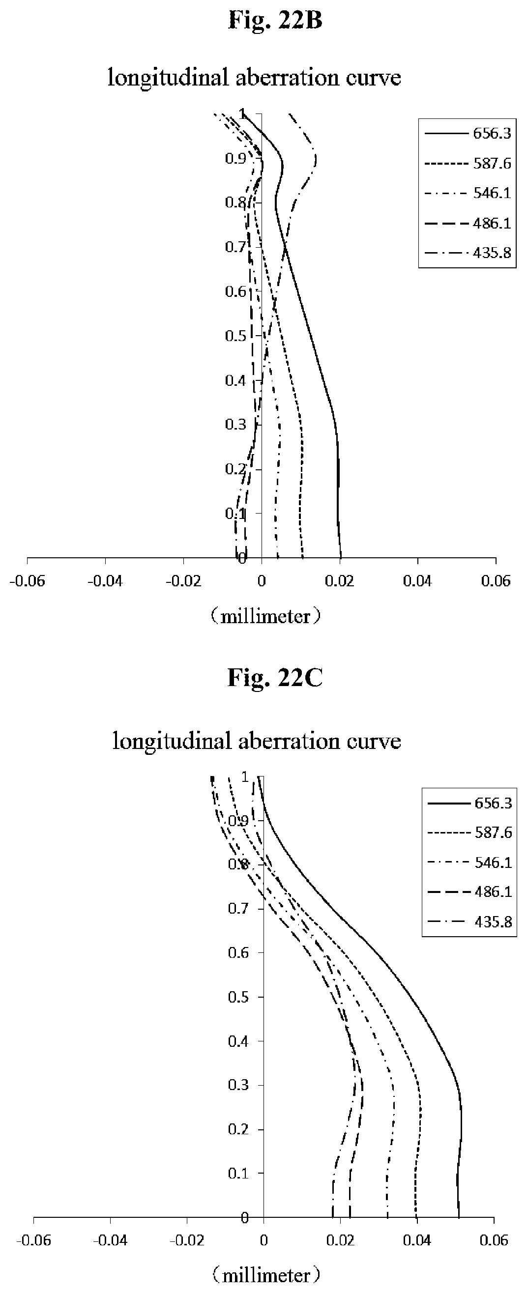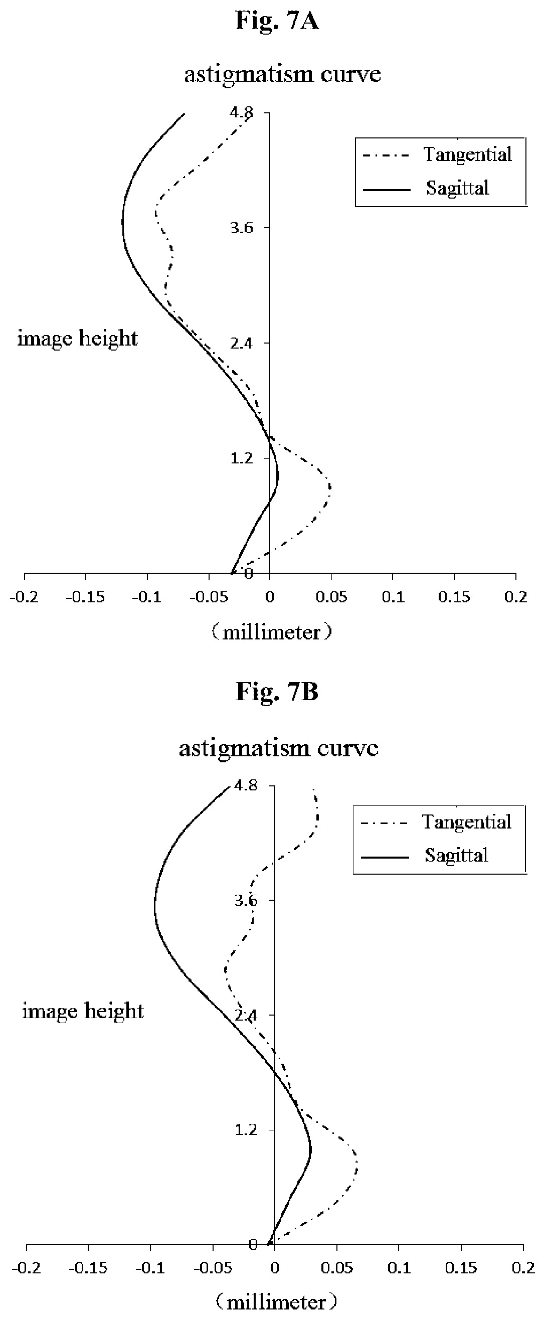 wherein z12is a vector height of a surface parallel to a Z-axis direction; CUX and CUY are curvatures (the curvature is a reciprocal of a curvature radius) of surface vertexes in X-axis and Y-axis directions respectively; KX and KY are conic coefficients in the X-axis and Y-axis directions respectively; AR, BR, CR, DR, ER, FR, GR, HR and JR are the 4th-order, 6th-order, 8th-order, 10th-order, 12th-order, 14th-order, 16th-order, 18th-order and 20th-order coefficients of the rotationally symmetric component of the aspheric surface respectively; and AP, BP, CP, DP, EP, FP, GP, HP and JP are the 4th-order, 6th-order, 8th-order, 10th-order, 12th-order, 14th-order, 16th-order, 18th-order and 20th-order coefficients of the non-rotationally symmetric component of the aspheric surface respectively. The following Table 19 shows each high-order coefficient applied to a rotationally symmetric component and non-rotationally symmetric component of the non-rotationally symmetric aspheric surface S12 in Embodiment 1.