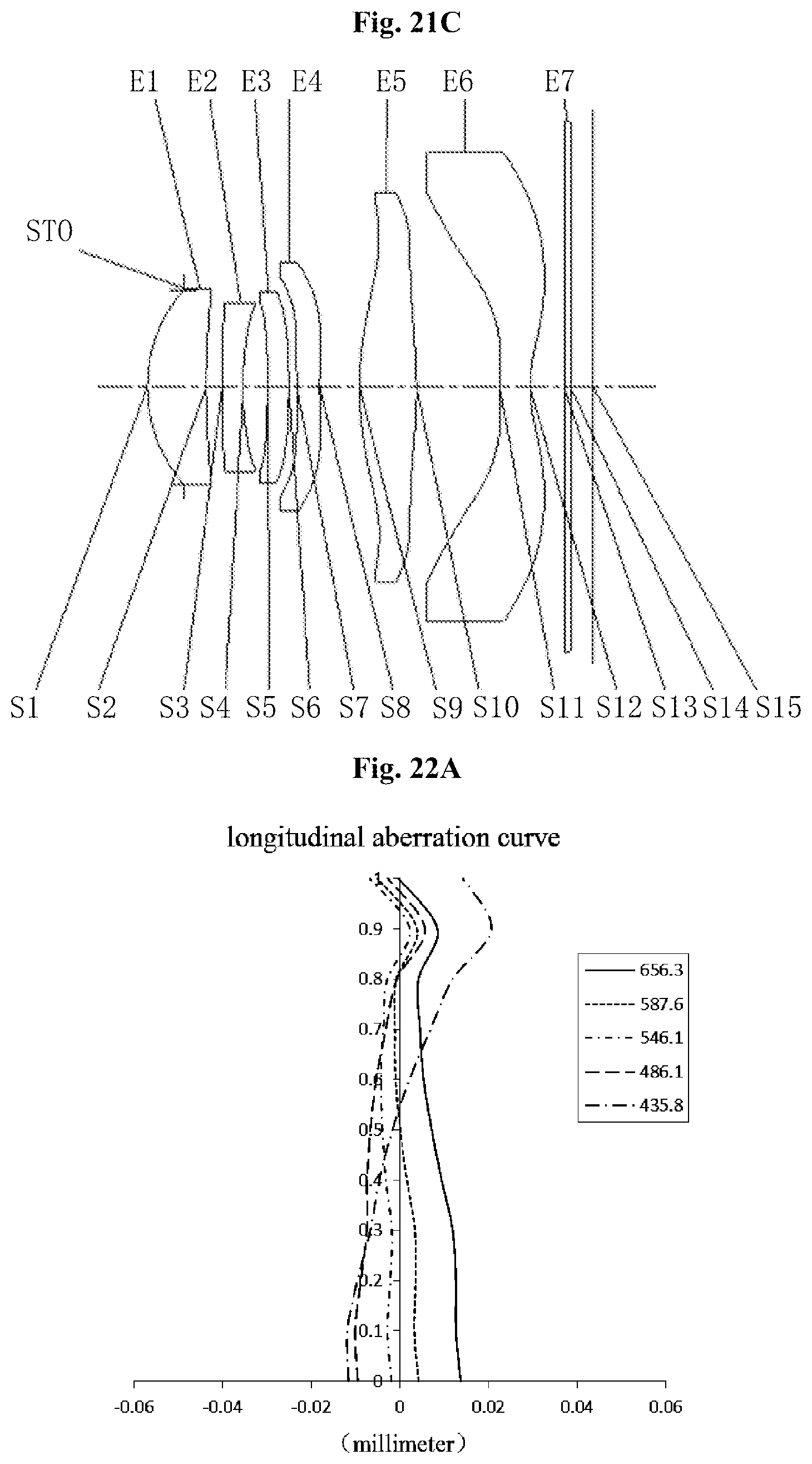 As shown in FIGS. 21A-21C, the optical imaging lens assembly sequentially includes from an object side to an image side along an optical axis: a diaphragm STO, a first lens E1, a second lens E2, a third lens E3, a fourth lens E4, a fifth lens E5, a sixth lens E6, an optical filter E7 and an electronic photosensitive element (not shown in the figures). The first lens E1 is configured to form a first lens group, and the second lens E2 to the sixth lens E6 are configured to form a second lens group. In the embodiment, the fourth lens E4 and the fifth lens E5 are arranged in a manner of moving along the optical axis. An optical filter may further be arranged on the image side of the sixth lens E6.