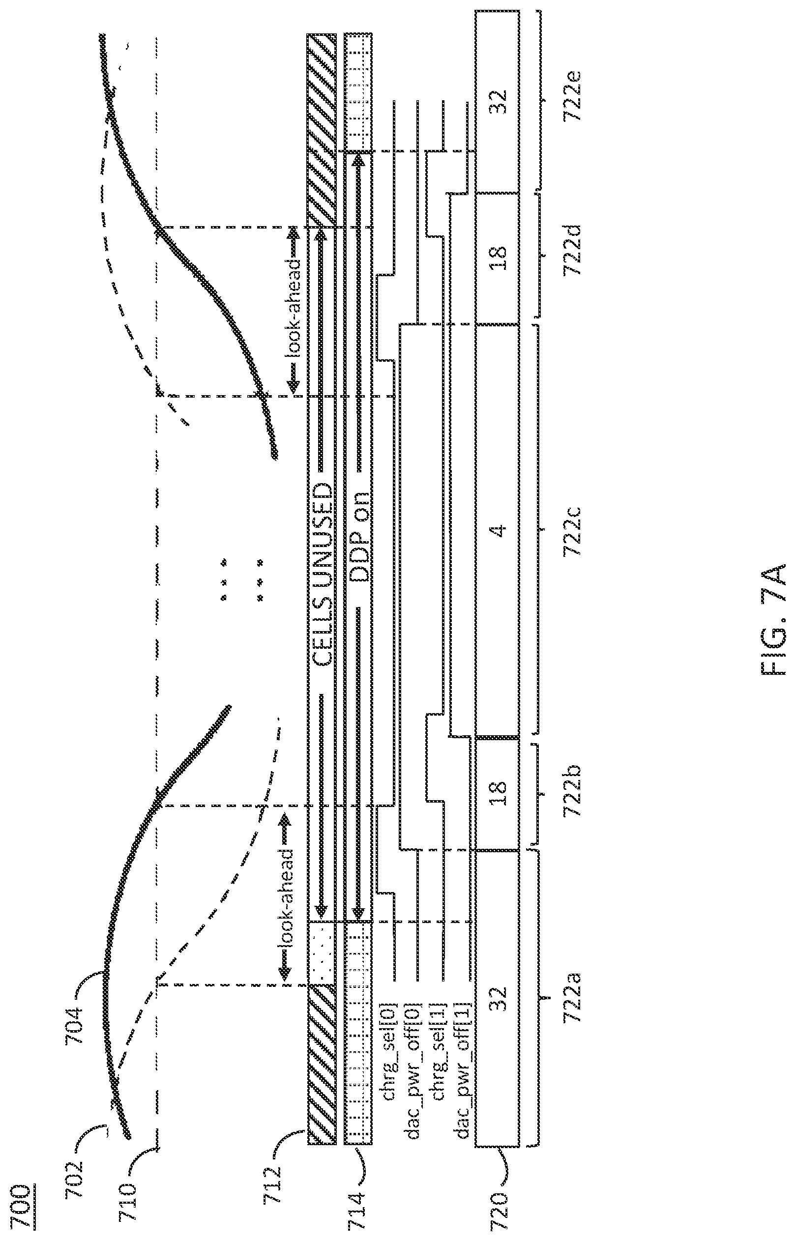 an input signal; a first plurality of digital-to-analog converter (DAC) cells coupled to the input signal, wherein the first plurality of DAC cells remain powered on; a second plurality of DAC cells, wherein ones of the second plurality of DAC cells are configured to be powered down when the input signal is below a selected threshold; a charge amplifier configured to provide charge to powered down DAC cells of the second plurality of DAC cells; and a multiplexor, coupled to the charge amplifier and the second plurality of DAC cells, wherein, when the input signal rises above the selected threshold, the multiplexor is configured to connect the charge amplifier charge to powered down DAC cells of the second plurality of DAC cells, wherein the charge amplifier charge powers up the powered down DAC cells of the second plurality of DAC cells. 13. The system of 14. The system of 15. The system of 16. A method for digital-to-analog conversion, comprising: