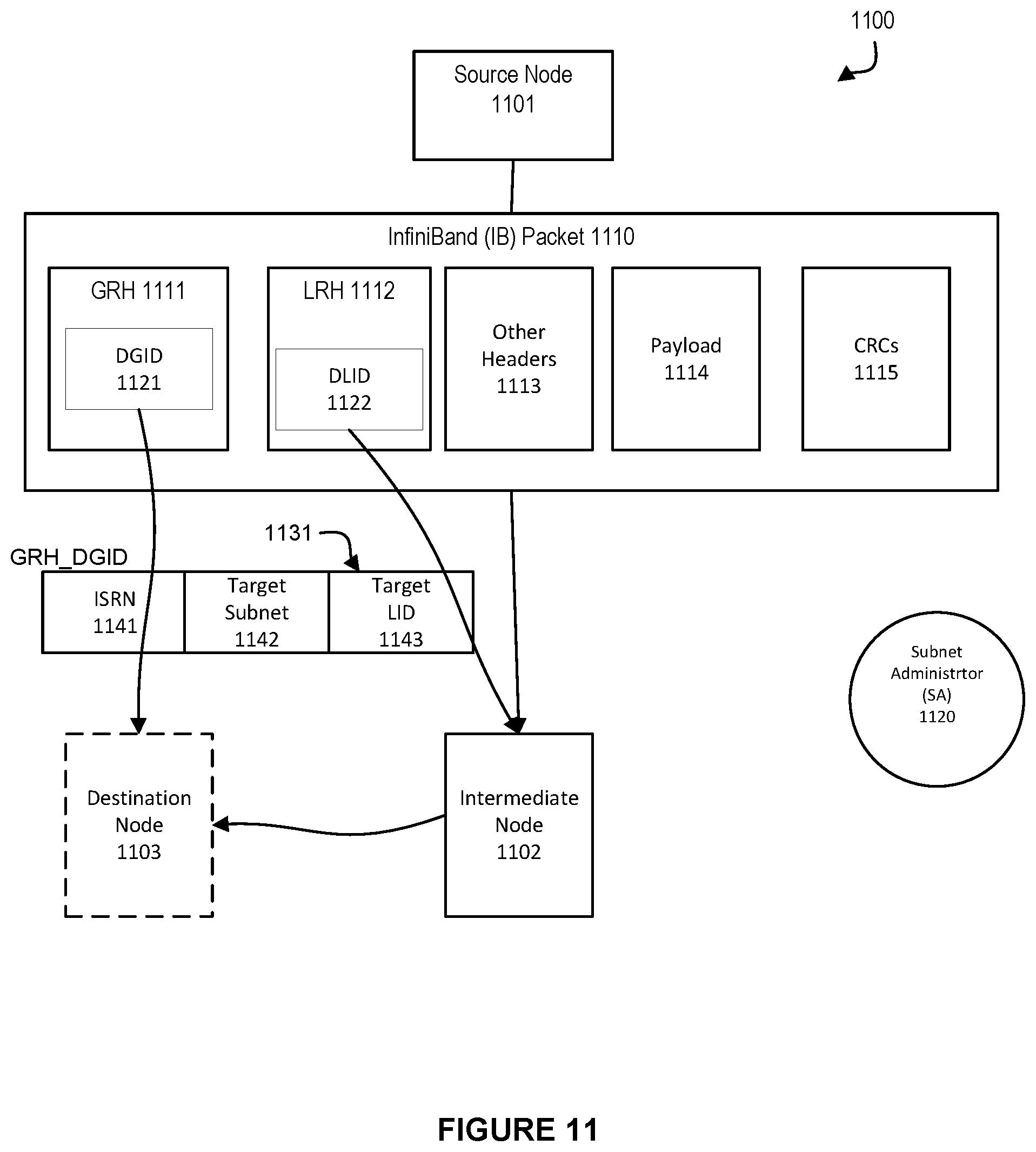 In order to reduce the amount of switch/router on-chip resources required to enable scalable, flexible and deterministic routing/forwarding for both intra-subnet and inter-subnet traffic within a single fabric configuration with coordinated management of routing/forwarding throughout the whole IB fabric, a scheme is used in accordance with an embodiment for identifying inter-subnet routes via numbers that are used for linear table lookup in a manner the same as LID-based table lookup within a single subnet. In this regard, The IB packet 1110 can include the payload 1114 and various headers according to the IB protocols. These headers can include a global routing header (GRH) 1111, a local routing header (LRH) 1112, and other headers 1113. Additionally, the IB packet 1110 can be applied with various cyclic redundancy checks (CRCs) 1115. In accordance with an embodiment, the system can take advantage of a subnet prefix portion of the destination global identifier (DGID) 1121 in the GRH 1111 and the destination local identifier (DLID) 1122 in the LRH 1112 for supporting intra- and inter-subnet addressing in the first IB subnet 1100 and the second IB subnet. For example, the system can set the DLID 1122 in the IB packet 1110 to be the DLID for the intermediate node 1102 (instead of the DLID for the destination node 1103). Within the IB subnet 1100, the IB packet 1110 can be routed via linear forwarding table LFT lookup to the intermediate node 1102 based on the DLID 1122 as resolved by the SA 1120. Thus, the IB packet 1110 can be processed using a data service provided on the intermediate node 1102. Similar data services can be provided in the other nodes 1101 and 1103 as well as may be necessary or desired. Furthermore, the system can use selected portions of the DGID 1121 in the GRH 1111 to indicate the DLID for the destination node 1103. Thus, the data service software in the intermediate node 1102 is able to resolve (or obtain) the real DLID for the destination node 1103 based on the DGID 1121 information in the GRH 1111. In accordance with an embodiment, the intermediate node 1102 can perform additional packet header 1113 and/or payload 1114 modifications when necessary. For example, the fabric level access control can be set up in a way that the source node 1101 and the destination node 1103 are either limited members of a relevant partition or not members of the same partition. In such a case, the intermediate node 1102 may be allowed to change the P_Key value in the IB packet 1110 before forwarding the modified packet to the destination node 1103. The InfiniBand (IB) Specification requires that Host Channel Adapters (HCAs) are able to receive packets with GRH where the subnet prefix 1131 of the Destination GID (DGID) 1121 of the incoming GRH 1111 is either a default prefix or a single prefix that has been assigned to the relevant HCA port by the local Subnet Manager (SM). This allows flexibility in terms of allowing a subnet to migrate from using the default prefix to using an assigned prefix. However, this provision of the IB specification does not resolve the issue of changing the assigned prefix value dynamically at run time, nor does it allow a global fabric implementation to use multiple subnet prefix values in order to control the routing for one or more end-nodes that each have one or more fixed GUID values such as described above, for example, with reference to the example embodiment. Accordingly, an example embodiment herein allows multiple GID subnet prefix values concurrently for incoming IB packets. In accordance with an example embodiment, by extending the ability to accept both the IB Specification default subnet prefix 1131 as well as the single end port subnet prefix value assigned by the Subnet Manager (SM) also together with the ability to selectively ignore the subnet prefix value 1131, a HCA implementation of the example embodiment supports both dynamic updates of the subnet prefix as well as the use of multiple prefix values to represent multiple paths through the fabric and further as well as dynamic updates of such paths without impacting existing data connections/flows. This flexible scheme preferably is based on the relevant router ports representing ingress paths to the local subnet to control that incoming subnet prefix values are acceptable for the local subnet. In accordance with an example embodiment, the assignment of GUIDs to end-nodes in the various subnets have either a subnet local scope, or are based on use of the globally unique EUI-64 values of the GRH. In the first (local scope) case, the uniqueness of a DGID depends on that the subnet prefix 1131 values are not the same for two identical destination GUIDs In the second (global scope) case, no dependency on the prefix uniquely identifying the relevant destination port is required. In order to enable the end-to-end route be completely defined in the packet headers without any need to do any mapping from GRH.DGID to DLID at any point along the path from source to final destination, an embodiment provides a GRH.DGID.subnetprefix format that includes both the Inter Subnet Route Number, a target “fabric local subnet number” as well as the destination LID value in the target subnet. A scheme or protocol of forwarding domains associated with switch/router ports is supported in an example embodiment wherein each forwarding domain type defines which address information is used for lookup in the LFTs, as well as if a change in forwarding domain type implies that the local route header should be updated with DLID values from the GRH. The above DGID.subnetprefix format is used in accordance with an embodiment in order to support a three level forwarding domain structure with a source subnet, an intermediate switch fabric and a target subnet. The source and intermediate nodes 1101, 1102 in the source subnet 1100 use the initial LRH.DLID of the packet 1100 for linear forwarding table (LFT) lookup, whereas