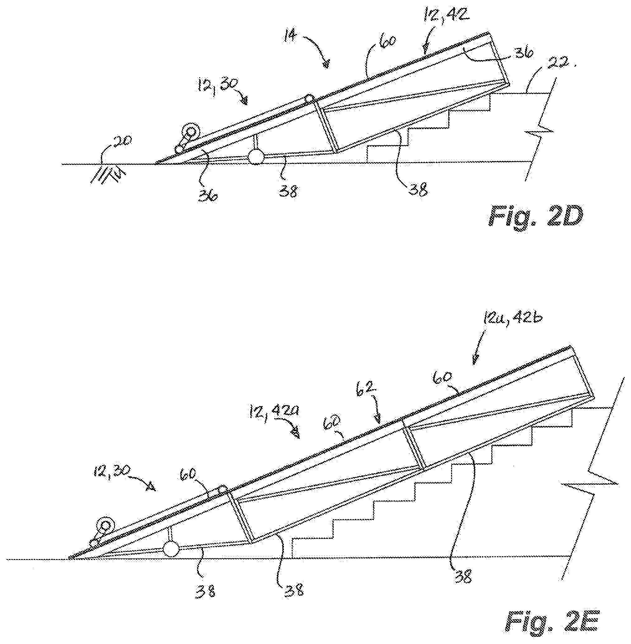 FIG. 1 is a side view of an embodiment of a portable lift, assembled to span from a lower surface to an elevated surface, with or without stairs extending therebetween, shown in dashes lines;