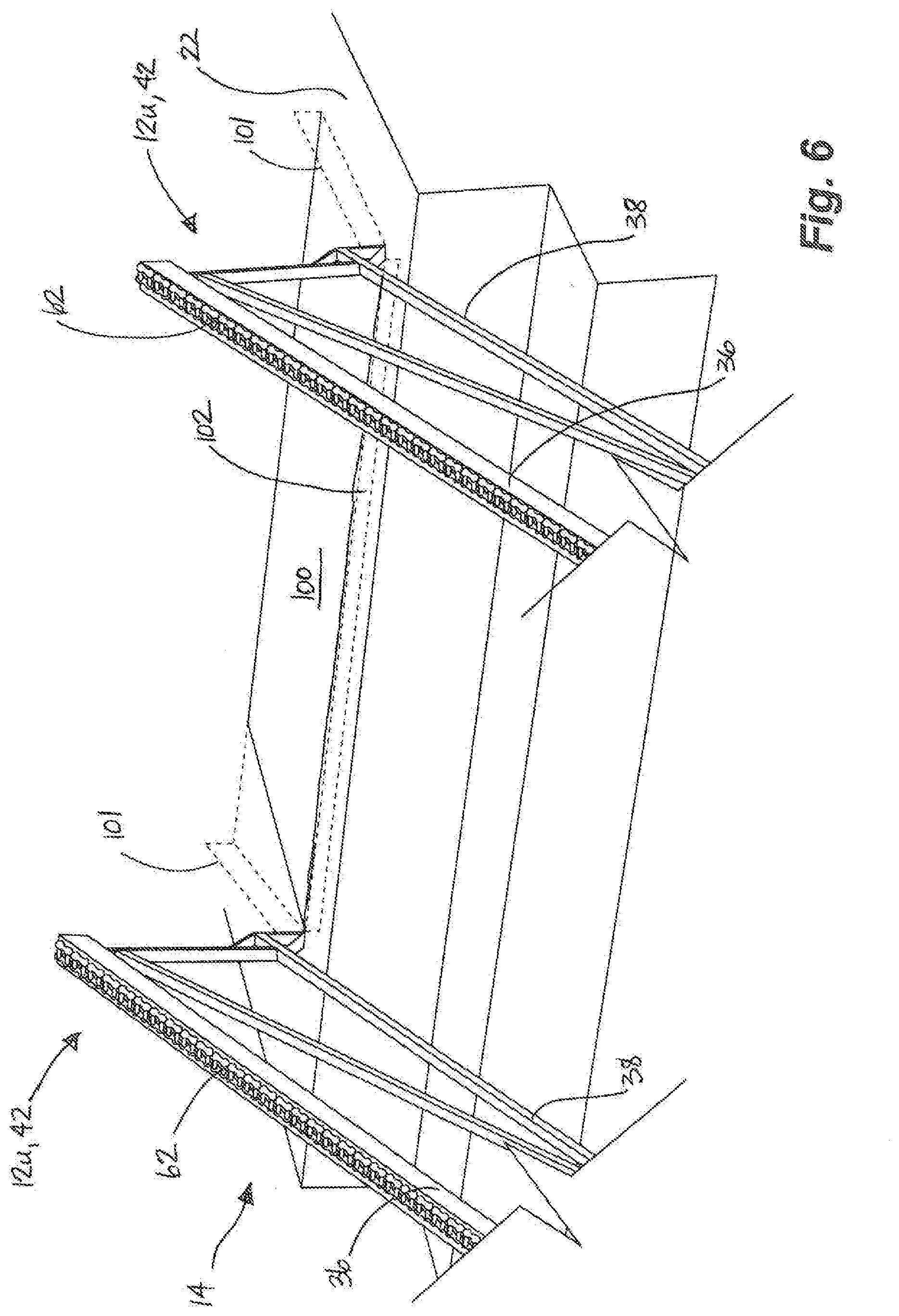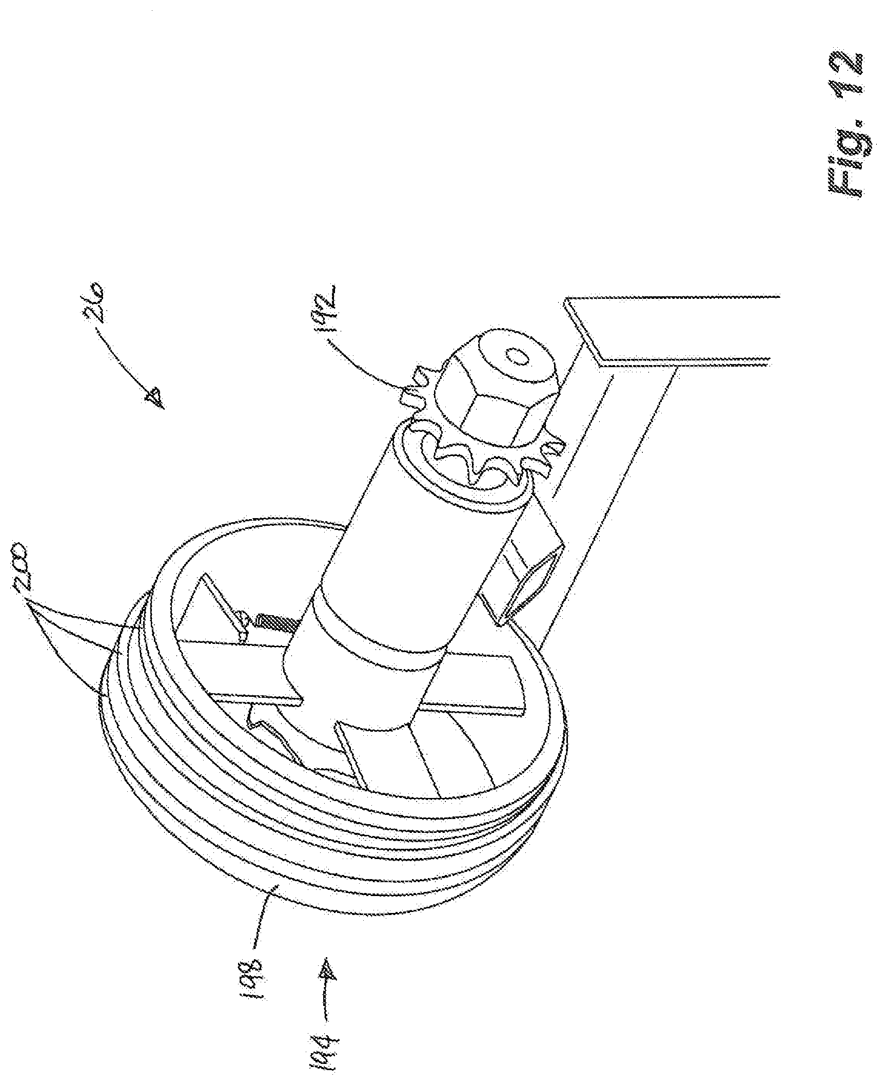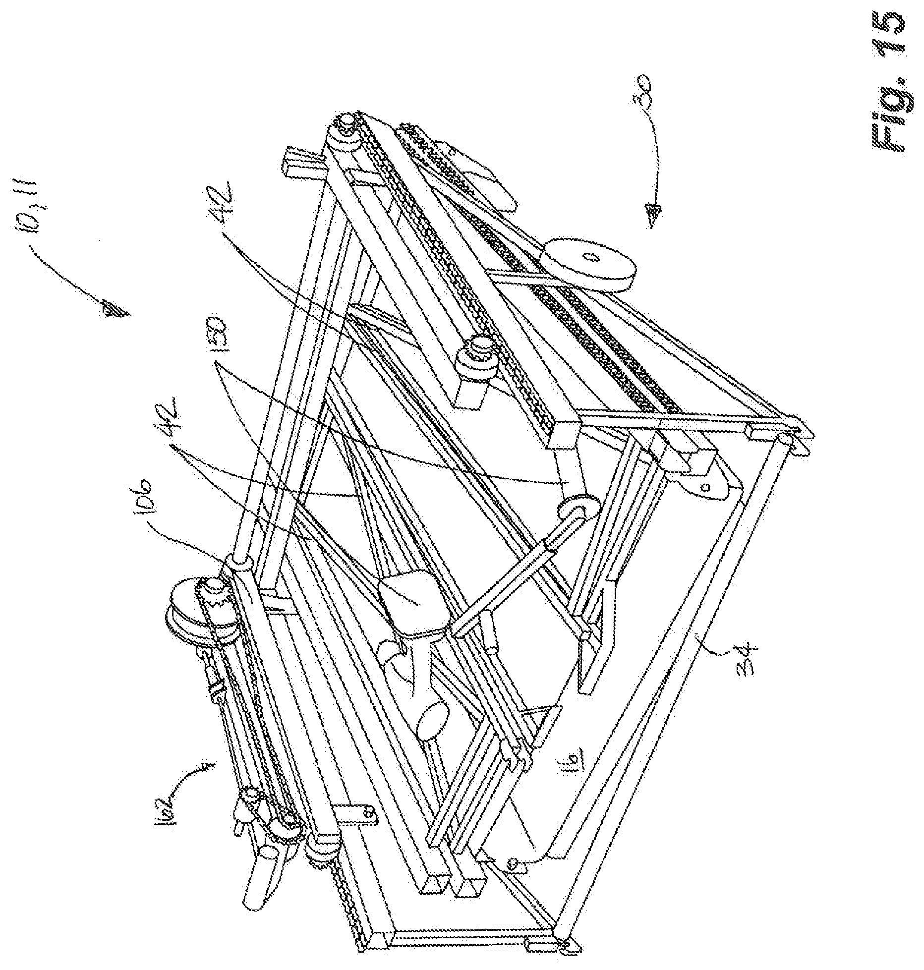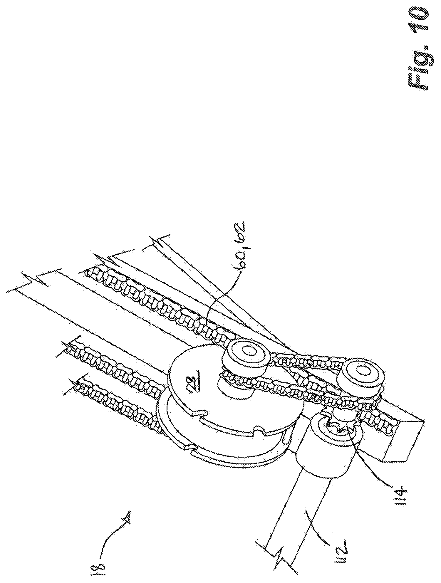 Having reference to FIGS. 1, 3 and 9 to 11B, in an embodiment the drive assembly 18 is a rack and pinion or sprocket, or chain and cog pinion drive system. The tracks 62 formed on the upper flanges 36 are the rack or chain portion of the drive assembly 18. For ease of discussion, the tracks 62 are further referred to herein as racks 62. The driven component 114 as described above is a driven sprocket.