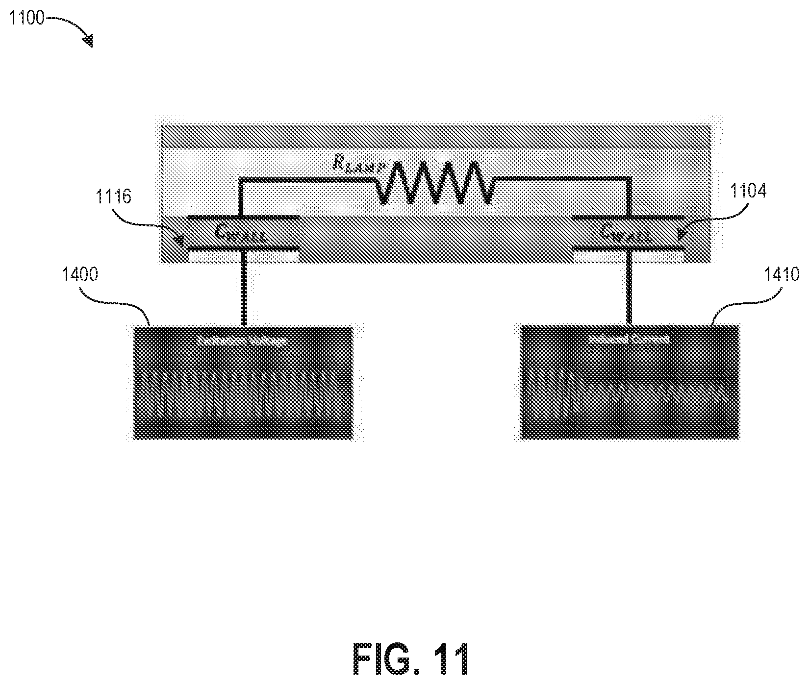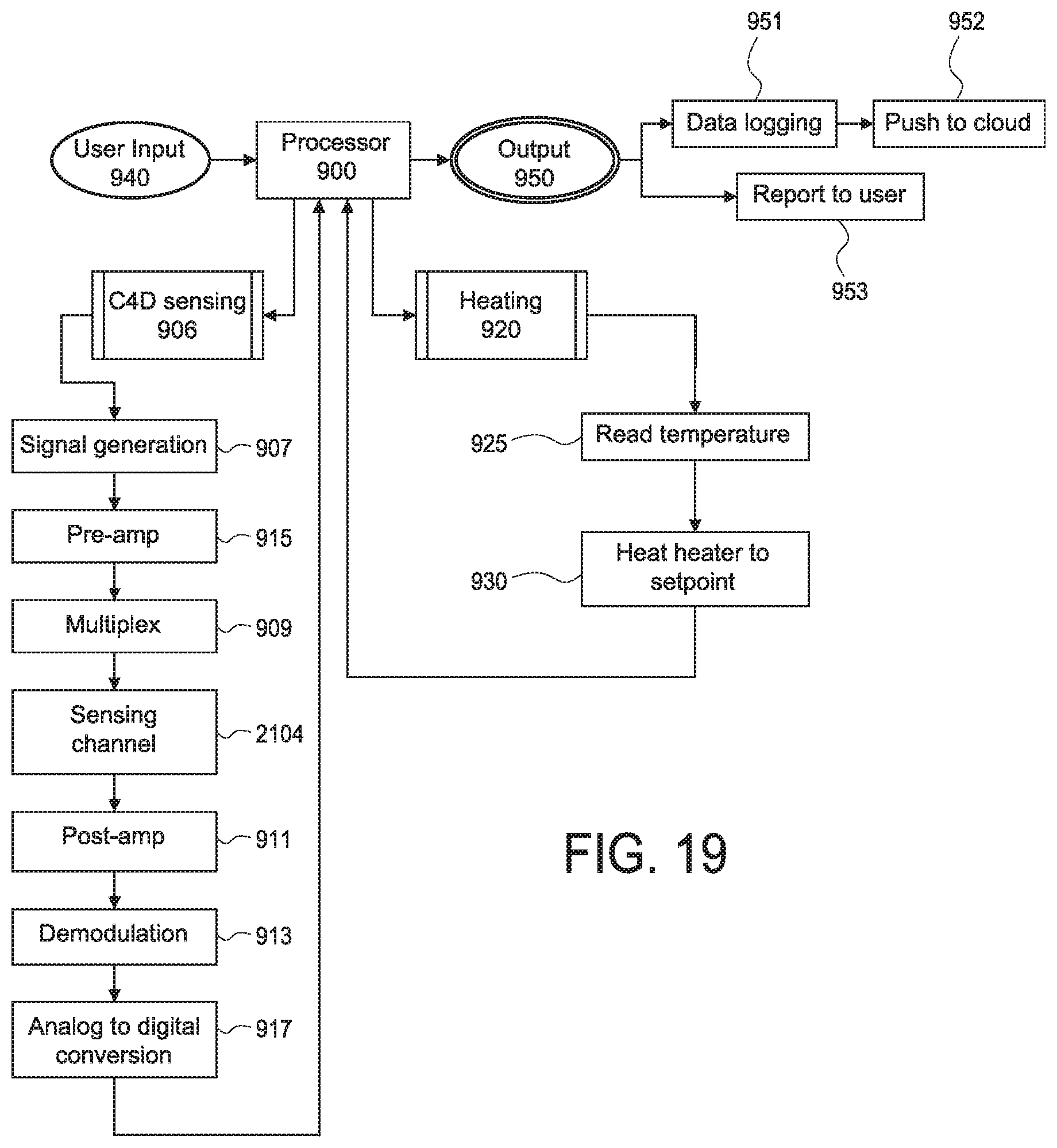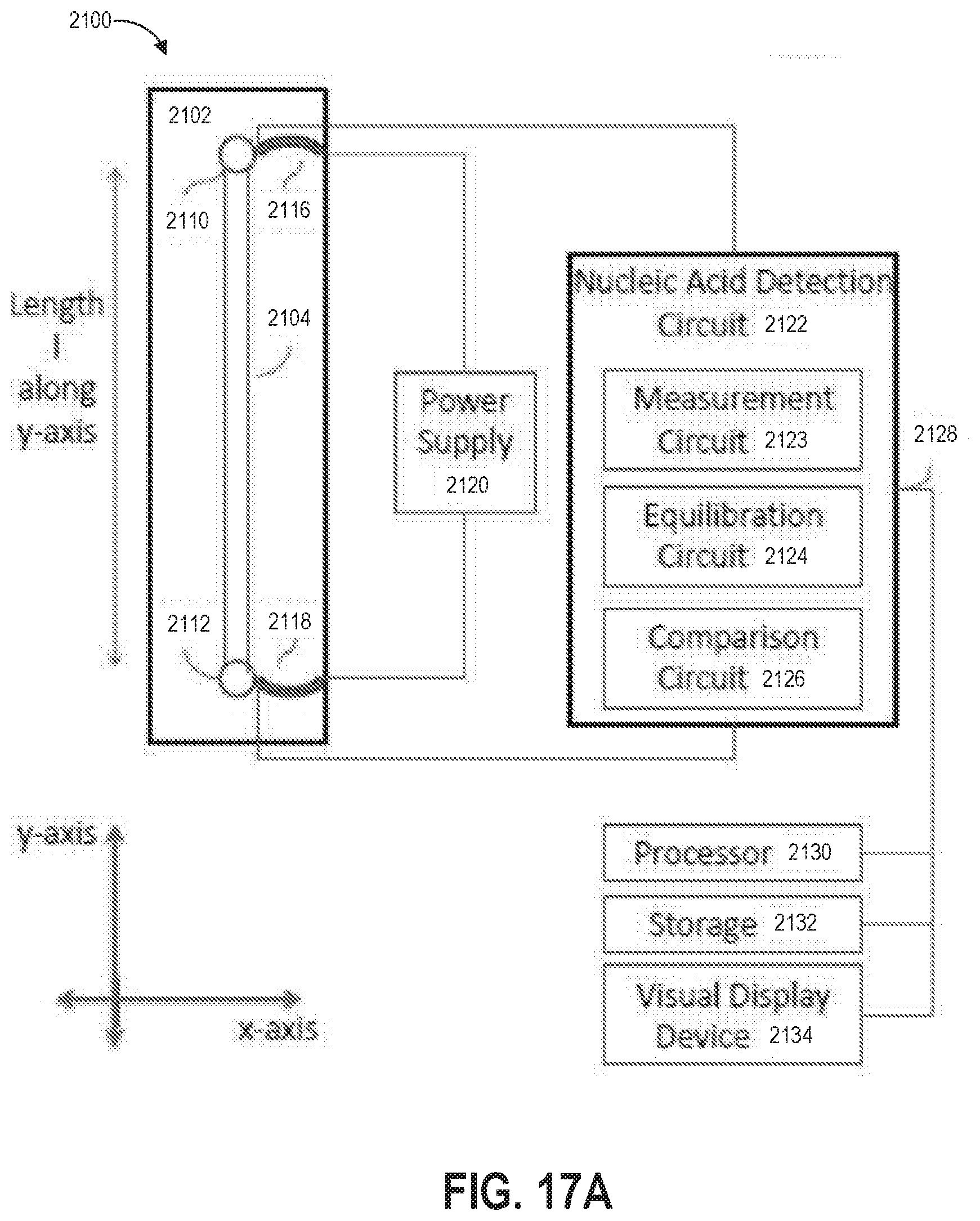for In other words, increasing the excitation frequency expands the range of conductivities for which the synchronous detector output is linear. A synchronous detector response is plotted with respect to non-dimensional conductivity in To evaluate the lumped parameter model's validity, the detector response for known conductivity solutions of KCl was measured. The chip's channel was 2 mm with 0.01 mm2cross-sectional area. The two electrodes were each 9 mm2, passivated with a 10 um layer of SU8 photoresist. The cell constant and capacitance were estimated and an excitation frequency was chosen so that the conductivity corresponding to the non-linearity in the detector output would be approximately 5 mS/cm. The experiment was repeated at excitation frequencies of 10, 15, and 20 kHz. The conductivity of pre-LAMP chemistries has been measured to be approximately 10 mS/cm. TABLE 1 below, presents the estimates for the minimal detector frequency governed by the constraint found earlier, namely: The results of the model, shown in As a tool to quickly estimate the conductance and wall capacitance, one may ignore surface conductivity and capacitance effects in addition to fringe fields effects. A geometry-specific finite element model can be used to further refine this crude estimate. The electrode is modeled as a parallel plate capacitor of area AE, separated by a dielectric of relative dielectric strength εr, and thickness t. The capacitance is then approximated as: where ε0is the dielectric constant. The fluid may be modeled as a simple resistor of cross-sectional area AF, length l, and conductivity σ. Thus, the conductance of the fluidic path may be approximated as From this, the cell constant is also approximated. In some aspects, the device is configured to determine “impedance spectrum” after the chip is introduced. The device may include a digitally controlled excitation frequency. The device may have quick frequency sweeping ability. The device may include in-phase and quadrature components of the induced signal, from which complex impedance can be determined. The fitness of impedance spectrum is determined, at least in part, based on curve fit or other heuristic to determine proper chip insertion and/or proper sample introduction. In some aspects, the device is first tested by exciting at a frequency determined by initial sweep. In some implementations, the device includes a detector that utilizes synchronous detection. In this way, measured induced currents attributable to the fluidic path (at phase minimum) may be detected in real time. In some embodiments, a channel or conduit has the following dimensions: a length measured along its longest dimension (y-axis) and extending along a plane parallel to the substrate of the detection system; a width measured along an axis (x-axis) perpendicular to its longest dimension and extending along the plane parallel to the substrate; and a depth measured along an axis (z-axis) perpendicular to the plane parallel to the substrate. An example channel may have a length that is substantially greater than its width and its depth. In some cases, example ratios between the length:width may be: 2:1, 3:1, 4:1, 5:1, 6:1, 7:1, 8:1, 9:1, 10:1, 11:1, 12:1, 13:1, 14:1, 15:1, 16:1, 17:1, 18:1, 19:1, or 20:1 or within a range defined by any two of the aforementioned ratios. In some embodiments, a channel or conduit is configured to have a depth and/or a width that is substantially equal to or smaller than the diameter of an aggregate, nucleic acid complex, or polymer formed in the channel, preferably while in suspension in the channel, due to interaction between the nucleic acid of interest and particles of the sensor compounds (e.g., one or more nucleic acid probes) used to detect the nucleic acid of interest. In some embodiments, a channel is configured to have a width taken along the x-axis ranging from about 1 nm to about 50,000 nm or a width that is within a range defined by any two numbers within the aforementioned range but is not limited to these example ranges. An example channel or conduit has a length taken along the y-axis ranging from about 10 nm to about 2 cm, or a length that is within a range defined by any two numbers within the aforementioned range but is not limited to these example ranges. An example channel has a depth taken along the z-axis ranging from about 1 nm to about 1 micron, or a depth that is within a range defined by any two numbers within the aforementioned range but is not limited to these example ranges. In some embodiments, a channel or conduit has any suitable transverse cross-sectional shape (e.g., a cross-section taken along the x-z plane) including, but not limited to, circular, elliptical, rectangular, square, D-shaped (due to isotropic etching), and the like. In some embodiments, a channel or conduit has a length in a range from 10 nm to 10 cm, such as e.g., at least or equal to 10 nm, 50 nm, 100 nm, 200 nm, 400 nm, 600 nm, 800 nm, 1 μm, 10 μm, 50 μm, 100 μm, 300 μm, 600 μm, 900 μm, 1 cm, 3 cm, 5 cm, 7 cm, or 10 cm or a length that is within a range defined by any two of the aforementioned lengths. In some embodiments, a channel has a depth in a range from 1 nm to 1 μm, such as e.g., at least or equal to 1 nm, 5 nm, 7 nm, 10 nm, 50 nm, 100 nm, 200 nm, 400 nm, 600 nm, 800 nm, 1 μm, 10 μm, 20 μm, 30 μm, 40 μm, 50 μm, 100 μm, 500 μm, or 1 mm or a depth that is within a range defined by any two of the aforementioned depths. In some embodiments, a channel has a width in a range from 1 nm to 50 μm, such as e.g., 1 nm, 5 nm, 7 nm, 10 nm, 50 nm, 100 nm, 200 nm, 400 nm, 600 nm, 800 nm, 1 μm, 10 μm, 20 μm, 30 μm, 40 μm, 50 μm, 100 μm, 500 μm, or 1 mm or a width that is within a range defined by any two of the aforementioned widths. In some implementations, the channels or conduits are formed in a cartridge that is later inserted into a device. In some aspects, the cartridge may be a disposable cartr