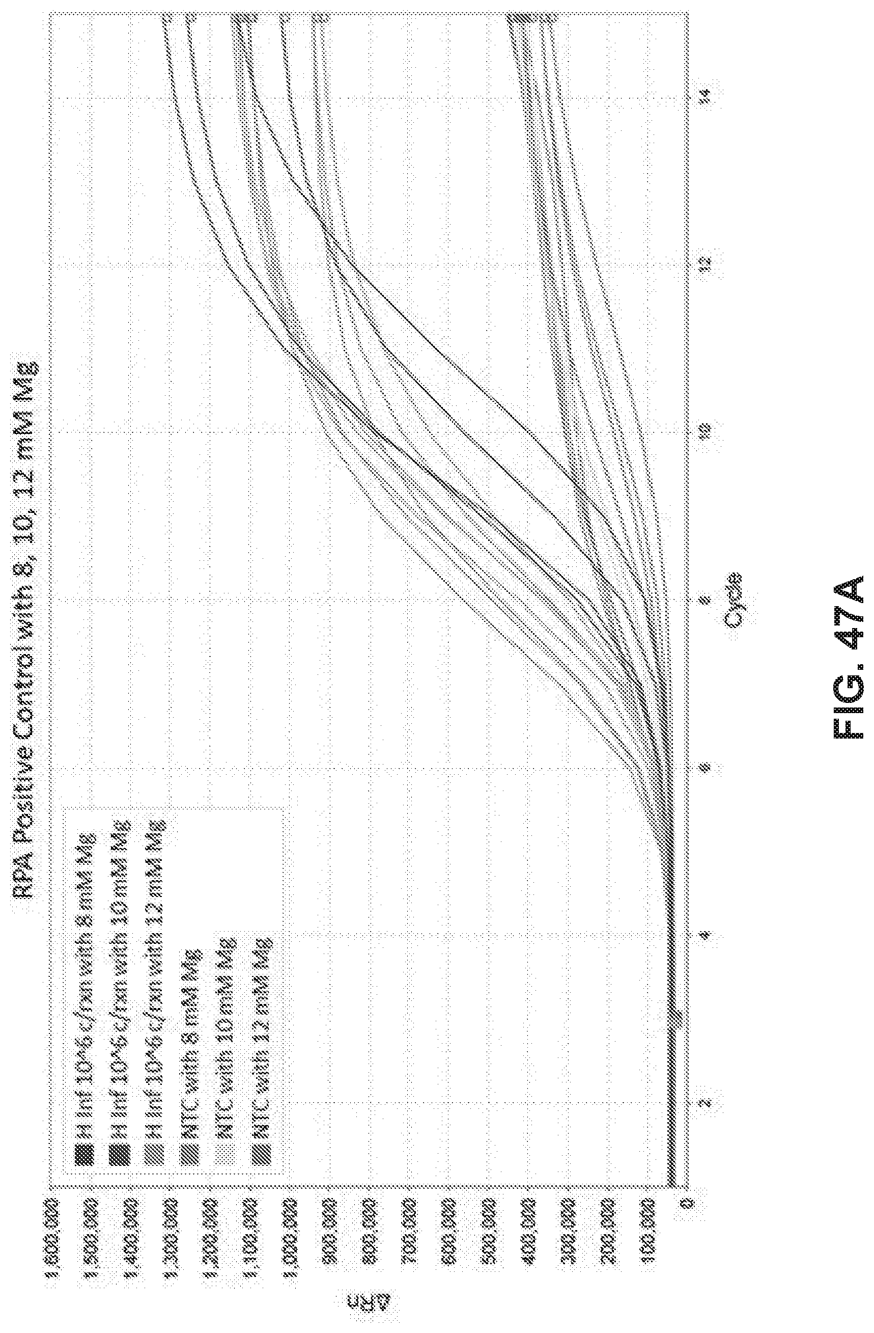 1 Synthetic HBV 2 Synthetic HBV 3 Synthetic HBV 4 NTPC 5 Hinf 6 Hinf SEQ ID NO: 01 GACAAGAATCCTCACAATACCGCAGAGTCTAGACTC (HBV target) GTGGTGGACTTCTCTCAATTTTCTAGGGGGATCACC CGTGTGTCTTGGCCAAAATTCGCAGTCCCCAACCTC CAATCACTCACCAACCTCCTGTCCTCCAATTTGTCCT GGTTATCGCTGGATGTGTCTGCGGCGTTTTATCATAT TCCTCTTCATCCTGCTGCTATGCC SEQ ID NO: 02 TCCTCACAATACCGCAGAGT (HBV F3 primer) SEQ ID NO: 03 GCATAGCAGCAGGATGAAGA (HBV B3 primer) SEQ ID NO: 04 GTTGGGGACTGCGAATTTTGGCCTCGTGGTGGACTTCTCTCA (HBV FIP primer) SEQ ID NO: 05 TCACCAACCTCCTGTCCTCCAAATAAAACGCCGCAGACACAT (HBV BIP primer) SEQ ID NO: 06 CACGGGTGATCCCCCTA (HBV LF primer) SEQ ID NO: 07 TTTGTCCTGGTTATCGCTGG (HBV LB primer) SEQ ID NO: 08 TGGTACGCCAATACATTCAACAAGAAATTAATCCAA (Hinf target) AAGAAAAATTTGCGTTTGTTGAATTCTGGGGGCGAG GCTATACACAAGATACCTTTGGTCGTCTGCTAAATG ATGCCTTTGGTAAAGAAGTAAAAAACCCATTCTATT ATGTCAGAAGTTTTACTGATGATATGGGTACATCTG TTCGCCATAACTTCATCTTAGCACCACAAAACTTCT CATTCTTCGAGCCTATTTTTGCACAAACCCCATACG ACAGTATTCCTGATTACTACGAAGAAAAAGGCAGA ATTGAACCAATTA SEQ ID NO: 09 GCAGACGACCAAAGGTATCTTG (Hinf LF primer) SEQ ID NO: 10 CGTATGGGGTTTGTGCA (Hinf B3 primer) SEQ ID NO: 11 CGCCAATACATTCAACAAGA (Hinf F3 primer) SEQ ID NO: 12 CTGATGATATGGGTACATCTGTTCGCGAAGAATGAG (Hinf BIP primer) AAGTTTTGTGG SEQ ID NO: 13 ACTTCTTTACCAAAGGCATCATTTTGCGTTTGTTGAC (Hinf FIP primer GCCAAATTCTGG sequence) Master mix 1 LAMP master mix (2X; NEB) 12.5 dUTP Additive (100 mM; Sigma) 0.175 NTPC mix Master mix 1 12.675 Water 12.325 Hinf mix Master mix 1 12.675 Hinf primers (25X) 1 Hinf target (1M/μl) 1 Water 10.325 Master mix 2 Master mix 1 12.675 UDG 0.5 HBV primers (25X) 1 Synthetic Master mix 2 13.175 HBV HBV target (10e10 c/μl) 1 Water 10.825 Hinf PC (1M copies) 1704.5 10.4 0.6 HBV Synt (10B 380.4 5.5 1.5 copies) Example 12—RPA Master Mix and Protocol