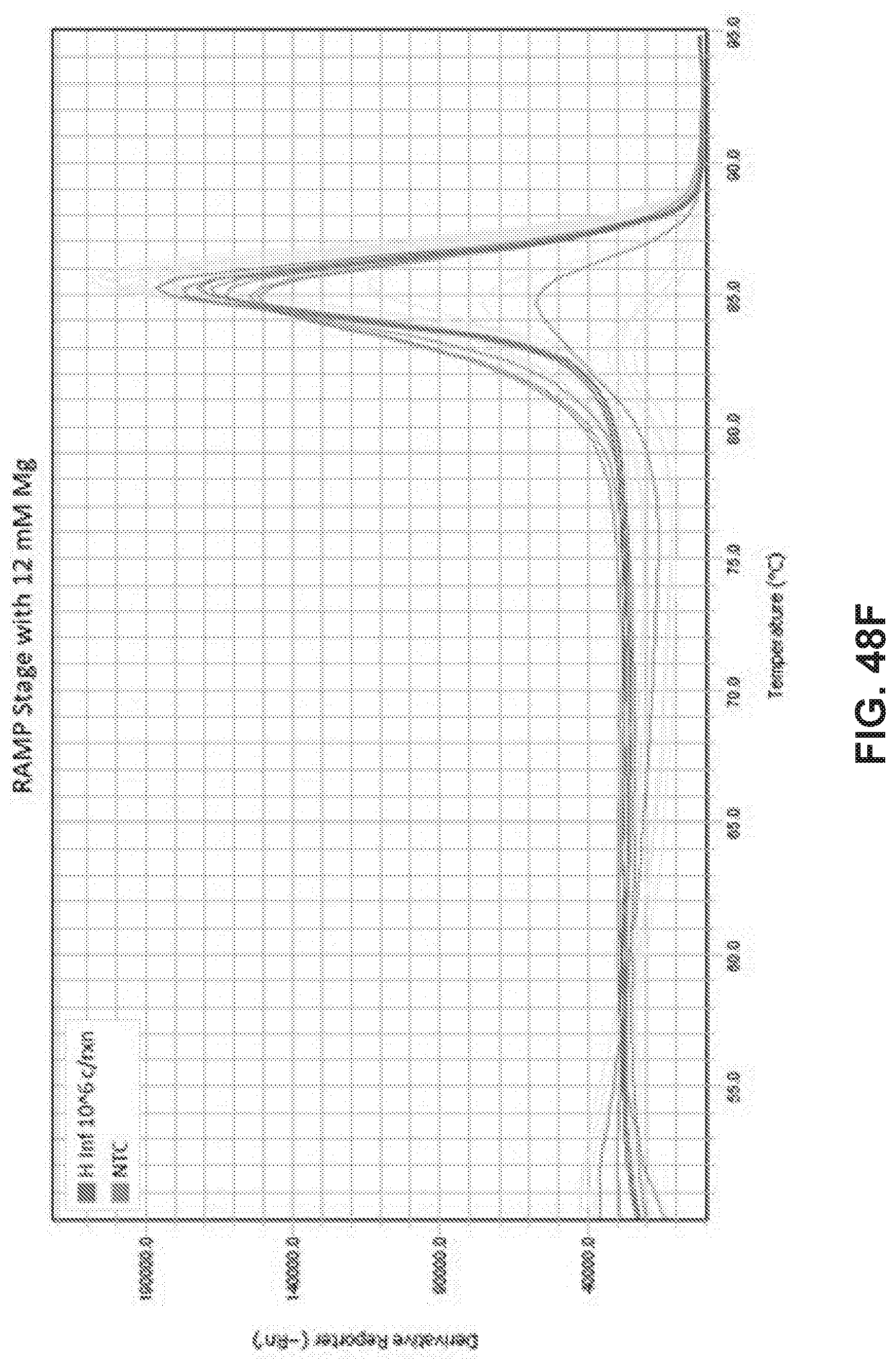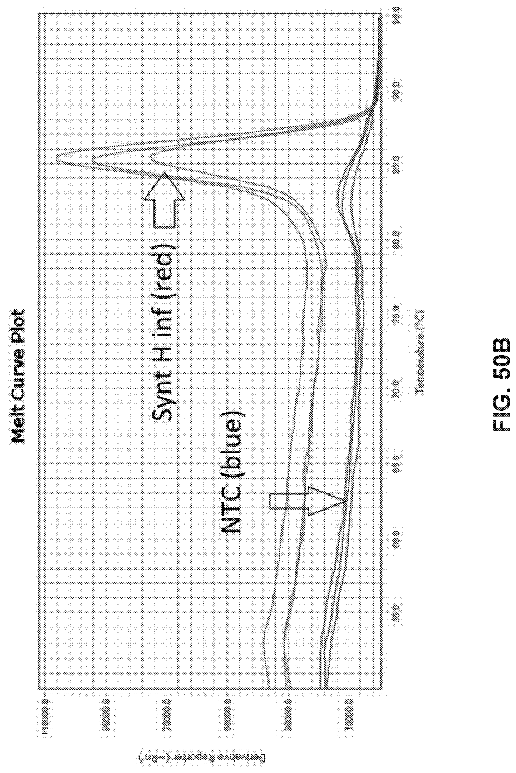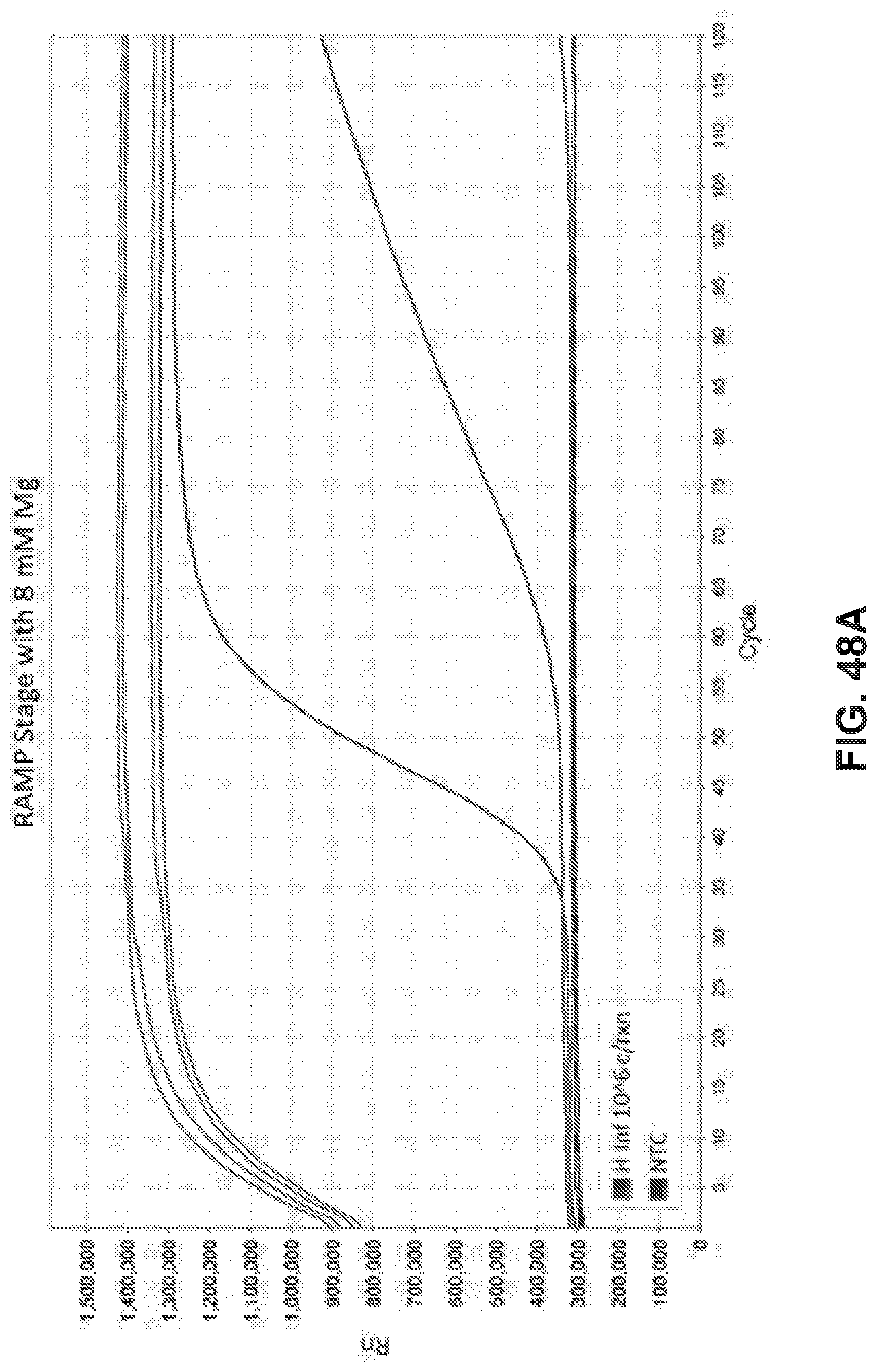 PC No Blocker 4.88 0.15 3.14 3 out of 3 Control P_15-15_4800 13.17 0.42 3.16 3 out of 3 P_15-15_2400 8.15 0.74 9.09 3 out of 3 P_15-10_4800 8.02 0.00 0.01 3 out of 3 (1 outlier eliminated) P_12-12_2400 4.34 0.33 7.66 3 out of 3 P_10-15_4800 5.88 0.10 1.78 3 out of 3 P_10-10_4800 4.36 0.28 6.43 3 out of 3 P_10-10_2400 3.62 0.33 8.99 3 out of 3 NTC No Blocker 6.10 0.52 8.51 3 out of 3 Control N_15-15_4800 51.20 3.99 7.78 almost amplified 3 out of 3 N_15-15_2400 25.40 1.11 4.35 3 out of 3 N_15-10_4800 24.54 0.33 1.36 3 out of 3 N_12-12_4800 8.37 0.49 5.88 3 out of 3 N_12-12_2400 5.74 0.40 6.90 3 out of 3 N_10-15_4800 7.47 0.31 4.15 3 out of 3 N_10-10_4800 4.21 0.61 14.59 3 out of 3 N_10-10_2400 3.63 0.02 0.44 3 out of 3 14 RPA H Inf_180430 RPA_F1 CGCCAATACATTCAACAAGAAATTAA Primer (“F1”) TCCAAAAG 15 RPA H Inf_180430_F1_B10 CTTTTGGATT/3Phos/ Blocker (“F1_B10”) 16 RPA H Inf_180430_F1_B12 CTTTTGGATTAA/3Phos/ Blocker (“F1_B12”) 17 RPA H Inf_180430_F1_B15 CTTTTGGATTAATTT/3Phos/ Blocker (“F1_15”) 18 RPA 180709 B17_F1_H Inf CTTTTGGATTAATTTCT/3Phos/ Blocker 180430 RPA (“F1_17”) 19 RPA 180709 B19_F1_H Inf CTTTTGGATTAATTTCTTG/3Phos/ Blocker 180430 RPA (“F1_19”) 20 RPA 180709 B21_F1_H Inf CTTTTGGATTAATTTCTTGTT/3Phos/ Blocker 180430 RPA (“F1_21”) 10{circumflex over ({circumflex over ( )})}6 14.08 0.46 3.24 10{circumflex over ( )}5 18.00 0.46 2.54 10{circumflex over ( )}4 25.04 0.46 1.85 10{circumflex over ( )}3 37.22 2.23 5.98 10{circumflex over ( )}2 38.90 1.58 4.05 10{circumflex over ( )}1 40.62 0.72 1.78 0 (NTC) 43.13 3.71 8.61 Example 14—Isothermal Amplification Such as LAMP with Low Levels of DTT, or in the Absence of DTT