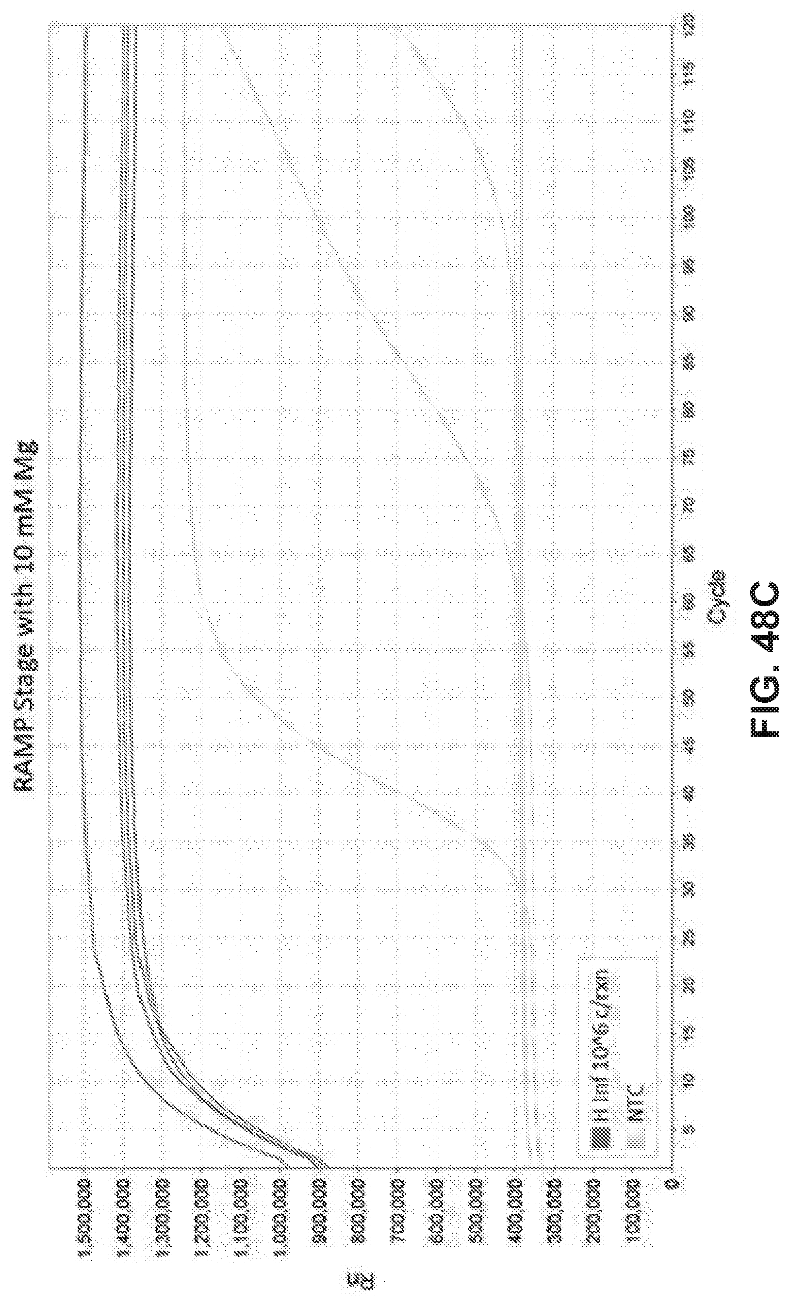 Synthetic nucleic acids + 1% Tween 1214 15 1.22 Synthetic nucleic acids + 5% Tween 1123 54 4.84 Plasma + 1% Tween 1754 1040 59.32 Plasma + 1% Tween + 5 mM DTT 1728 1030 59.61 Plasma + 1% Tween + 10 mM DTT 1202 213 17.76 Plasma + 1% Tween + 25 mM DTT 1467 609 41.53 Plasma + 1% Tween + 50 mM DTT 1576 543 34.43 Plasma + 1% Tween + 100 mM 1391 165 11.84 DTT Plasma + 5% Tween 1038 48 4.64 Plasma + 5% Tween + 5 mM DTT 961 52 5.43 Plasma + 5% Tween + 10 mM DTT 979 68 6.94 Plasma + 5% Tween + 25 mM DTT 983 38 3.89 Plasma + 5% Tween + 50 mM DTT 965 122 12.66 Plasma + 5% Tween + 100 mM 1111 102 9.18 DTT No template control No amplification detected Synthetic nucleic acids + 2% Tween 957 3 0.27 Synthetic nucleic acids + 5% Tween 842 12 1.37 Plasma + 2% Tween 2163 n/a n/a Plasma + 2% Tween + 0.5 mM 1671 989 59.16 DTT Plasma + 2% Tween + 1 mM DTT 1512 623 41.17 Plasma + 2% Tween + 5 mM DTT 1234 154 12.45 Plasma + 2% Tween + 10 mM DTT 1042 56 5.38 Plasma + 3% Tween 1995 1004 50.34 Plasma + 3% Tween + 0.5 mM 1119 63 5.65 DTT Plasma + 3% Tween + 1 mM DTT 1581 948 59.87 Plasma + 3% Tween + 5 mM DTT 1067 107 10.03 Plasma + 3% Tween + 10 mM DTT 1237 120 9.73 Plasma + 4% Tween 1182 71 6.04 Plasma + 4% Tween + 0.5 mM 1112 117 10.56 DTT Plasma + 4% Tween + 1 mM DTT 1229 301 24.50 Plasma + 4% Tween + 5 mM DTT 1076 114 10.64 Plasma + 4% Tween + 10 mM DTT 1017 57 5.61 Plasma + 5% Tween 1142 62 5.42 Plasma + 5% Tween + 0.5 mM 1104 93 8.46 DTT Plasma + 5% Tween + 1 mM DTT 1510 800 52.99 Plasma + 5% Tween + 5 mM DTT 1020 65 6.34 Plasma + 5% Tween + 10 mM DTT 1014 59 5.79 No template control No amplification detected Example 11—Amplification of Targets with Cartridges