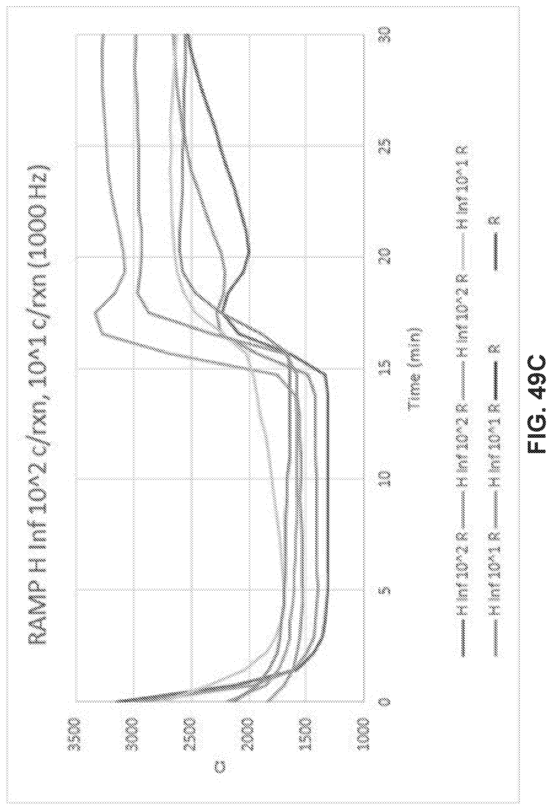 Experiments where an RPA reagent solution was prepared according to the Basic Master Mix of Example 12, but including 8 U of NEB's WarmStart Bst 2.0, and dNTPs at 5.6 mM instead of the 1.8 mM, and varying amounts of magnesium. The RPA phase contained only RPA primers, then LAMP FIP/BIP and LF/LB were added after the RPA phase was complete. A purpose of these experiments were performed to add the NEB WarmStart Bst 2.0 to the RPA phase, as a step toward a one-pot RAMP reaction because all components, except for the LAMP primers and additional dNTPs were included in the RPA phase. The total volume in the RPA phase was 23 μL and 2 μL of LAMP primers and dNTPs were added following the RPA run. A LAMP reagent solution was provided, which included 1 μL of H Inf LAMP primers and 1 μL of a 95 mM dNTP mix. 2 μL of this mix was added to each 23 μL RPA reaction after its run. This volume can be added to the lid or side of the RPA reaction tubes, then inverted and spun down, similar to an RPA activation step. The LAMP stage was run in the same strips used for the RPA stage since the LAMP reagent solution was added directly to the tubes instead of RPA reaction being removed and added to a new tube. LAMP primer sequences are shown in TABLE 17. The RPA primers were H Inf RPA F1 (SEQ ID NO: 14) and H Inf RPA R3 (SEQ ID NO: 28: ATTGGTTCAATTCTGCCTTTTTCTTCGTAGTAATC). The experiments were run on a QS3 instrument. The target was Synthetic H Inf (106copies/reaction). The data in Experiments were performed to test RAMP with serial dilutions of H Inf in the cartridge (106-100copies/reaction) to determine a sensitivity, specificity, and limit of detection in a cartridge. RPA was performed in a similar manner (with the modified Basic Master Mix of Example 12) to the RPA in Example 17, except that LAMP primers were not added into the RPA reaction at the end of the RPA stage, and the reaction was performed on a cartridge. The RPA stage was run for 15 minutes at 40° C. on the cartridge. No data was taken during the RPA stage. 2.5-μL aliquots were transferred from the RPA reactions to a LAMP master mix. The LAMP stage was run for 60 minutes at 65° C. on the cartridge. Effectively, the products of the RPA reaction were used as templates in LAMP. Because the RPA product was diluted 10× when it was transferred to the LAMP reaction, the target concentrations in the RPA stage are a decade higher than the target concentrations in the LAMP phase. The target concentration listed in the data refers to the final concentration after the dilution. Because of this, the initial RPA target concentrations were 107, 106, 105, 104, 103, 102, and 101copies per reaction (c/r×n). The reason for the 10× dilution from the RPA phase to the LAMP phase was that the RPA reaction mix contained 5 mM of DTT, which may in some cases be incompatible with an electrical detection sensor. By diluting it 10×, the final DTT concentration became 0.5 mM, which allowed the cartridge to detect amplification signals. Data are depicted in Amplification was seen for almost all replicates, except for a few replicates on the cartridge with 104and 103c/r×n. Overall, the Cts were slower than what was seen in the thermocycler; 106c/r×n came up almost immediately in the LAMP stage, while 106came up at closer to 10 min in the cartridge. These data indicate that according to some embodiments, LAMP may be performed on an RPA reaction product as a template. Experiments were conducted to determine whether RPA and LAMP could be performed together in one reaction mix with blockers included in the reaction solution. An amplification reaction solution was provided that included Bst 2.0 in MM, 5.6 mM dNTPs and 10 mM Mg2+, using TwistAmp Liquid Basic Master Mix. Experiments included 3 replicates of Synt H inf and 3 replicates of NTC with the following conditions:
