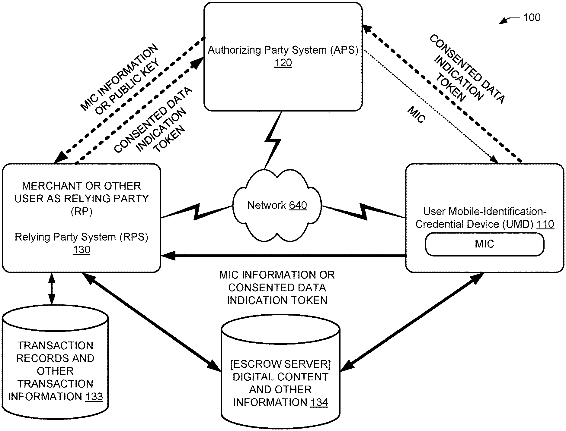 the APS being configured to provision the MIC onto the first party system, the provisioning providing MIC user information; the first party system being configured to send, to the second party system, a request for services; the second party system being configured to send, to the first party system, a request for identification information of the first party; the first party system being configured to receive, from the first party, consent to release part or all of first party information associated with the MIC; (i) the first party system being configured to send, to the second party system, the consented part or all of first party information, and the APS being configured to verify the part or all of first party information associated with the MIC or (ii) the APS being configured to send, to the second party system, the consented part or all of first party information as verified part or all of first party information associated with the MIC; the second party system being configured to use the verified part or all of first party information associated with the MIC to verify or not verify an identity of the first party; and the second party system being configured to verify the identity of the first party before the second party system grants the request to provide services to the first party. 24. The system of verifying an identity of the individual; collecting MIC information pertaining to the individual; compiling the MIC information into the MIC stored in a memory of the APS; and copying the MIC from the APS to the UMD. 25. The system of a government entity, a governmental source, a governmental agency, a federal government agency, an official agency, or a private agency authorized by an official agency to provision the MIC. 26. The system of
