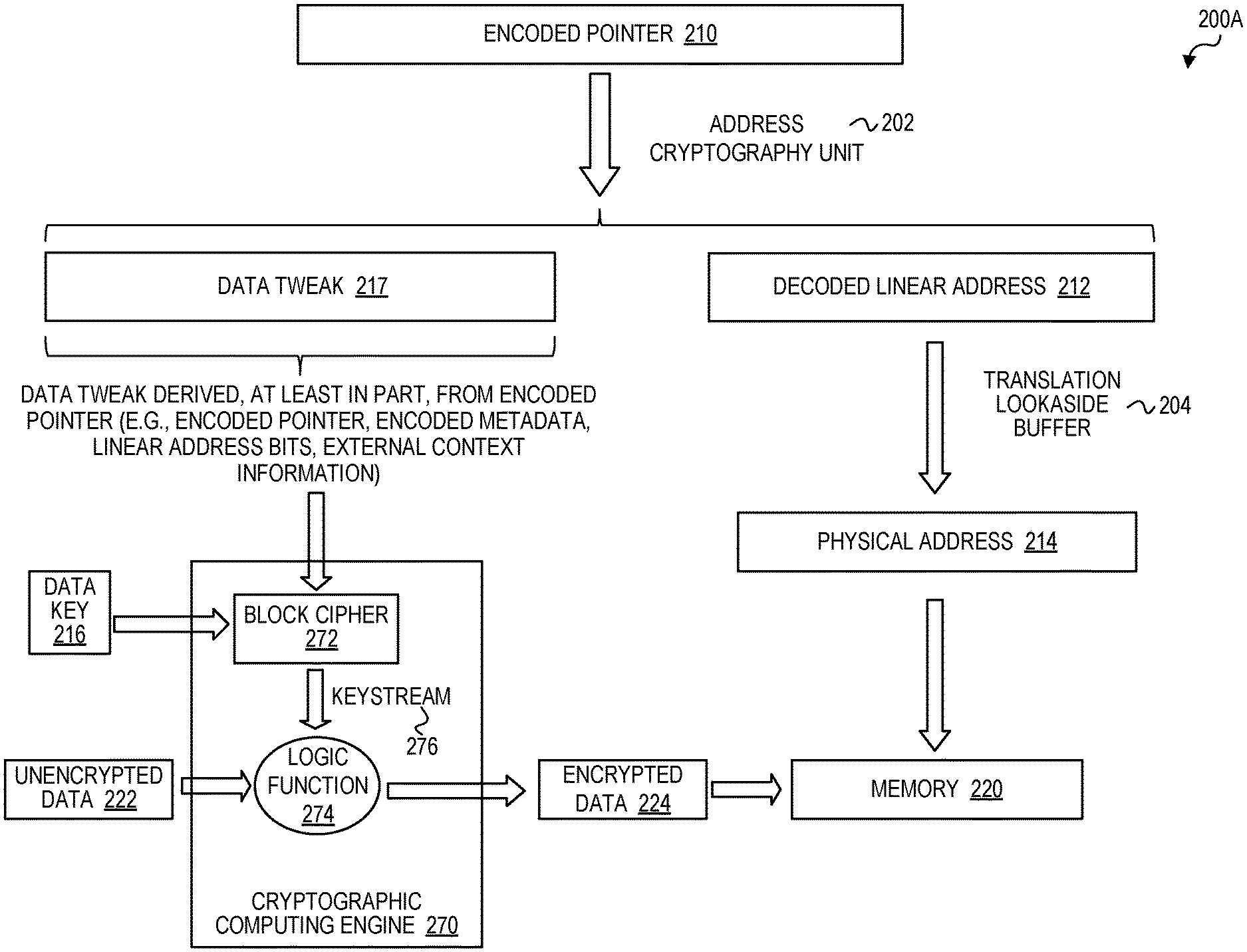 encrypt data associated with the write request based on the one or more keys; and cause the encrypted data to be stored in the memory. 21. The system of 22. The system of for requests to read data from the memory, decrypt the encrypted data using the encrypted virtual address as a tweak input; and for requests to write data to the memory, encrypt the data using the encrypted virtual address as a tweak input. 23. The system of 24. The system of 25. The system of