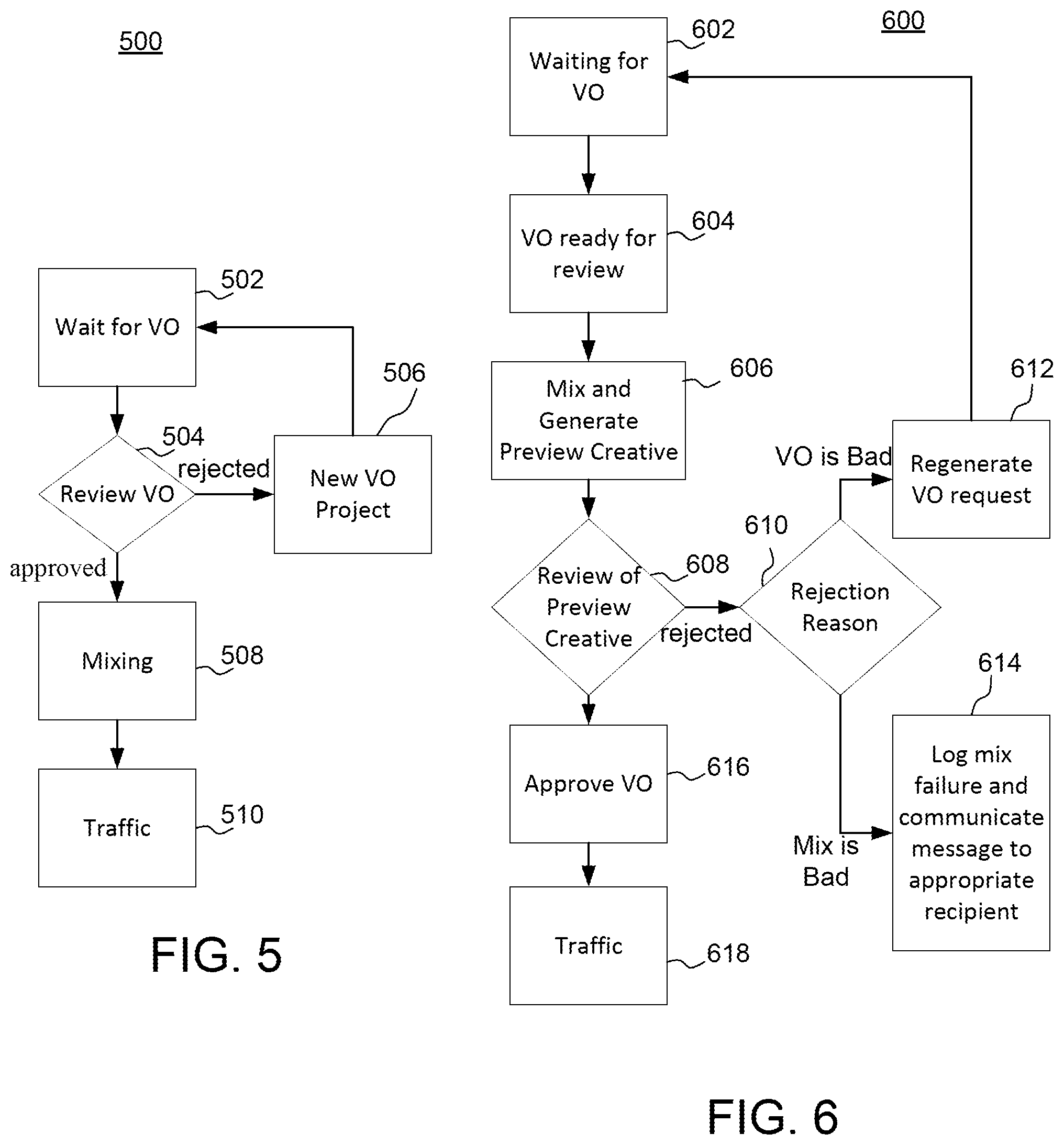 In the example user interface depicted in The creative that is generated is based on the type of campaign objective that is selected via the campaign objective (“ad objective”) section 304. Graphical user interface 300A also includes an ad name section 306. Ad name section 306 provides fields that can be used to receive ad name information. In an example embodiment, the above data can be stored in activity/demographics database 120 ( Optionally, the budget and schedule section 314 of graphical user interface 300B includes a payment method, or link or portal to effect payment. Optionally, an input data summary display summary window 316 is provided. In an example embodiment, the input data summary display summary window 316 displays a summary of the locations of targeted listeners (e.g., by country, region, state and/or designated market area (DMA)), as well as age range, gender, and/or platform. Also included in the summary information associated with the cost of the advertisements, active date range and the like. The audio creative section 318 and display creative section 320 are used to render fields related to desired media content components of a creative. In an example embodiment audio creative section 318 of the graphical user interface 300C provides a mechanism for uploading one or more audio files, image files and/or video files. For example, a desired audio creative can include an uploaded audio file. In some embodiments the audio creative section can include an option to automatically select an audio file. An example implementation of an automated search for ad background music is described below in connection with Voiceover input data enables an operator the ability to write a script to be used as a voiceover. Voiceover title section 324 provides an input field that receives a title of the voiceover. Script section 326 provides script input fields that are used to obtain a script to be read by a voiceover mechanism. The voiceover mechanism can be a technological voiceover mechanism such as a text to speech audio mechanism. In some embodiments, the input that is received by script section 326 are communicated over a network to another system that presents the script to a voiceover actor who reads the script according to the parameters input through the user interfaces described in connection with In some embodiments the audio creative section can include an option to automatically select a voiceover file. An example implementation of an automated search for ad background music is described below in connection with In other embodiments, these media content components operate as seed components that creative development platform 200 uses to select other similar or otherwise more appropriate components to be included in the creative that is generated. In other embodiments, these media content components are images, audio or video content that correspond to the artist, event, band, or the like, that can be used to provide signals sufficient for creative development platform 200 to generate a creative. For example, if an image of an artist is uploaded, creative development platform 200 can be used to search external systems 114 for any information about the artist such as the dates of future concerts. In turn, creative development platform 200 can perform natural language processing and execute natural language understanding algorithms to determine other signals that can be used to automatically generate a creative. Such media content can be stored, for example in media object store 116 ( In block 404, a determination is made as to the type of creative that should be generated: e.g., an audio, video or text creative. In the following example, an audio-based creative is generated. This determination can be made, for example, based on the playback capabilities particular client devices 106 that will receive the creative. For example a vehicle appliance may only receive audio, whereas a mobile phone can receive audio and visual content. In block 406 a first media object (e.g., in the form of a media file) or a preexisting media object is obtained and uploaded through interface 202. In one embodiment, a determination is made as to whether the first media object for the creative should be generated based on a pre-existing media object described above (also referred to as a first preexisting media object) or whether a different media object (also referred to as a first new media object) should be generated. The first media object can be obtained automatically based on predefined criteria, by comparing its metadata to one or more signals received through input interface 202 and selecting the best match. Now known or future developed mechanisms for selecting the best match can be used. In turn, in block 408, the first media object is edited, based on, for example, specific targeting and scheduling criteria. Depending on the target device, additional text can be inserted. For example if a device can receive feedback through sensors (e.g., accelerometer, microphone, and the like), then the script may be edited to receive a response from the device. In some embodiments, depending on the action taken, the script can dynamically change. It should be understood that, as used herein, a script for a voiceover can be composed of several script elements. A determination is made in block 410 as to whether an additional media object should be overlaid on top of the media content in the first media object. If so, in block 412, an additional media object is obtained. Particularly, in block 412, a determination is made as to whether the additional media object should be a preexisting media object (also referred to as an additional preexisting media object) or a different media object (also referred to as an additional new media object). In one example use case, the first (preexisting or new) media object is in the form of an audio file and the additional (preexisting or new) media object is the form o