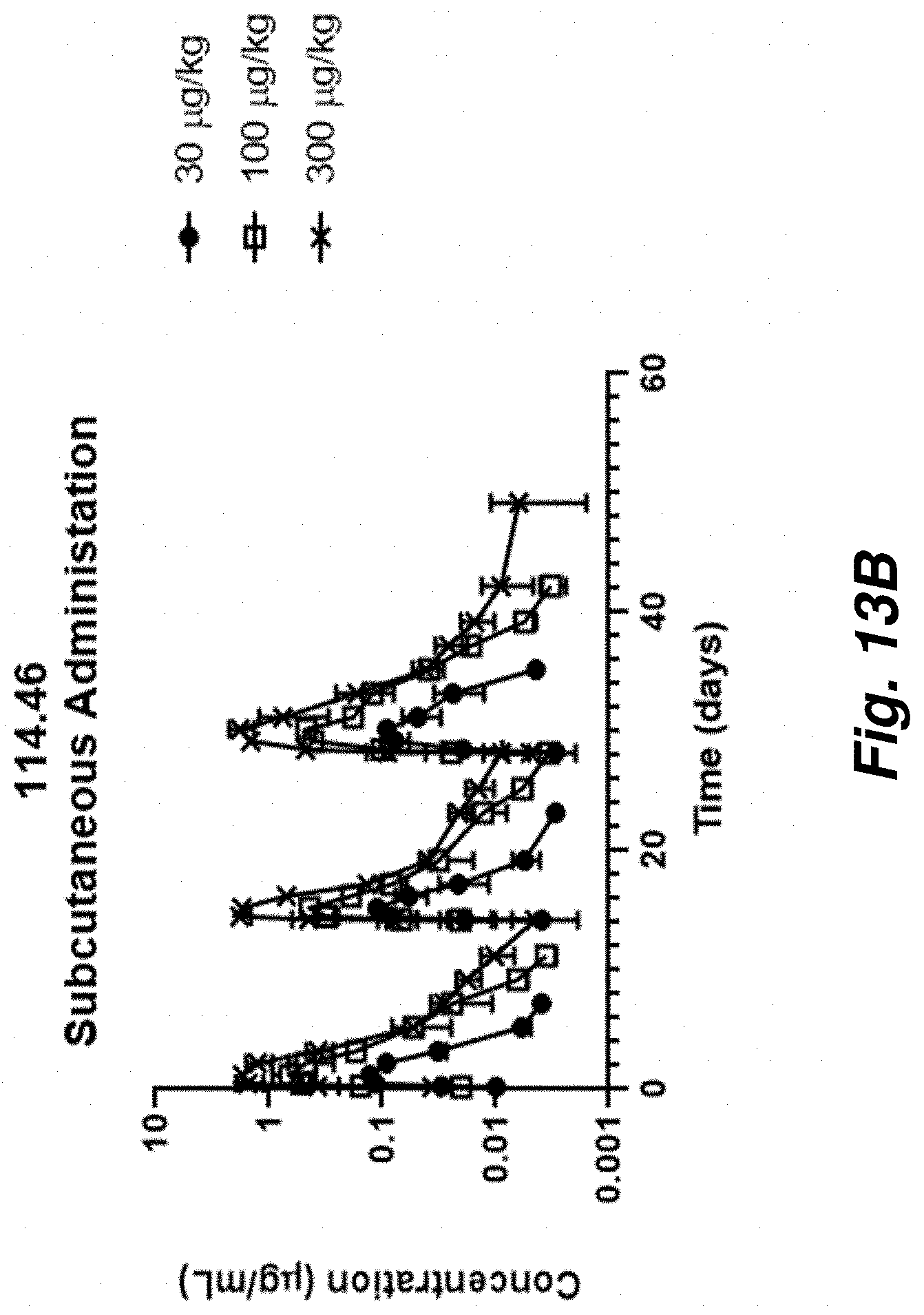 Repeat Dose PK Values for Fc-IL-2v Heterodimers Following Repeat Subcutaneous Administrations to Cynomolgus Macaques Heterodimer Dose Cmax0-14 d AUC0-14 d AUC28-42 d Mean name (μg/kg) (μg/mL) (μg*day/mL) (μg*day/mL) AR ADA 107.46 30 0.11 ± 0.03 0.31 ± 0.03 0.05* 0.16 3/3 100 0.41 ± 0.01 1.11 ± 0.18 0.92 ± 0.025 0.83 0/3 300 1.61 ± 0.18 3.78 ± 0.30 2.69 ± 0.07 0.71 1/3 114.46 30 0.12 ± 0.02 0.26 ± 0.03 0.16 ± 0.01 0.60 3/3 100 0.68 ± 0.03 1.64 ± 0.60 0.94 ± 0.06 0.57 1/3 300 1.81 ± 0.19 4.27 ± 0.29 3.57 ± 1.12 0.83 1/3 SD = Standard Deviation; AR = Accumulation Ratio; *Single animal data due to ADA positive based on an aberrant decline in PK and confirmed by ADA bridging assay Example 19