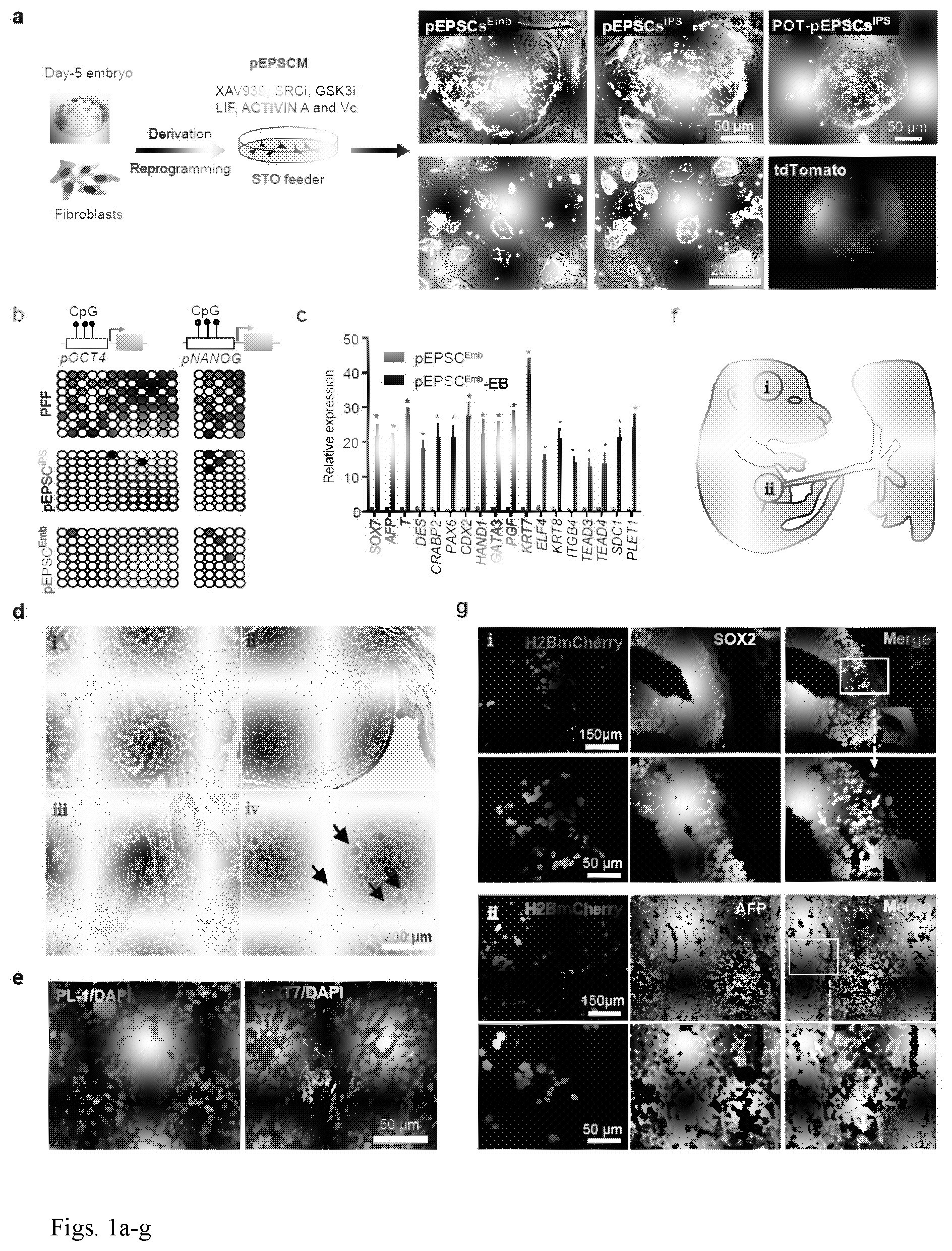 482.5 ml DMEM/F-12 (Gibco, Cat. No. 21331-020), 2.5 ml N2 supplement (Thermo Fisher Scientific, Cat. No. 17502048), 5 ml B27 supplement (Thermo Fisher Scientific, Cat. No. 17504044), 5 ml 1× Glutamine Penicillin-Streptomycin (Thermo Fisher Scientific, Cat. No. 11140-050), 5 ml 1×NEAA (Thermo Fisher Scientific, Cat. No. 10378-016), 110 μM 2-mercaptoethanol (Sigma, Cat. No. M6250), 0.2 μM CHIR99021(GSK3i, TOCRIS, Cat. No. 4423), 0.3 μM WH-4-023 (SRC inhibitor, TOCRIS, Cat. No. 5413), 2.5 μM XAV939 (Sigma, Cat. No. X3004) or 2.0 μM IWR-1 (TOCRIS, Cat. No. 3532), 50 μg/ml Vitamin C (Sigma, Cat. No. 49752-100 G), 10 ng/ml LIF (Stem Cell Institute, University of Cambridge. SCI), 20 ng/ml ACTIVIN (SCI), 1 ml ITS-X 200× (thermos, 51500056) and 0.3% FBS (Gibco, Cat. No. 10270). 27. A 500 ml human EPSC media, comprising: