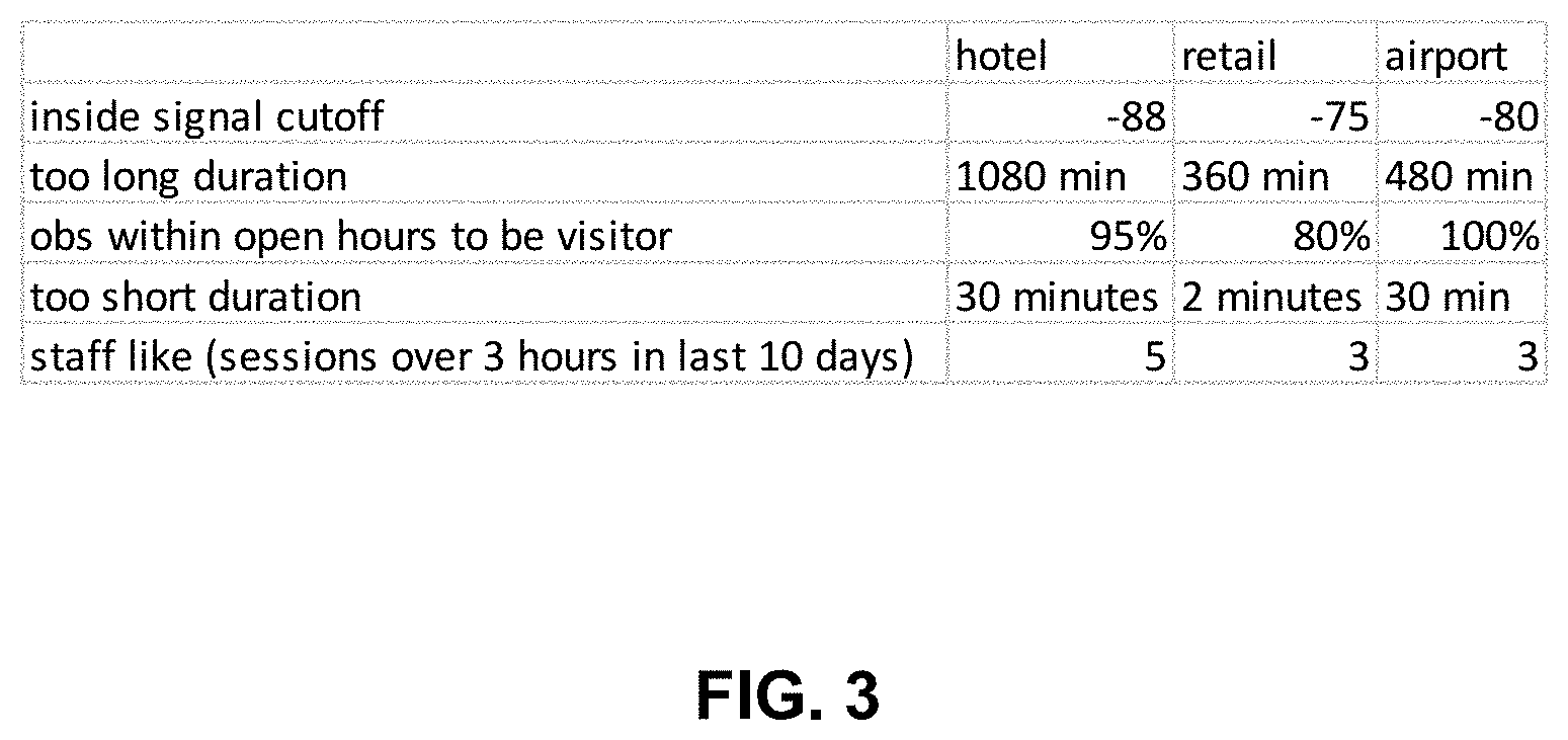 5. In some embodiments, results of the analysis are stored in RedShift (e.g., Redshift store 236 of platform 170), and summaries to be accessed via API or the Web are stored in MySQL (the API db) 6. Clients can supply data such as Sales/Location Data (e.g., sales and door counter data) via mechanisms such as ftp or email. Door Counter Data can also be supplied via ftp or email. Suggestions can be provided for formats for the data which is transferred via sftp or email, (e.g., CSV, XLS, etc.). As various types of data is consumed (e.g., POS, sales, and door counter data), disparate data formats are supported, and custom parsers can be written to ingest the data. 7. Data is First Ingested into MySQL (e.g., using ingestors 206-210 of 8. Then into RedShift (e.g., using Redshift store 236 of 9. Then into an API DATABASE 10. These time series (e.g. total sales per day vs time or traffic count (from door counters)) are then displayed in the dashboard widget 11. Once customer data (traffic count/sales data) has been uploaded by the customer and then ingested into databases, the traffic count and sales widgets are made available to the users of the services of a platform such as platform 170 (i.e. they are able to add them dashboard). The following are four example ways of ingesting POS, door counter, payroll hour, and beacon data, usable in a variety of embodiments: 1. Load via FTP: An FTP server is used to make accounts for each client (of a platform such as platform 170) that wishes to upload via FTP. The platform clients send their RSA key to gain access to their user-restricted subdirectory where they can place files. A cronjob on the platform checks for new files hourly and copies them into the S3 bucket for customer/client uploads. A subsequent cronjob on a different server is used to check that S3 bucket for new files. It then looks each new file and checks the file path and name against regular expression patterns to determine if there is a load query for that file from that customer, and if so it runs the load query to insert or update the data into our MySQL database. 2. Load via email: An email account is provided by a platform such as platform 170 and the platforms shown in 3. REST APIs: Where supported (e.g., Square, Vend, and Lightspeed), API integrations with POS vendors are supported. Cronjobs are executed that pull from their REST API for all clients for which the platform has tokens, JSON responses are manipulated into CSVs, and loaded into MySQL. In some embodiments, obtaining of data via REST APIs is run on a cron schedule. 4. Dashboard: Clients can upload their metrics via a dashboard interface. For example, an Excel template can be provided for download. Customer representatives can then can paste their data in in a pre-specified format and upload that file. If the file uploaded is formatted validly, then the file will be immediately uploaded to MySQL, and instantly available for view in the dashboard. Additional information and embodiments are provided in Mining Data and Segmenting Visit Frequency With an automated store trainer, an in and out classifier can be trained for zones (as described above). The in and out classifier is configured to classify whether a device is inside or outside of a zone. In some embodiments, to make the training require as little supervision as possible, extra compute cycles and redundancy are built in. For example, training 5 weeks of data may require approximately ¾ to 1 day per zone. This time can be shortened, but accuracy may suffer, as applicable. 1 Adding Dwell to Sales Analysis One question that can be addressed using the techniques described herein is whether or not a measurement of dwell (e.g., duration, or time spent in a space) will add color to a store's sales data. Across several zones, the addition of dwell information can be used to improve the ability to predict sales data, as compared to using traffic counts alone. One way this can be seen is via a metric called “number of visitor minutes.” This metric is the product of the day's visitor count and the median visit duration, and represents the number of useful minutes (or opportunities for sale) a zone had on a given day. A comparison with external traffic counts can also be made (e.g., external to a platform such as platform 170). 2 Visit Recency with Updating In various embodiments, the population's repeat visit rate can be extracted and how that rate changes with time tracked. Seasonal trends can be determined from this data, which has a good signal to noise ratio. It is possible that absolute numbers associated with recency can be inflated by the assumption of a fixed visit rate, i.e. a person's visit rate does not change with time or with each visit. This may be problematic because when customers stop coming to the store, they can potentially be interpreted as a loyal customer with an extremely long inter-visit period. In some embodiments, a frequency updater is added to the model (an example model is provided in W. W. Moe and P. S. Fader, Journal of Interactive Marketing 18, 5 (2004), ISSN 1520-6653, URL). The frequency updater is a parameter which accounts for visitor variability with experience and time. In some embodiments, the repeat rate of each visitor is multiplied by a number chosen from a gamma distribution (2 free parameters): Where ci,jis the multiplier that updates visit rate upon each repeat visit and h is the gamma distribution that is selected c from for the ithcustomer. The aggregate model includes four free parameters, two to decide the initial repeat visit rate for each member of the population, and two to describe how that visit rate changes after each visit. By choosing the parameters with the highest likelihood, the attrition rate of repeat customers can be estimated. Results for an example 6 month scan of ACME Store data can be seen in Mining Census Data In some embodiments, a platform such as platform 170 can be used to perform geo fencing of a