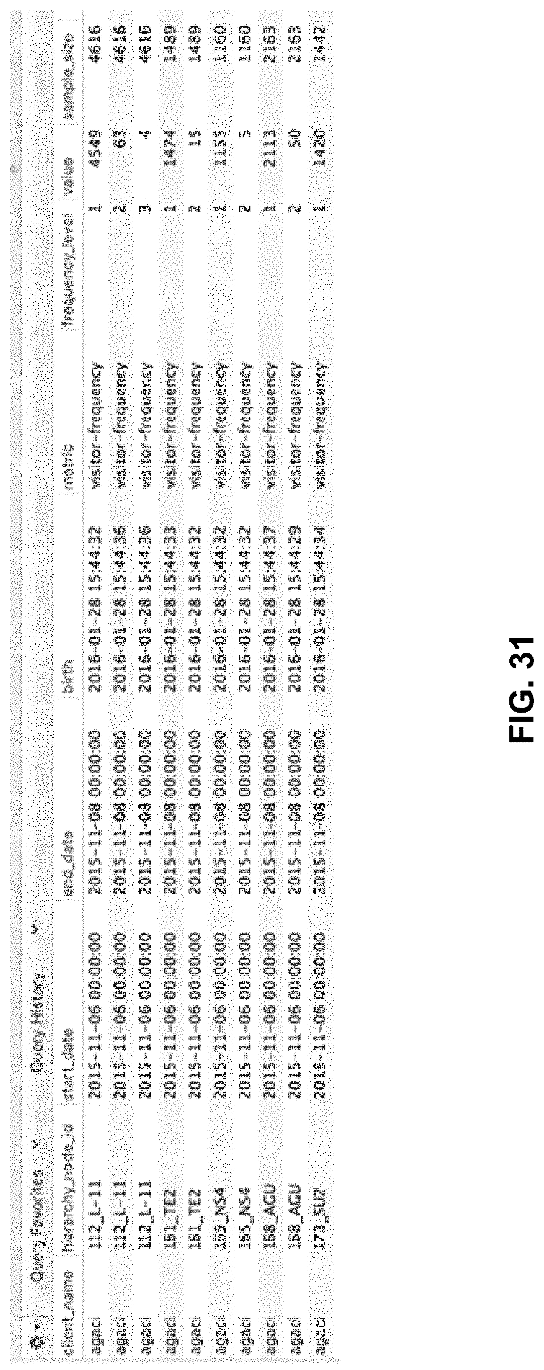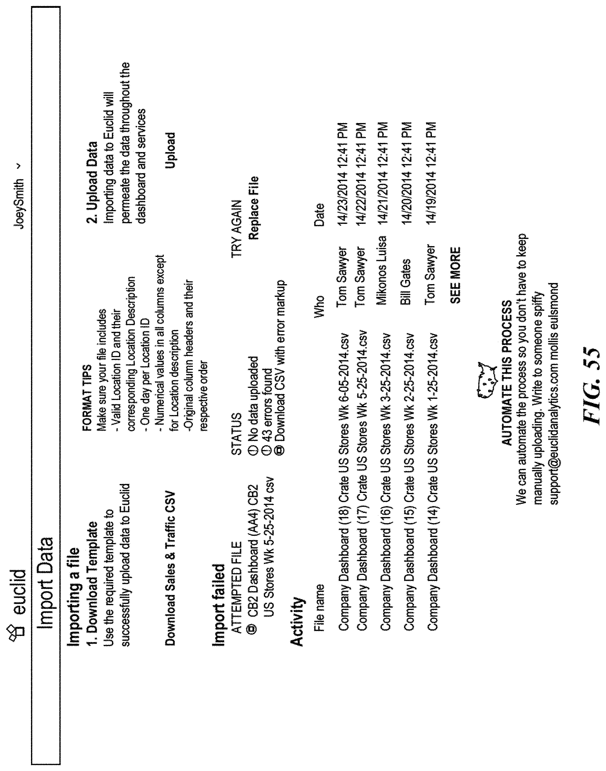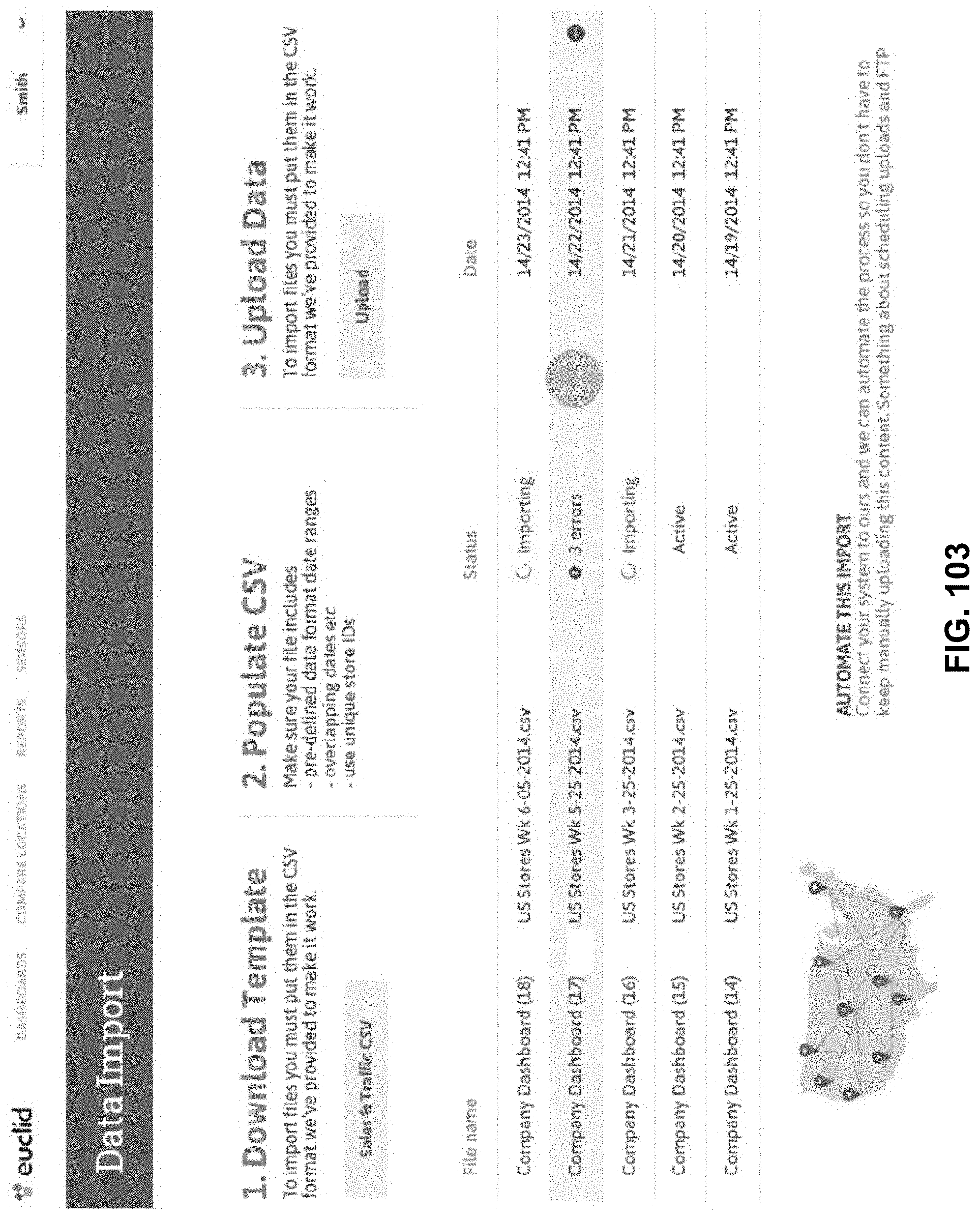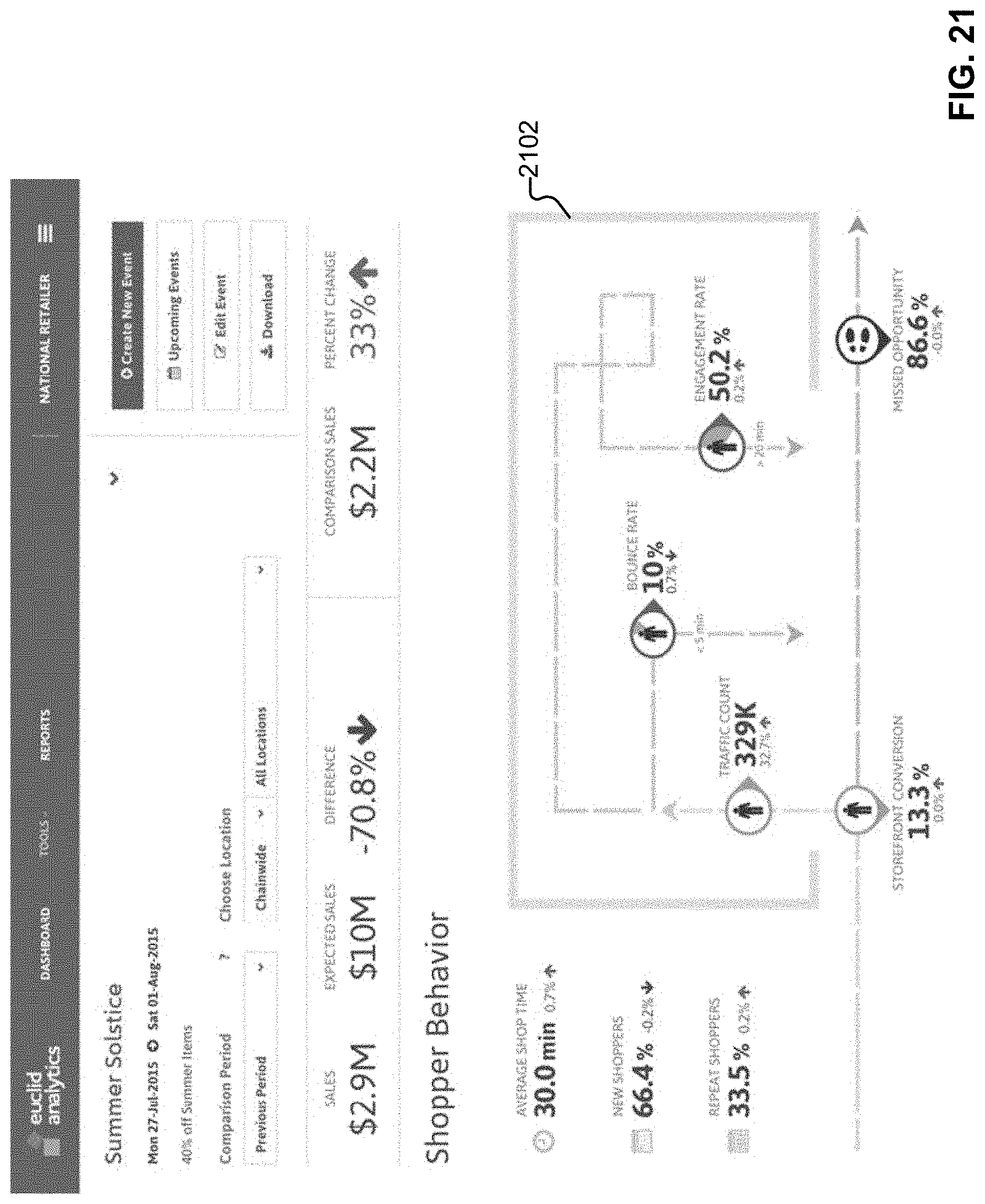 In various embodiments, the interface provided to a user of platform 170 is configurable by that user. For example, a user can indicate which widgets should be presented to the user in a dashboard view. In the interface shown in Events Pipeline Wrapper Events pipeline wrapper 240 (eventsPipelineWrapper.py) is a Python script that calculates events-based metrics in various embodiments. In particular, events pipeline wrapper 240 outputs the following: (1) event frequency; (2) revisitation; and (3) overlap. In various embodiments, an RDS table called “d4_event_frequency” (keyed by customer, zone, an event identifier, and start/end times) is includes the following fields: Sample data from the “d4_event_frequency” table is shown in Sales and Traffic Data Analysis The services provided by traffic insight platform 170 can be used, for example, to assist brick and mortar retail become more intelligent and improve data-driven decisions for every location. Described herein is an Import Data feature (see Getting Started Using the techniques described herein, sales and traffic data can be viewed next to visitor activity for all locations in Customizable Dashboards and Custom Reports. In some embodiments, entities (e.g., business organizations) using the services of platform 170 can leverage flexible reporting by performing the following three steps: