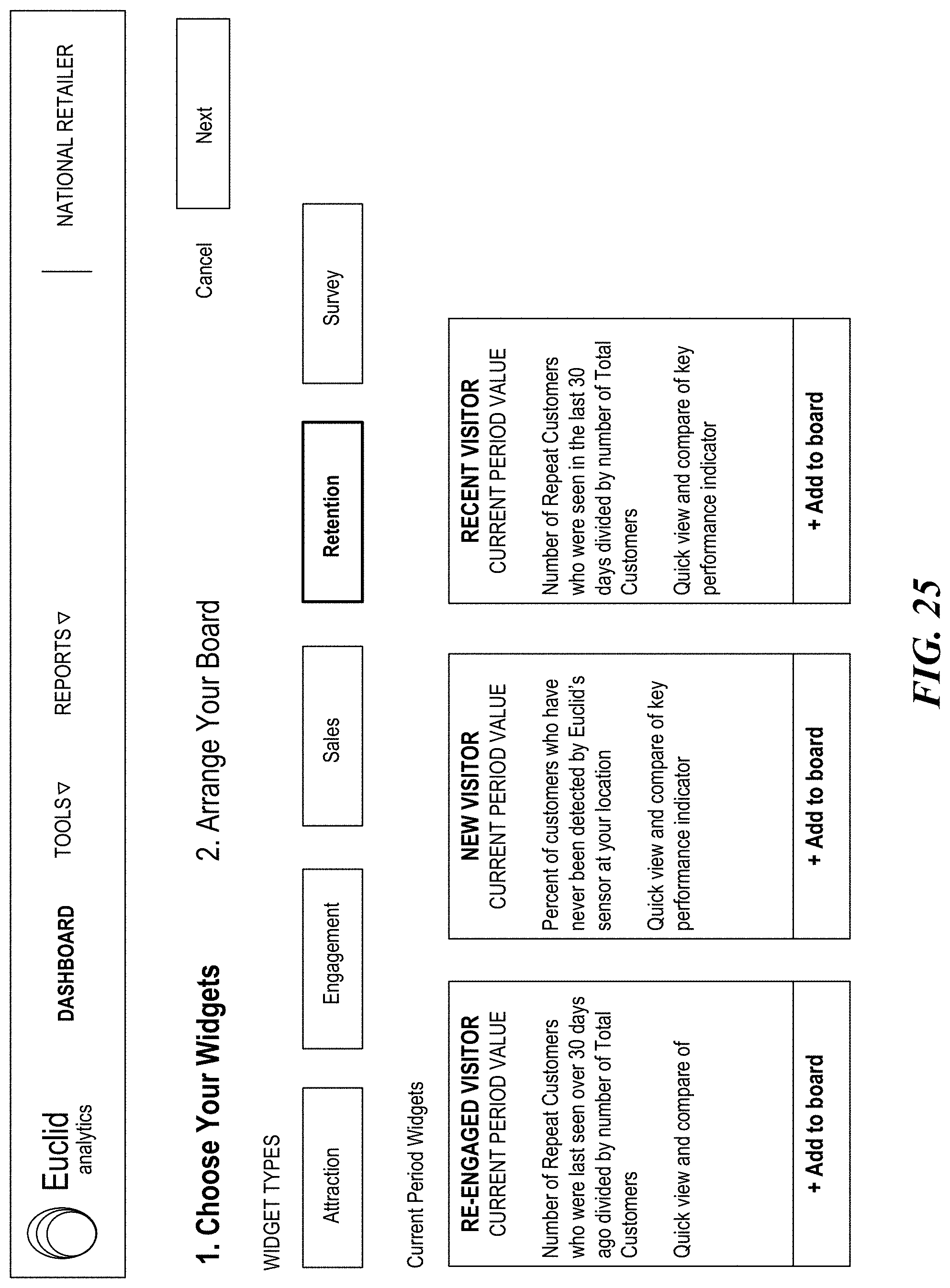 A user of embodiments of the platform described herein has the ability to customize their dashboard. They click the edit button, and then can choose to add and remove widgets. Once customer data (traffic count/sales data) has been uploaded by the customer and then ingested into databases associated with platform 170, the traffic count and sales widgets are made available to them (i.e. they are able to add them dashboard) See Example Data Upload Referring to 1. Wireless Access Points in a client's environment passively receive wireless connection requests from mobile devices within range of the Access Points. The data is then provided to a platform such as platform 170, as described above, or the systems shown in 2. Data Ingestion—The data is sent to a parser (e.g., parser included in an ingestor such as ingestors 206-210, as described above) that is specific to the client and to the hardware manufacturer {Cisco, Meraki, Xirrus, etc}. In some embodiments, the parser is configured to de-identify a mobile device's MAC address and normalize this data in accordance with a canonical format, as described above. 3. Normalized, de-identified data is stored in S3. 4. Example Analysis From the normalized data, nightly jobs are performed that calculate various KPIs such as: