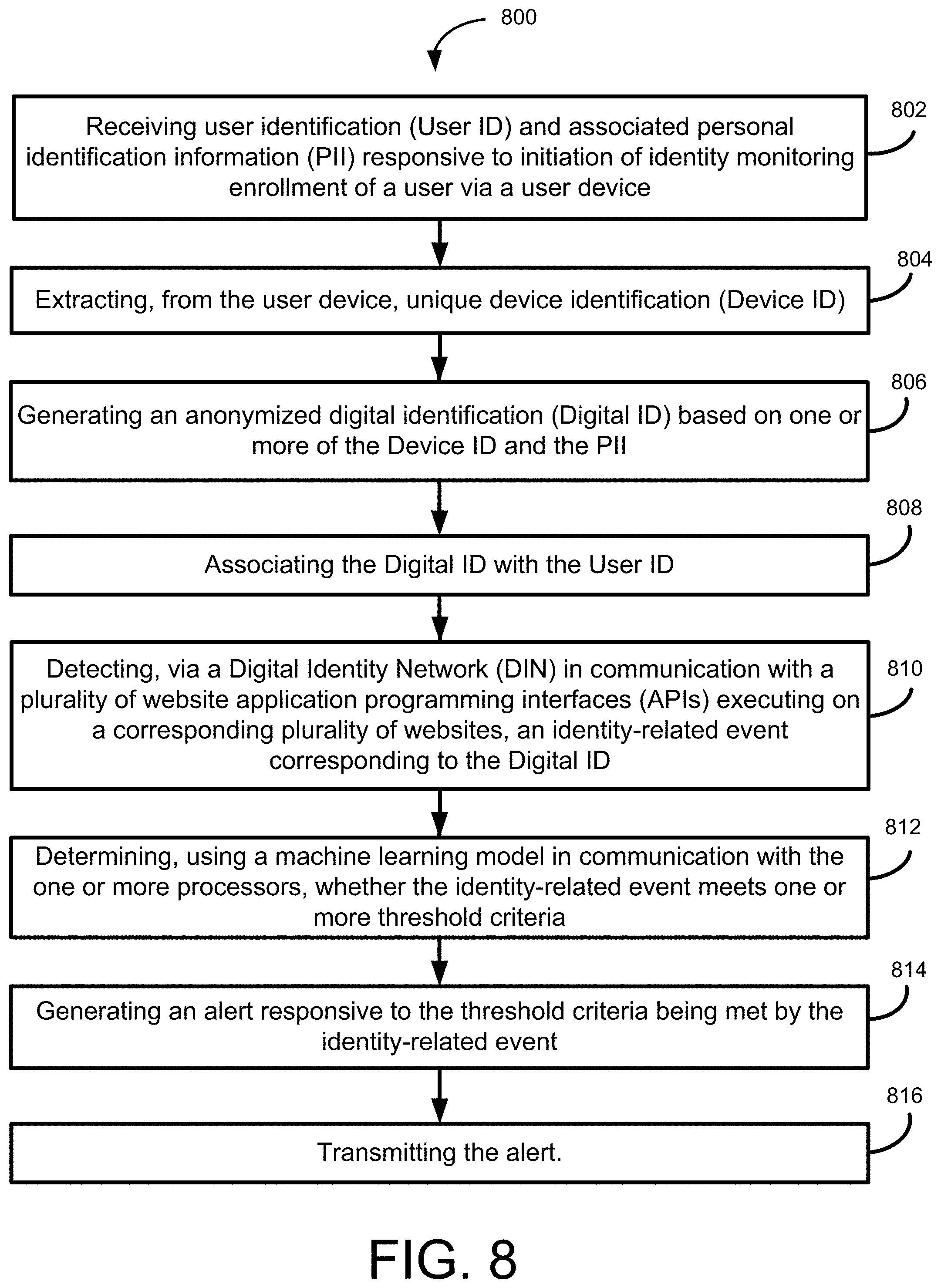 receiving user identification (User ID) and associated personal identification information (PII) responsive to initiation of identity monitoring enrollment of a user via a user device; extracting, from the user device, unique device identification (Device ID); generating an anonymized digital identification (Digital ID) based on one or more of the Device ID and the PII; associating the Digital ID with the User ID; detecting, via a Digital Identity Network (DIN) in communication with a plurality of website monitoring application programming interfaces (APIs) executing on a corresponding plurality of websites, an identity-related event corresponding to the Digital ID; determining, using a machine learning model in communication with the one or more processors, whether the identity-related event meets one or more threshold criteria; generating an alert responsive to the threshold criteria being met by the identity-related event; and transmitting the alert. 12. The method of 13. The method of 14. The method of 15. The method of 16. The method of 17. The method of 18. The method of 19. The method of 20. The method of