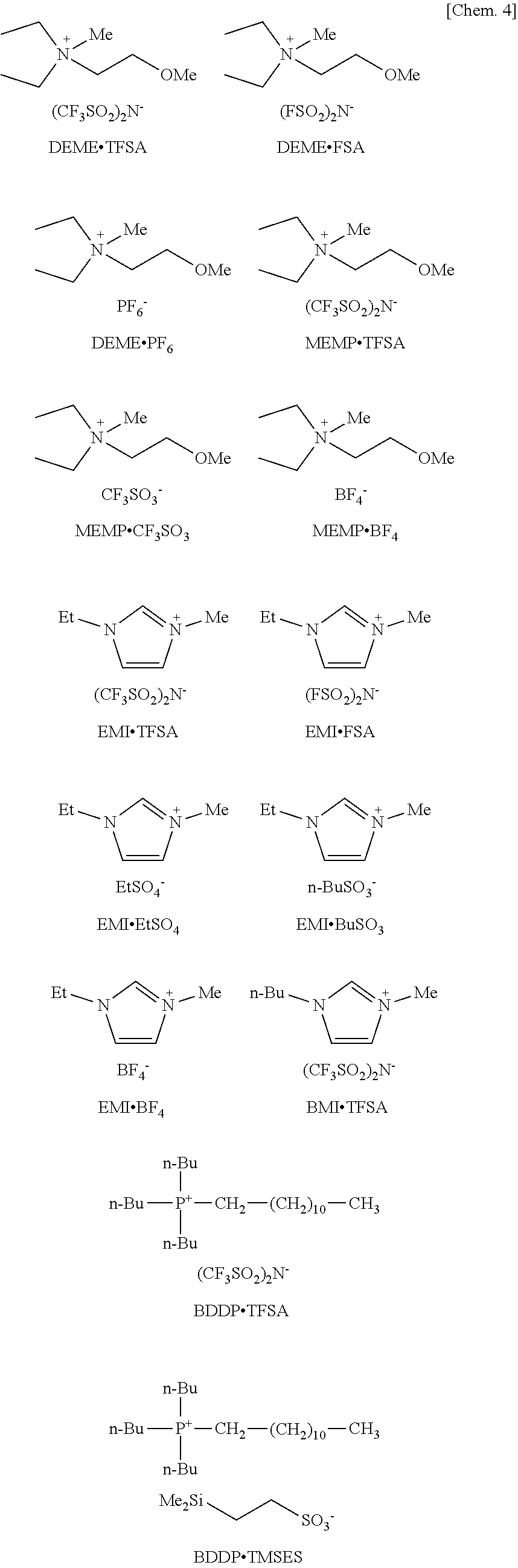 DOTITE FA-353N 150 30 DOTITE XA-910 150 30 DOTITE XA-5617 200 10 Comparative DOTITE — 0 4.110 Example 1-1 FA-353N Example 1-1 MEMP-TFSA 0.1 2.115 Example 1-2 MEMP-TFSA 0.25 2.273 Example 1-3 DEME-TFSA 0.1 1.933 Example 1-4 DEME-TFSA 0.5 2.408 Comparative DOTITE — 0 6.529 Example 2-1 XA-910 Example 2-1 DEME-TFSA 0.1 3.873 Comparative DOTITE — 0 4.193 Example 3-1 XA-5617 Example 3-1 MEMP-TFSA 0.05 7.851 Example 3-2 DEME-TFSA 0.05 3.088 Example 3-3 EMI-TFSA 0.05 2.940 Example 3-4 MEMP-TFSA 0.1 1.394 Example 3-5 EMI-FSA 0.1 7.123 Example 3-6 EMI-BuSO3 0.1 7.123 Example 3-7 EMI-TFSA 0.1 2.259 Example 3-8 EMI-BF4 0.1 2.365 Example 3-9 BDDP-BuSO3 0.1 2.597 Example 3-10 MEMP-BF4 0.1 2.639 Example 3-11 DEME-FSA 0.1 2.641 Example 3-12 EMI-EtSO4 0.1 2.647 Example 3-13 BHDP-DSS 0.1 2.718 Example 3-14 BDDP-TFSA 0.1 2.739 Example 3-15 DEME-TFSA 0.1 2.759 Example 3-16 BDDP-TMSES 0.1 2.884 Example 3-17 MEMP-CF3SO3 0.1 3.026 Example 3-18 BMI-TFSA 0.1 3.317 Example 3-19 DEME-PF6 0.1 3.652 Example 3-20 EMI-TFSA 0.2 2.659 Example 3-21 MEMP-TFSA 0.2 2.945 Example 3-22 DEME-TFSA 0.2 2.841