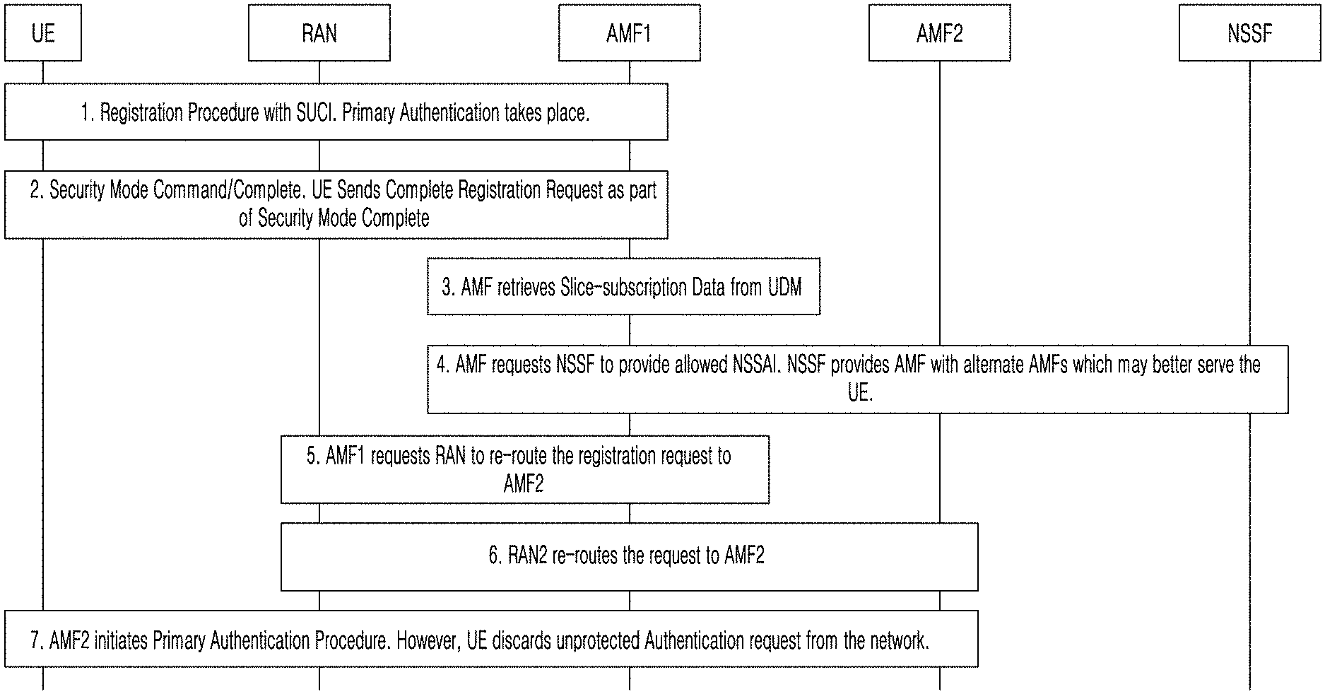 The presence of the reroute assistance information in the registration accept message may also indicate, to the UE 201, that the UE 201 needs to re-initiate a second registration procedure with the 5G network 206 using 5G-GUTI provided in the registration accept message. The UE 201, on receiving the reroute assistance information in the registration accept message, can send a registration request message, with 5G-GUTI, to the 5G network 206. The 5G RAN 207 can derive new routing information from the 5G-GUTI included in the registration request message comprising the 5G-GUTI. Based on the new routing information, the 5G RAN 207 can directly forward the new registration request message to a target AMF 209 in the target AMF set. The target AMF 209, upon receiving the registration request message including the 5G-GUTI, whose AMF pointer is set to the reserved value (or 0xFFFFFF), determines that the new registration request message is a rerouted registration request message. The target AMF 209, thereafter, proceeds with primary authentication procedure. Thus, the target AMF 209 can proceed with setting up a fresh security context. Thus, the second registration procedure is likely to be successful. At step 1, the UE initiates registration procedure to connect to the 5G network by sending a registration request message to the 5G network. In the registration request message, the UE can include SUCI. The registration request message can be received by 5G RAN of the 5G network. The 5G RAN can forward the registration request message to AMF1. When the registration request message is received by AMF1, AMF1 can trigger a primary authentication procedure. At step 2, if the primary authentication procedure of the UE with the 5G network is successful, AMF1 sends a security mode command message to the UE. The UE responds by sending a security mode complete message to the AMF1. The completion of this procedure results in generation of a security context comprising mutually agreed (between the UE and the 5G network) keys for integrity and ciphering protection of messages exchanged between the UE and the 5G network (comprising the AMF1). Here onwards, the UE accepts ciphered/protected messages from the 5G network. As part of the security mode complete message, the UE also sends complete registration request to the AMF1, which includes one or more requested S-NSSAIs (one or more services that have been requested by the UE). At step 3, on receiving the registration request, AMF1 can initiate a Nudm_SDM_Get procedure. The Nudm_SDM_Get procedure is initiated with unified data management (UDM) (not shown) in the 5G network. The Nudm_SDM_Get procedure allows AMF1 to download subscription data of the UE. The subscription data may include information about S-NSSAIs subscribed by the UE. At step 4, based on the S-NSSAIs requested by the UE (included in the registration request), S-NSSAIs subscribed by the UE (obtained from the UDM) and locally configured information, AMF1 determines that the AMF1 may not serve the requested one or more S-NSSAIs. The requested one or more S-NSSAIs (the UE had indicated that the UE intends to avail the requested one or more NSSAIs in the registration request) may be determined to be allowed NSSAIs, i.e., S-NSSAIs that the UE is eligible to avail. The determination is based on the subscription information received, from the UDM, by AMF1. Following are the sequence of events that may take place here onwards. The AMF1 (may) invoke an Nnssf_NSSelection_Get service operation to the NSSF for retrieving allowed NSSAIs. The request to the NSSF includes the S-NSSAIs requested by the UE (requested one or more NSSAIs in the registration request), the S-NSSAIs subscribed by the UE (determined based on the subscription information received from the UDM), current Tracking Area Information (TAI), and so on. The NSSF can send a response to AMF1, which includes an AMF-Set-ID, and/or a list of AMF NF-Instance-IDs, which includes the NF-Instance-ID of AMF2. The AMF2 may be able to provide the S-NSSAIs requested by the UE (requested one or more NSSAIs included by the UE in the registration request) and the S-NSSAIs subscribed by the UE. The NSSF also includes an indication in the response to AMF1, as to whether the AMF1 can allow inclusion of allowed-NSSAI in access stratum (send the allowed-NS SAI to the UE in a registration accept message). If inclusion of allowed-NSSAI in access stratum is not allowed, the NSSF sends a modified allowed-NSSAI comprising of NSSAI(s) that can be sent over the access stratum (excluding NSSAI(s) that cannot be exposed over the access stratum). Alternatively, the AMF1 may determine the above information via local configuration. At step 5, if AMF1, based on local configuration, determines that AMF1 may not be able to forward the registration request to AMF2 directly and/or may need to forward the registration request to AMF2 through the 5G RAN, AMF1 sends a registration accept message to the UE. The registration accept message includes a reroute assistance information comprising at least one of a 5G-GUTI encoded for a target AMF set comprising AMF2, an indication that the UE needs to reinitiate the register procedure with the 5G network, and optionally an indication that the UE needs to include the allowed NSSAI (as received from the NSSF in step 4) as requested NSSAI or the modified allowed-NSSAI, in access stratum, when the UE sends a new registration request to the 5G network. In an embodiment, the 5G-GUTI comprises an AMF-Set ID in GUAMI set to AMF-ID of AMF2, an AMF pointer set to a reserved value (AMF1 can obtain the reserved AMF pointer value pertaining to the AMF-Set comprising AMF2 by querying NRF), and a S-TMSI set to random number. At step 6, the UE reinitiates a registration procedure by sending a registration request to the 5G network. The registration request includes at least one of the received 5G-GUTI, and the requested NSSAI (allowed NSSAI—as received by