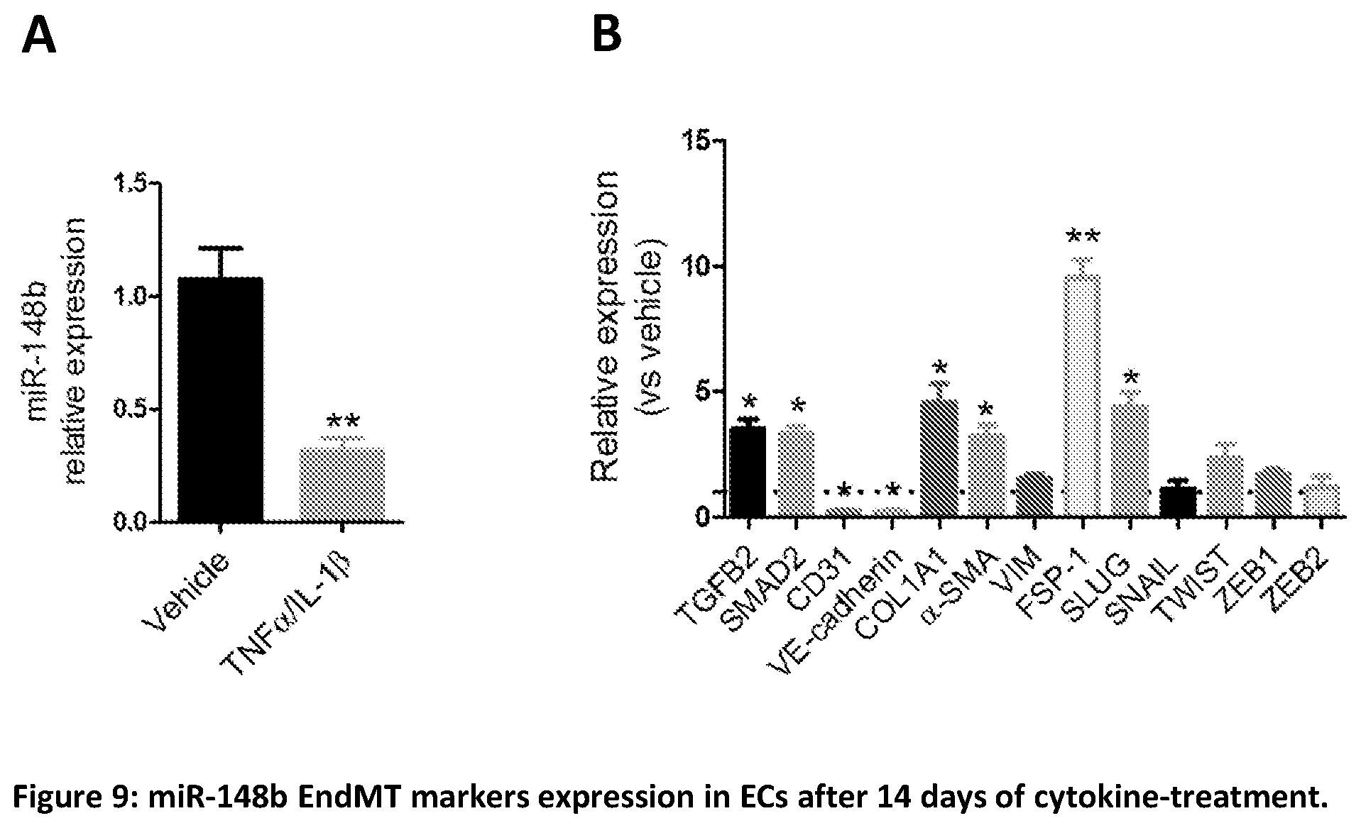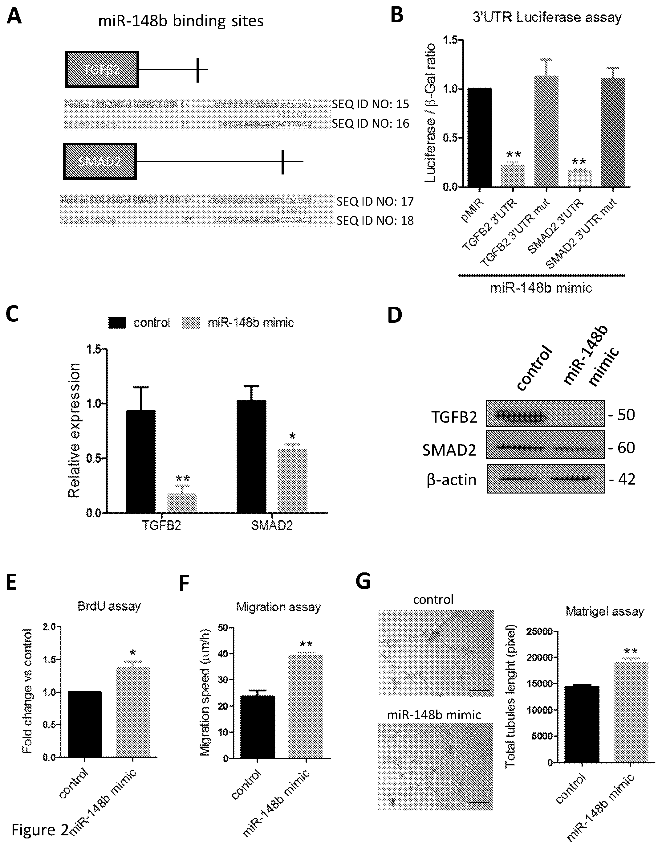 As described herein, the present inventors have demonstrated that miR-148b targets are strongly enriched for the components of TGF-β pathway. Focusing on the impact of miR-148b on TGF-β signaling, the inventors have demonstrated how this miRNA could regulate EC function and how it impacts on TGF-β to transduce intracellular signals. miR-148b together with miR-148a and miR-152 comprise the miR-148/152 family21. Aberrant expression of miR-148/152 family has been observed in tumours, but also in non-tumour diseases such as IgA nephropathy22and atherosclerotic lesions23; however, its function has not been explored in ECs.
