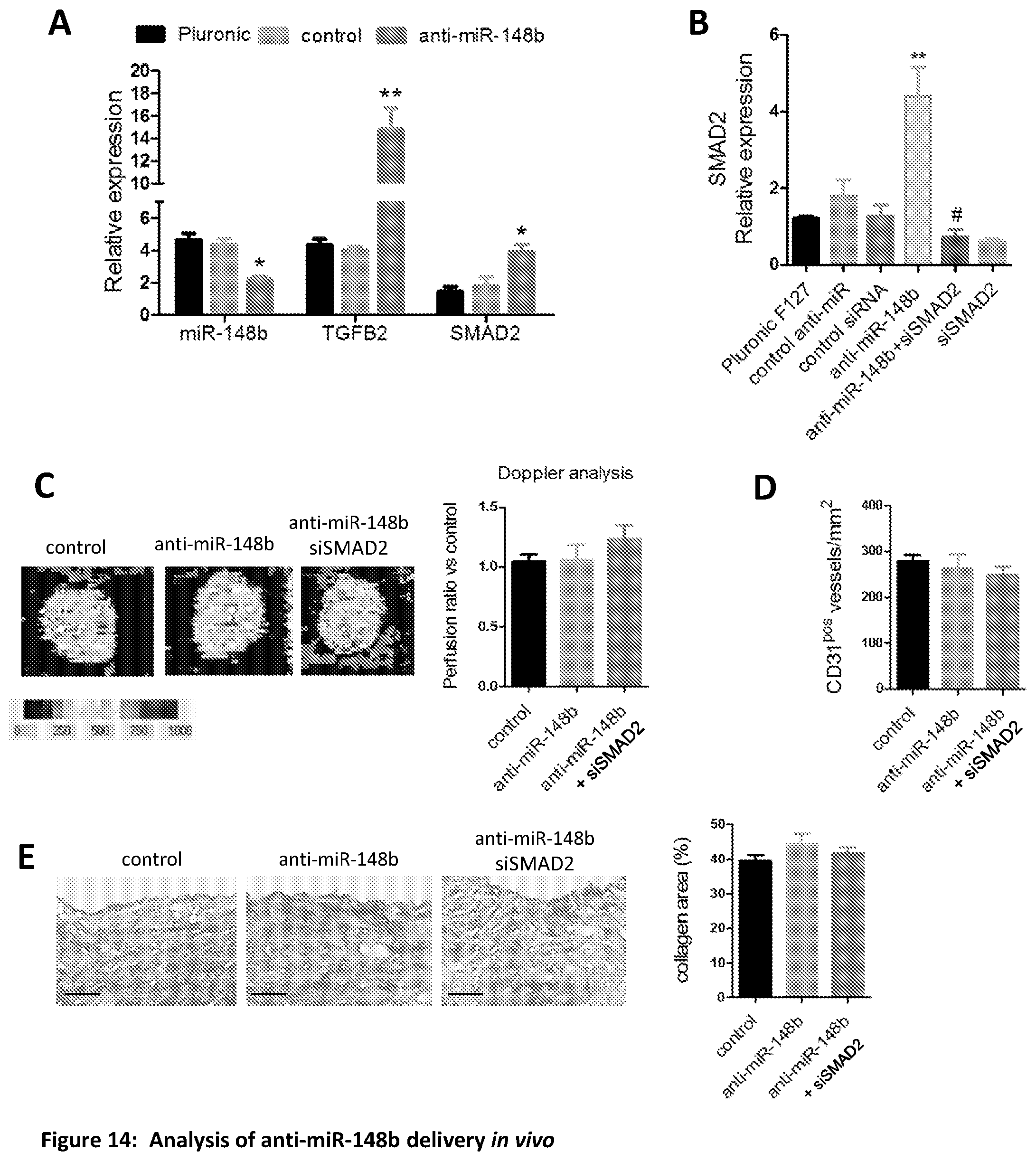 Cardiac fibrosis, in response to injury and stress, is central to a broad constellation of cardiovascular diseases. Fibrosis decreases myocardial wall compliance due to extracellular matrix (ECM) accumulation, leading to impaired systolic and diastolic function, causing arrhythmogenesis and increasing the risk of sudden cardiac death. There are two patterns of cardiac fibrosis presentation: regional fibrosis and diffuse fibrosis. Regional fibrosis mainly occurs in the healing infarcted ventricle following myocardial infarction, ultimately resulting in the formation of a collagen-based scar (Prabhu and Frangogiannis 2016, Circ Res 119(1): 91-112). On the other hand, diffuse fibrosis is associated with cardiac remodeling in the conditions of pressure and/or volume overload, metabolic disorder, or ischemic insults and is characterized by unbalanced collagen turnover and excessive diffuse collagen deposition in the interstitial spaces (Frangogiannis 2017, Clin Invest 127(5): 1600-1612). Some fibrotic factors, such as inflammatory cytokines and TGF-β are responsible for the activation of fibroblasts and the alteration of ECM. Moreover, recent studies confirmed that endothelial-to-mesenchymal transition (EndMT) contributes to the development of cardiac fibrosis (Zeisberg, Tarnavski et al. 2007, Nat Med 13(8): 952-961; Kong, Christia et al. 2014, Cell Mol Life Sci 71(4): 549-574). In this context, the delivery of miR-148b mimics in the heart after myocardial infarction would inhibit TGF-β pathway and EndMT and reduce the accumulation of collagen and myofibroblast, thus reducing impaired systolic and diastolic function.