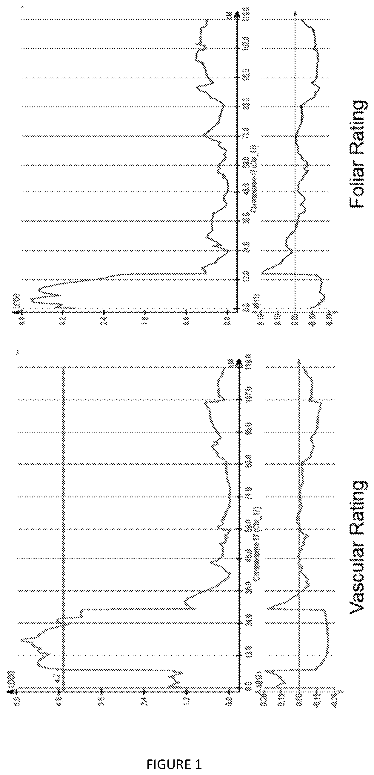 SNP markers with their resistant and susceptible genotypes in the QTL region associated with FOV-R4 resistance on Chromosome 17. Alter- Phy800 nate Source (Donor Sus- SEQ of Resist- cep- ID SNP SNP ance tible SNP Marker NO: marker SNP Position Allele) Allele DCPCP_196397_33 1 * [A/T] 34 T A i61124Gt 2 * [T/C] 51 C T i50939Gb 3 * [A/G] 51 G A DCHA25883_31 4 * [A/C] 32 C A DCTE1_391848_251 5 * [T/C] 251 C T i53466Gb 6 * [A/G] 51 A G DASCTP_18018_362 7 * [T/C] 151 C T DCMA162746_98 8 * [T/C] 99 T C i18516Gh 9 * [T/C] 101 C T i03137Gh 10 * [A/G] 101 A G DCMA138891_52 11 * [T/C] 53 T C i50988Gb 12 * [T/C] 51 T C i50070Gb 13 * [A/G] 51 G A i03154Gh 14 * [T/C] 101 T C i03150Gh 15 * [A/G] 101 A G i63438Gm 16 * [T/G] 51 T G DCTE1_227743_252 17 * [T/C] 252 C T i47328Gh 18 * [T/C] 51 C T i55398Gb 19 * [T/C] 51 C T i32350Gh 20 * [T/C] 51 C T DASCTP_54291_285 21 * [A/G] 151 G A DCTSU_32284_18 22 * [A/G] 19 G A i47762Gh 23 * [A/G] 51 G A DASCTP_54291_243 24 * [A/C] 243 C A DCHA63750_52 25 * [T/C] 53 T C DCMA52289_23 26 * [T/C] 24 T C i03179Gh 27 * [T/C] 101 T C i25864Gh 28 * [T/C] 51 T C DASCTP_54291_279 29 * [T/C] 279 T C DASCTP_54291_401 30 * [C/G] 301 G C DCTSU_99409_24 31 * [T/C] 25 C T i03177Gh 32 * [T/C] 101 C T i43569Gh 33 * [T/C] 51 C T i43581Gh 34 * [T/C] 51 C T DASCTP_54291_234 35 * [T/C] 234 C T i18518Gh 36 * [T/C] 101 C T i50560Gb 37 * [T/C] 51 T C i54400Gb 38 * [T/C] 51 C T DCTE1_223075_739 39 * [A/G] 501 A G i52902Gb 40 * [A/G] 51 G A DCMA135299_36 41 * [A/C] 37 A C i03187Gh 42 * [A/C] 101 A C i03186Gh 43 * [T/C] 101 C T DCTE1_217975_363 44 * [A/G] 363 G A DCHA204741_54 45 * [T/G] 55 T G DCHA199380_31 46 * [A/C] 32 C A DCHA115658_31 47 * [T/C] 32 C T i50588Gb 48 * [T/C] 51 C T DGBD03_2112089 49 ** [A/G] 151 G A DGBD03_2114168 50 ** [A/T] 151 T A DGBD03_2114623 51 ** [A/C] 151 C A DGBD03_2127715 52 ** [A/C] 151 C A DGBD03_2131842 53 ** [A/G] 151 G A DGBD03_2155187 54 ** [A/G] 151 G A DGBD03_2172878 55 ** [A/C] 151 C A DGBD03_2173214 56 ** [A/T] 151 T A DGBD03_2157202 57 ** [C/A] 151 A C DGBD03_2111426 58 ** [G/A] 151 A G DGBD03_2119926 59 ** [G/A] 151 A G DGBD03_2128653 60 ** [G/A] 151 A G DGBD03_2152629 61 ** [G/A] 151 A G DGBD03_2157039 62 ** [G/C] 151 C G DGBD03_2106152 63 ** [T/C] 151 C T DGBD03_2111635 64 ** [T/C] 151 C T DGBD03_2114732 65 ** [T/G] 151 G T DGBD03_2123197 66 ** [T/C] 151 C T DGBD03_2154280 67 ** [T/C] 151 C T DGBD03_2154410 68 ** [T/G] 151 G T DGBD03_2154809 69 ** [T/C] 151 C T DGBD03_2155266 70 ** [T/C] 151 C T DGBD03_2157438 71 ** [T/A] 151 A T G101PFB-001-K001 72 *** [C/T] 199 T C G101PFD-001-K001 73 *** [C/T] 201 T C G101PFE-001-K001 74 *** [T/C] 201 C T G101PFG-001-K001 75 *** [A/C] 201 C A G101PFH-001-K001 76 *** [C/A] 201 A C G101PFK-001-K001 77 *** [C/A] 201 A C G101PFN-001-K001 78 *** [G/A] 201 A G G101PFP-001-K001 79 *** [G/A] 201 A G G101PFV-001-K001 80 *** [T/G] 201 G T G101PFX-001-K001 81 *** [G/A] 201 A G G101PFY-001-K001 82 *** [C/T] 200 T C G101PG0-001-K001 83 *** [T/C] 199 C T G101PG1-001-K001 84 *** [A/T] 201 T A G101PG2-001-K001 85 *** [C/T] 201 T C G100GHM-002-K001 86 *** [A/G] 45 A G * Markers added through QTL mapping. ** Markers added through consensus mapping. *** Markers added by QTL Mining and LD Analysis Prefered SNP markers with their resistant and susceptible genotypes and physical positions in the QTL region associated with FOV-R4 resistance on Chromosome 17. Physical Position relative Resistant Alternate SEQ to G. Allele Suscep- ID barbadense SNP from tible SNP Name NO: Genome SNP Position Phy800 Allele G101PFB- 72 1150839 [C/T] 199 T C 001-K001 i03150Gh 15 1153760 [G/A] 101 A G G101PFD- 73 1260740 [C/T] 201 T C 001-K001 G101PFE- 74 1301919 [T/C] 201 C T 001-K001 G101PFG- 75 1389013 [A/C] 201 C A 001-K001 G101PFH- 76 1457396 [C/A] 201 A C 001-K001 G101PFK- 77 1542850 [C/A] 201 A C 001-K001 DCTE1_ 17 1599767 [T/C] 252 C T 227743_252 G101PFN- 78 1651281 [G/A] 201 A G 001-K001 G101PFP- 79 1654961 [G/A] 201 A G 001-K001 DGBD03_ 70 1701278 [T/C] 151 C T 2155266 DCMA52289_ 26 1839640 [A/G] 24 A G 23 G101PFV- 80 1906662 [T/G] 201 G T 001-K001 G101PFX- 81 2006681 [G/A] 201 A G 001-K001 G101PFY- 82 2051172 [C/T] 200 T C 001-K001 G101PG0- 83 2103399 [T/C] 199 C T 001-K001 i03177Gh 32 2133628 [A/G] 101 G A G101PG1- 84 2201531 [A/T] 201 T A 001-K001 G101PG2- 85 2249587 [C/T] 201 T C 001-K001 i50560Gb 37 2254713 [A/G] 51 A G G100GHM- 86 2286568 [A/G] 45 A G 002-K001 EXAMPLE 4