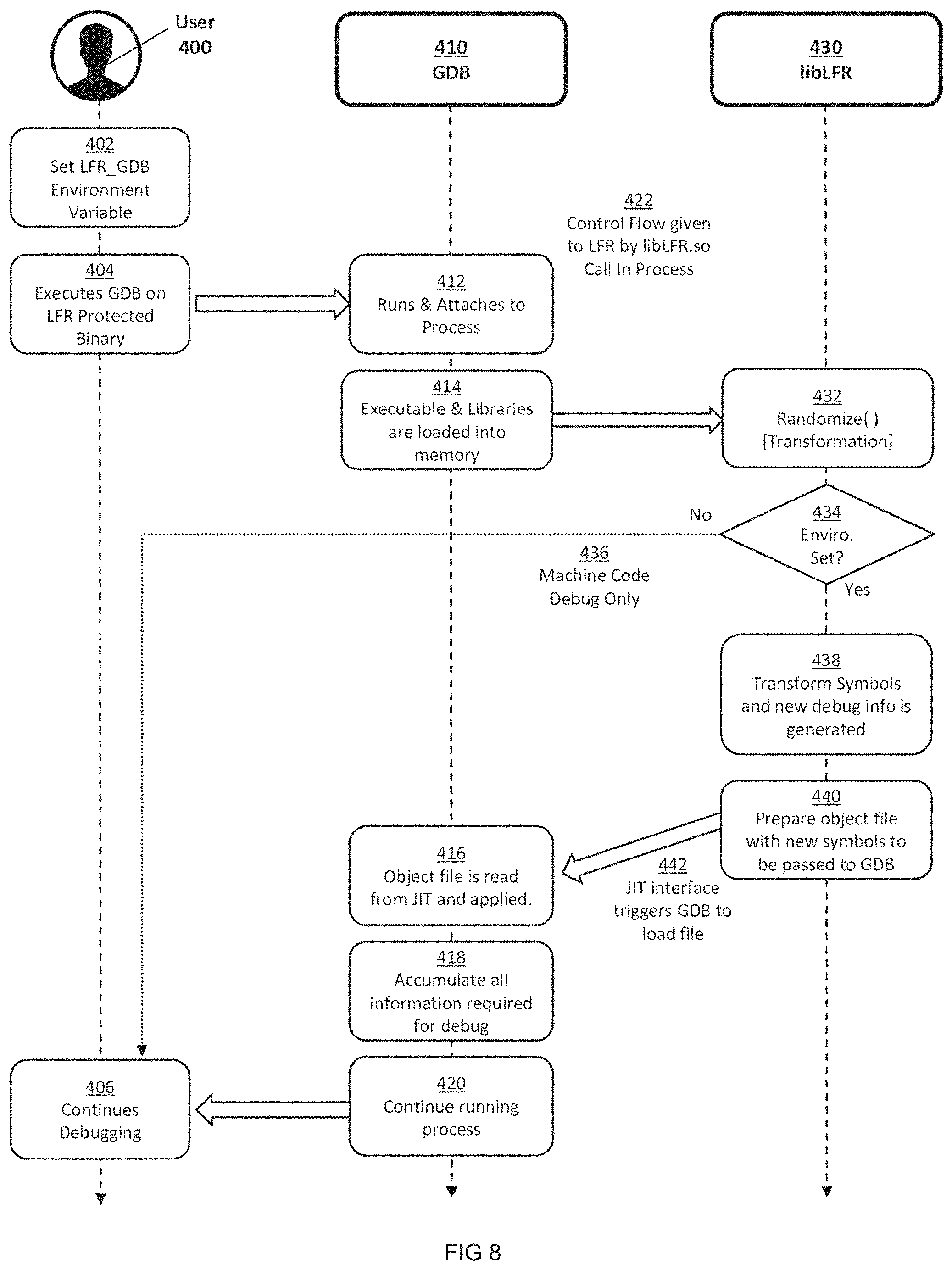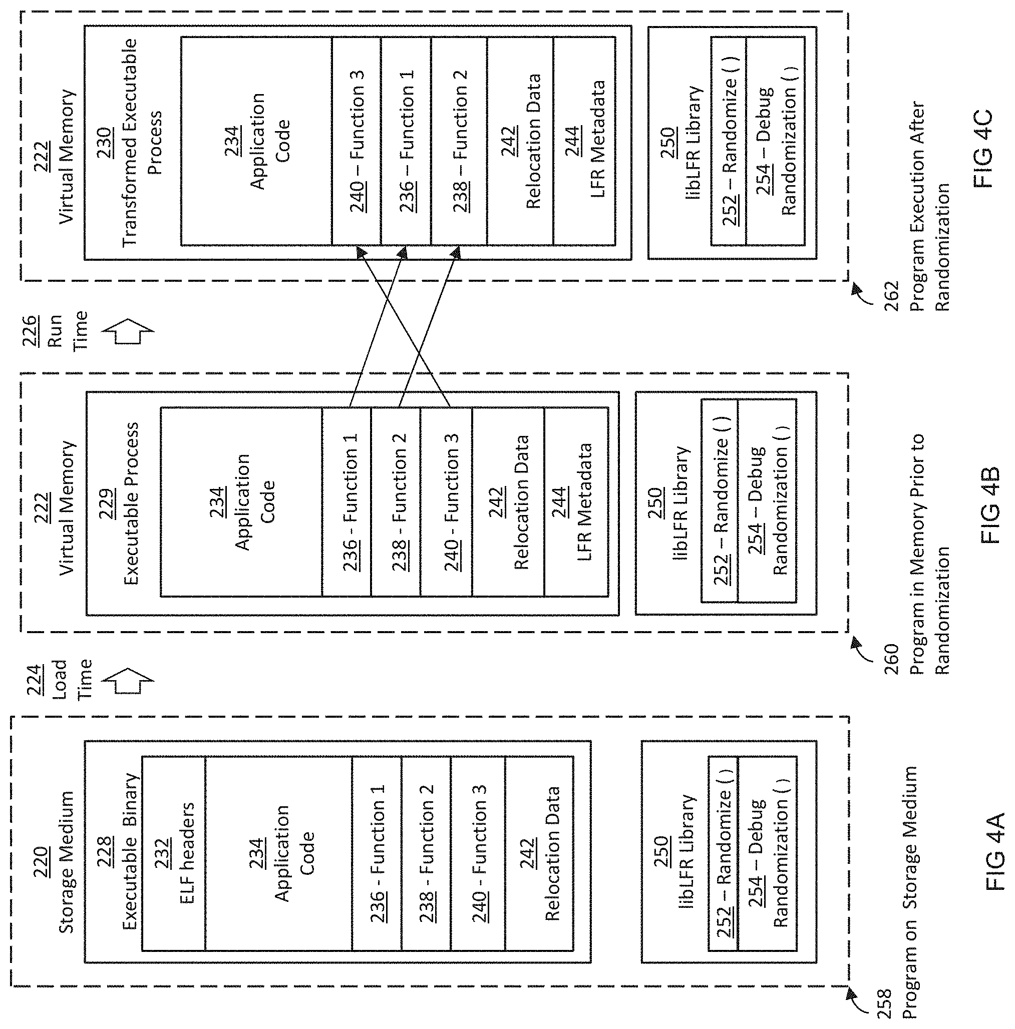establish an interactive debugging session by calling an executable code component corresponding to a packed binary file, the executable code component including machine code that corresponds to blocks of original source code, wherein the calling causes the executable code component and a function randomization library corresponding to the blocks of original source code to be loaded into the memory for execution, in response to a request for executing the executable code component, generate a randomly reorganized layout of the machine code corresponding to the blocks of the original source code in the memory based on subjecting the executable code component to a transformation defined in the function randomization library, in response to generating the randomly reorganized layout,