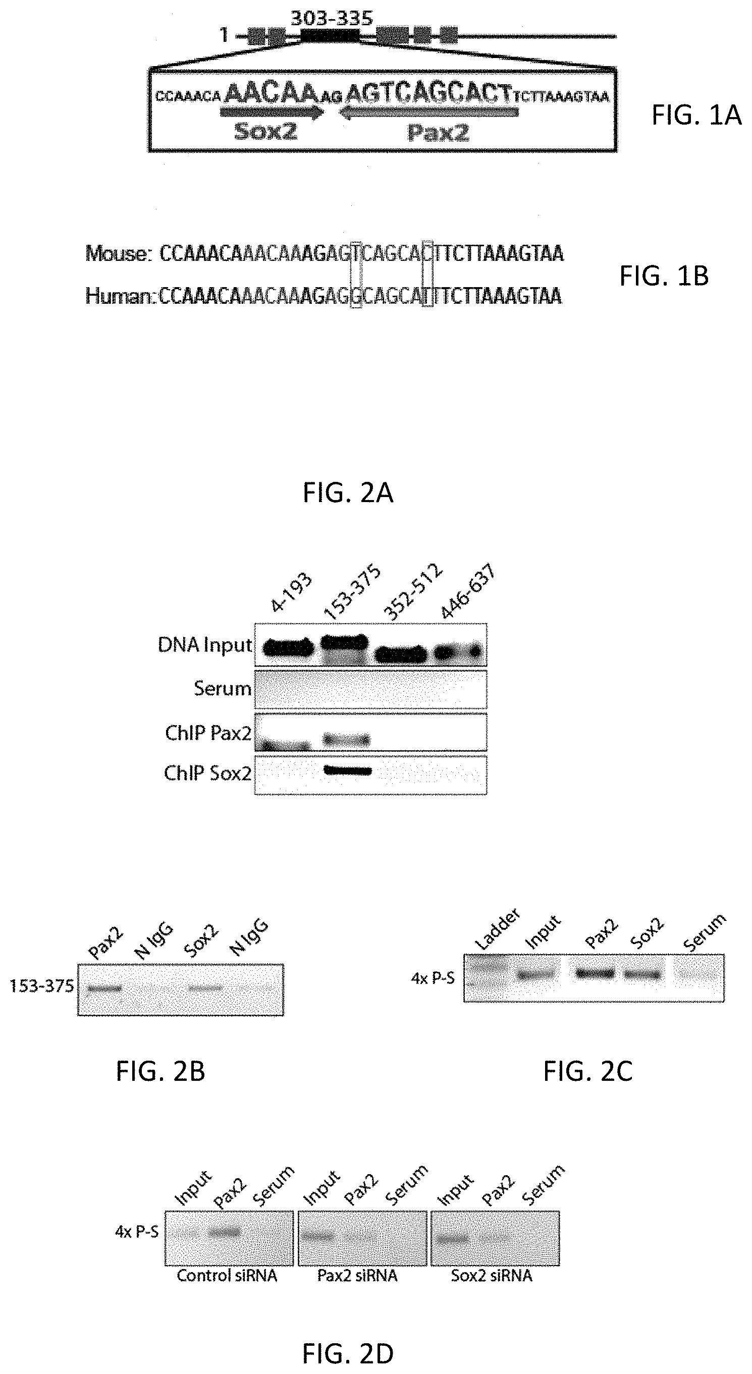After treatment with siRNA for Sox2 or Pax2, less DNA was precipitated with Pax2 antibody from HEK cells transfected with the 4×-binding site construct (FIG. 2D).