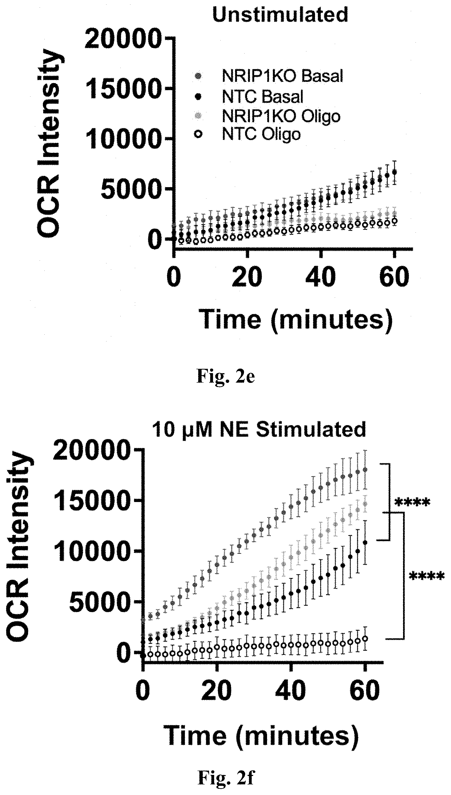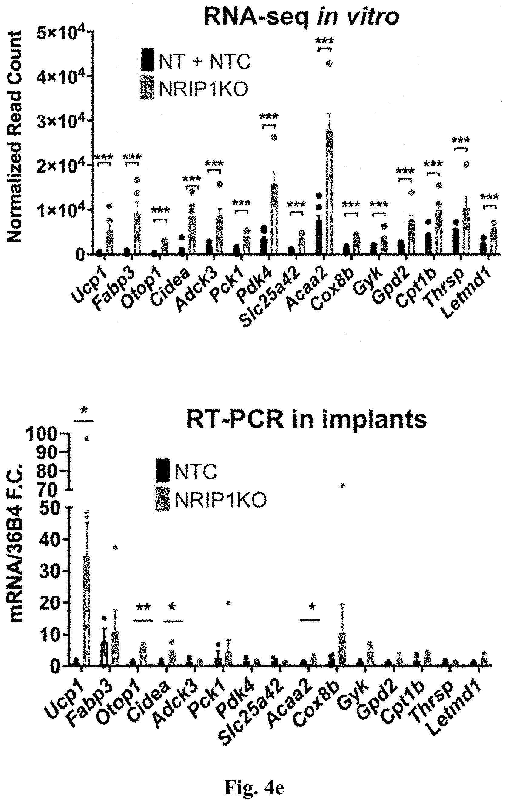 1. A composition comprising an RNA-guided nuclease (RGN) and a guide RNA (gRNA), wherein the gRNA is from 15-100 nucleotides long and comprises a sequence of at least 10 contiguous nucleotides of a target sequence within exon 4 of a nuclear receptor interacting protein 1 (Nrip1) gene. 2. The composition of nucleotides 596-3811, 596-3110, 665-3811, or 665-3110 within exon 4 of the Nrip1 gene; nucleotides 250, 300, 350, 400, 450, or 500 on the 5′ end and nucleotides 2950, 3000, 3050, 3100, or 3110 on the 3′ end within exon 4 of the Nrip1 gene; nucleotides 250, 300, 350, 400, 450, 500, or 550 on the 5′ end and nucleotides 750, 800, 850, or 100 on the 3′ end within exon 4 of the Nrip1 gene; nucleotides 2500, 2550, 2600, 2650, 2750, or 2800 on the 5′ end and nucleotides 2950, 3000, 3050, 3100, or 3110 on the 3′ end within exon 4 of the Nrip1 gene; or any of the target regions within exon 4 of the Nrip1 gene shown in Table 1, plus up to 50, 75, 100, 200, 300, 400, 500, 750, or 1000 nucleotides on either side. 3. The composition of 4. The composition of 5. The composition of 6. A method of making a population of mature adipose cells, the method comprising:
