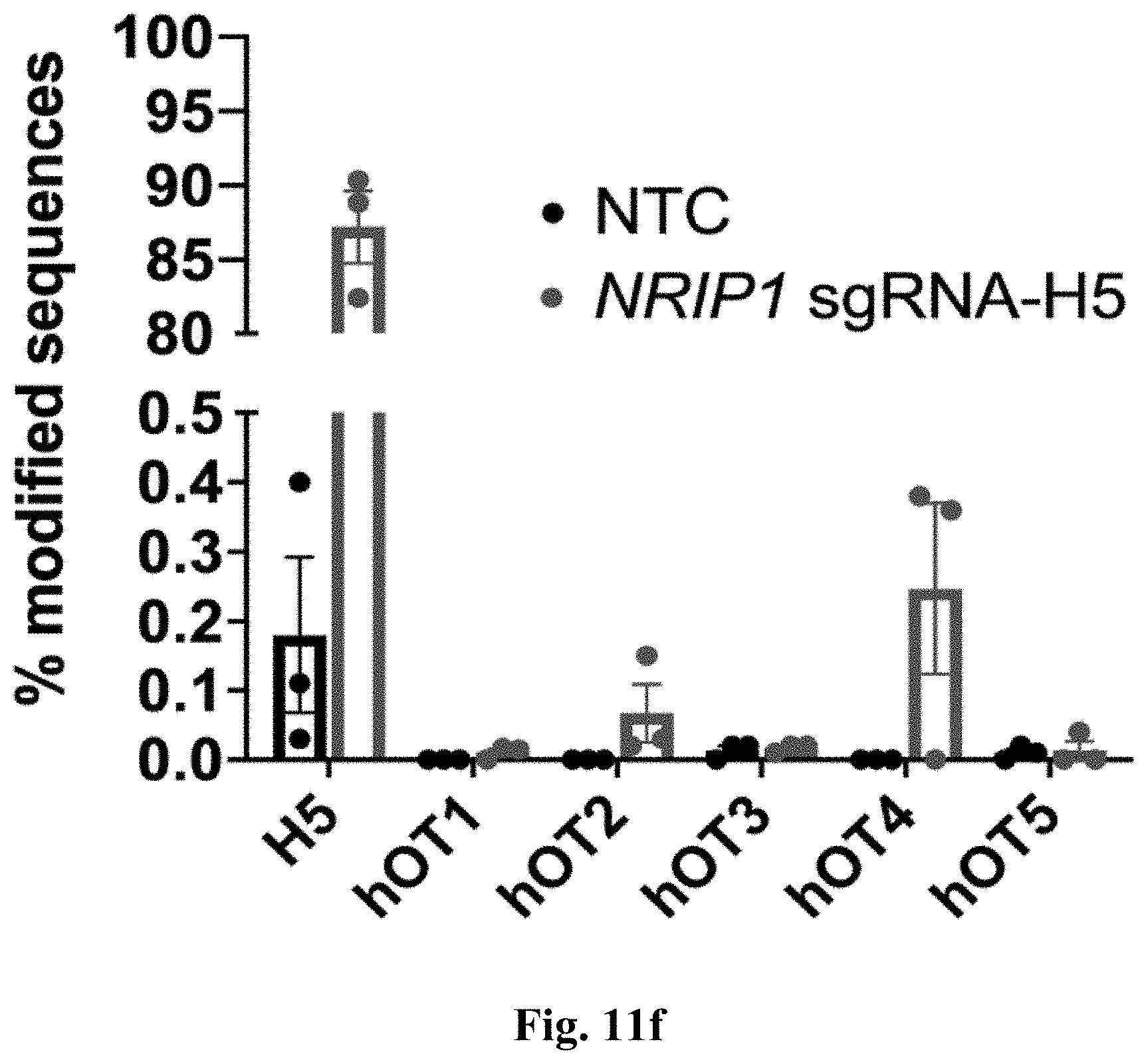 List of Exemplary Cas9 or Cas12a Orthologs. UniProt or GenBank Ortholog Accession Number Q99ZW2.1 J7RUA5.1 G3ECR1.2 BAK30384.1 Q0P897.1 A0Q5Y3.1 A7HP89.1 G1UFN3.1 Q9CLT2.1 A0Q7Q2.1 WP_052585281.1 U2UMQ6.1 A0A182DWE3.1 List of Exemplary High Fidelity and/or PAM-relaxed RGN Orthologs. Published HF/PAM-RGN variants PMID/U.S. Ser. No. Mutations* 26628643 K810A/K1003A/R1060A (1.0); (SpCas9) K848A/K1003A/R1060A(1.1) eSpCas9 29431739 M495V/Y515N/K526E/R661Q; (SpCas9) (M495V/Y515N/K526E/R661S; evoCas9 M495V/Y515N/K526E/R661L) 26735016 N497A/R661A/Q695A/Q926A (SpCas9) HF1 30082871 R691A (SpCas9) HiFi Cas9 28931002 N692A, M694A, Q695A, H698A (SpCas9) HypaCas9 30082838 F539S, M763I, K890N (SpCas9) Sniper- Cas9 29512652 A262T, R324L, S409I, E480K, E543D, M694I, (SpCas9) xCas9 E1219V 30166441 R1335V, L1111R, D1135V, G1218R, (SpCas9) E1219F, A1322R, T1337R SpCas9-NG 26098369 D1135V, R1335Q, T1337R; (SpCas9) D1135V/G1218R/R1335E/T1337R VQR/VRER 26524662 E782K/N968K/R1015H (SaCas9)-KKH enAsCas12a U.S. Ser. No. One or more of: E174R, S170R, S542R, K548R, 15/960,271 K548V, N551R, N552R, K607R, K607H, e.g., E174R/S542R/K548R, E174R/S542R/K607R, E174R/S542R/K548V/N552R, S170R/S542R/K548R, S170R/E174R, E174R/S542R, S170R/S542R, E174R/S542R/K548R/N551R, E174R/S542R/K607H, S170R/S542R/K607R, or S170R/S542R/K548V/N552R enAsCas12a-HF U.S. Ser. No. One or more of: E174R, S542R, K548R, e.g., 15/960,271 E174R/S542R/K548R, E174R/S542R/K607R, E174R/S542R/K548V/N552R, S170R/S542R/K548R, S170R/E174R, E174R/S542R, S170R/S542R, E174R/S542R/K548R/N551R, E174R/S542R/K607H, S170R/S542R/K607R, or S170R/S542R/K548V/N552R, with the addition of one or more of: N282A, T315A, N515A and K949A enLbCas12a(HF) U.S. Ser. No. One or more of T152R, T152K, D156R, D156K, 15/960,271 Q529K, G532R, G532K, G532Q, K538R, K538V, D541R, Y542R, M592A, K595R, K595H, K595S or K595Q, e.g., D156R/G532R/K538R, D156R/G532R/K595R, D156R/G532R/K538V/Y542R, T152R/G532R/K538R, T152R/D156R, D156R/G532R, T152R/G532R, D156R/G532R/K538R/D541R, D156R/G532R/K595H, T152R/G532R/K595R, T152R/G532R/K538V/Y542R, optionally with the addition of one or more of: N260A, N256A, K514A, D505A, K881A, S286A, K272A, K897A enFnCas12a(HF) U.S. Ser. No. One or more of T177A, K180R, K180K, E184R, 15/960,271 E184K, T604K, N607R, N607K, N607Q, K613R, K613V, D616R, N617R, M668A, K671R, K671H, K671S, or K671Q, e.g., E184R/N607R/K613R, E184R/N607R/K671R, E184R/N607R/K613V/N617R, K180R/N607R/K613R, K180R/E184R, E184R/N607R, K180R/N607R, E184R/N607R/K613R/D616R, E184R/N607R/K671H, K180R/N607R/K671R, K180R/N607R/K613V/N617R, optionally with the addition of one or more of: N305A, N301A, K589A, N580A, K962A, S334A, K320A, K978A *predicted based on UniRule annotation on the UniProt database. (SEQ ID NO: 5) TAGCAATAAAGGATCGTTTATTTTCATTGGAA GCGTGTGTTGGTTTTTTGATCAGGCGCG. Sequences of sgRNAs. Mouse Nrip1 sgRNA Human NRIP1 sgRNA sequences (5′→3′) sequences (5′→3′) sgRNA-M1 CUUGUAUUGA sgRNA-H1 CUUCUAUUGA ACAUGACUCA ACAUGACUCA (SEQ ID NO: 6) (SEQ ID NO: 13) sgRNA-M2 AUUGUCUUAAC sgRNA-H2 GCUUGGCUCU UUACCUCGA GAUGUGCACC (SEQ ID NO: 7) (SEQ ID NO: 14) sgRNA-M3 GUCAGUACCCA sgRNA-H3 ACACAUACAU GACGUACCA AUCAGGGGUC (SEQ ID NO: 8) (SEQ ID NO: 15) sgRNA-M4 AUAAGGUUUG sgRNA-H4 ACAUCAGGAA GAGUCACGUC GAUUCGUAUC (SEQ ID NO: 9) (SEQ ID NO: 16) sgRNA-M5 CACUUUGUCC sgRNA-H5 GUCAUGUGCU CACUGCGGGA GCAAGAUUAC (SEQ ID NO: 10) (SEQ ID NO: 17) sgRNA-M6 ACAGGCUGUU sgRNA-H6 UUUGCAUGGU GCCAGCAUGG CCCUAAGAAA (SEQ ID NO: 11) (SEQ ID NO: 18) sgRNA-M7 GGAGUCGAAG AACAUCUGCA (SEQ ID NO: 12) Human and Mouse Non-Targeting control sgRNA (NUC): GCACUACCAGAGCUAACUCA (SEQ ID NO: 19) (3) Zinc Finger Nucleases (ZFNs)