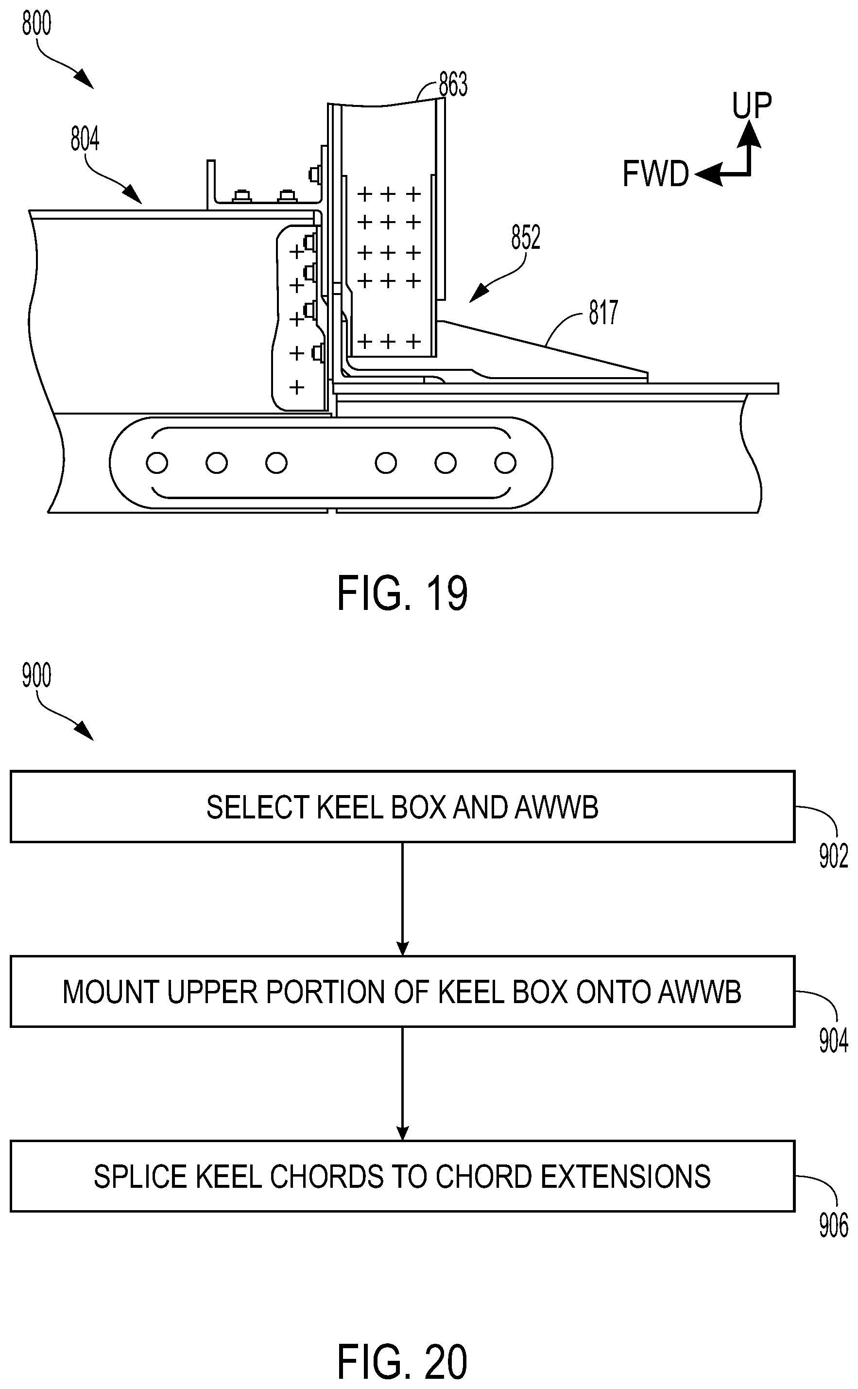mounting an aft end of the upper keel box portion onto a forward side of an aft wheel well bulkhead (AWWB). 17. The method of 18. The method of 19. The method of 20. The method of