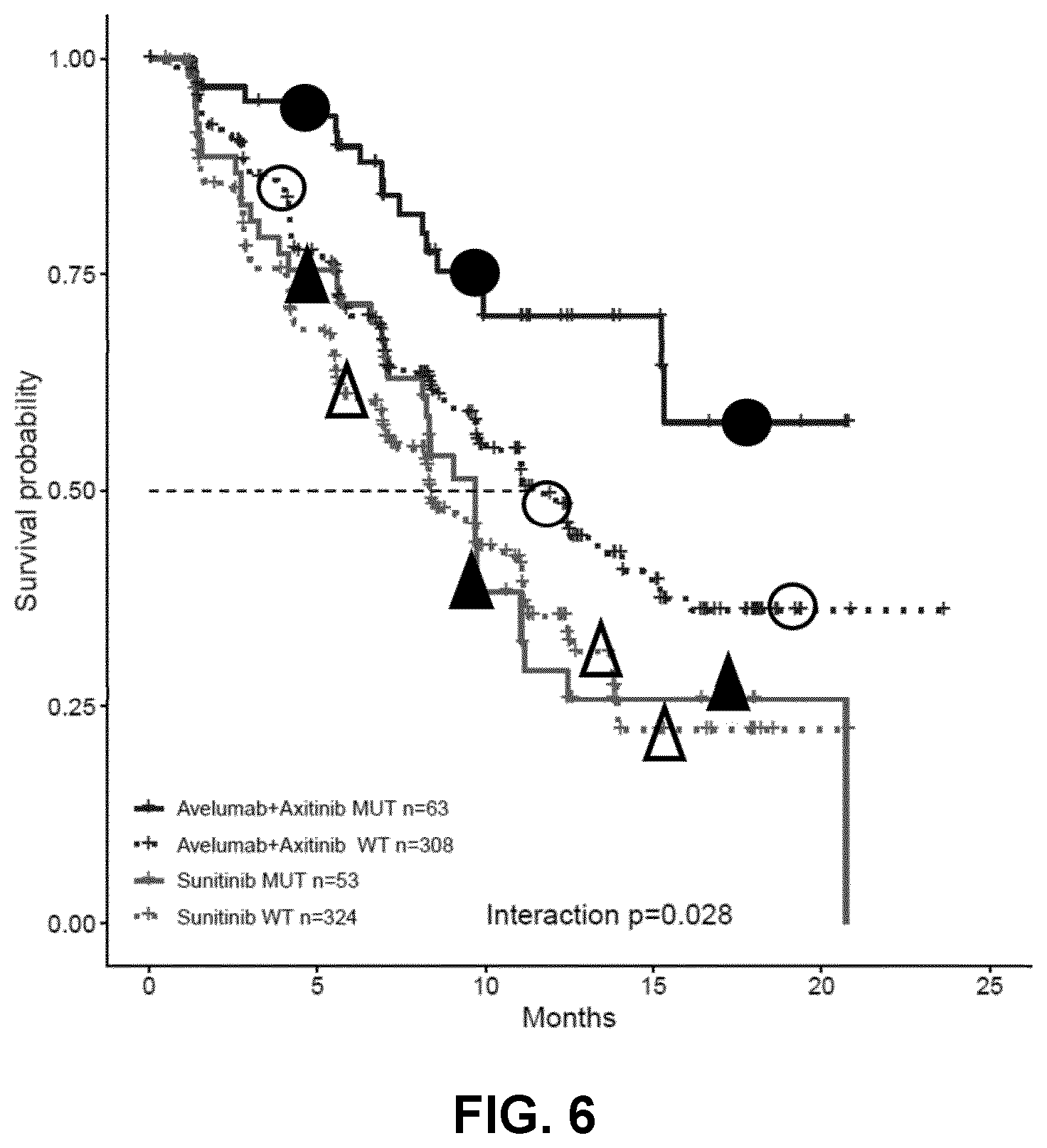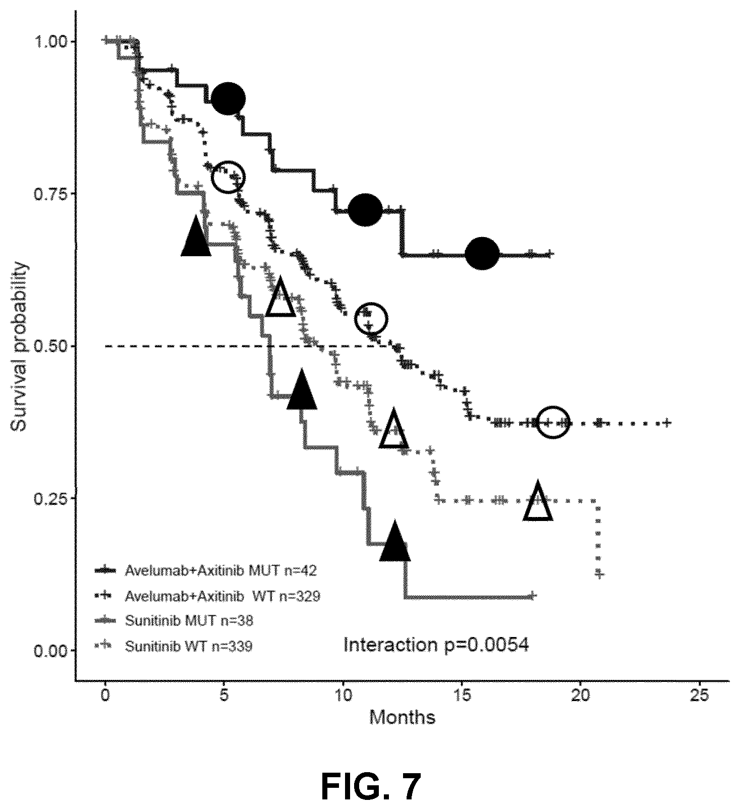 Rate of Progression Free Survival in Patients with Genetic Mutations Number of Rate of PFS Rate of PFS Patient group Patients at 15 months at 20 months CDL163L1 mutation 25 90% 90% Avelumab + axitinib arm, CDL163L1 wild type 346 50% 40% Avelumab + axitinib arm CDL163L1 mutation 22 15% 15% Sunitinib arm CDL163L1 wild type 355 25% 25% Sunitinib arm DNMT1 mutation 21 80% 80% Avelumab + axitinib arm, DNMT1 wild type 350 45% 40% Avelumab + axitinib arm DNMT1 mutation 16 0% 0% Sunitinib arm DNMT1 wild type 361 25% 25% Sunitinib arm MCR1 mutation 20 80% 80% Avelumab + axitinib arm, MCR1 wild type 351 45% 40% Avelumab + axitinib arm MCR1 mutation 15 30% n/a Sunitinib arm MCR1 wild type 362 30% 30% Sunitinib arm ABCA1 mutation 27 55% 55% Avelumab + axitinib arm, ABCA1 wild type 344 40% 40% Avelumab + axitinib arm ABCA1 mutation 23 25% n/a Sunitinib arm ABCA1 wild type 354 25% 25% Sunitinib arm FOXO1 mutation 32 75% 75% Avelumab + axitinib arm, FOXO1 wild type 339 45% 40% Avelumab + axitinib arm FOXO1 mutation 25 10% 10% Sunitinib arm FOXO1 wild type 352 25% 25% Sunitinib arm IL16 mutation 63 70% 60% Avelumab + axitinib arm, IL16 wild type 308 40% 35% Avelumab + axitinib arm IL16 mutation 53 25% 25% Sunitinib arm IL16 wild type 324 23% 23% Sunitinib arm MYH7B mutation 42 65% 65% Avelumab + axitinib arm, MYH7B wild type 329 45% 40% Avelumab + axitinib arm MYH7B mutation 38 10% n/a Sunitinib arm MYH7B wild type 339 25% 25% Sunitinib arm STAB2 mutation 30 75% 75% Avelumab + axitinib arm, STAB2 wild type 341 45% 33% Avelumab + axitinib arm STAB2 mutation 37 30% 30% Sunitinib arm STAB2 wild type 340 25% 25% Sunitinib arm LOC728763 mutation 39 75% 75% Avelumab + axitinib arm, LOC728763 wild type 332 35% 35% Avelumab + axitinib arm LOC728763 mutation 27 25% 25% Sunitinib arm LOC728763 wild type 350 23% 23% Sunitinib arm SPATA31C2 mutation 55 60% 60% Avelumab + axitinib arm, SPATA31C2 wild type 316 35% 35% Avelumab + axitinib arm SPATA 31C2 mutation 54 25% 25% Sunitinib arm SPATA31C2 wild type 323 23% 23% Sunitinib arm ARVCF mutation 20 71% N/A Avelumab + axitinib arm ARVCF wild type 20 27% N/A Avelumab + axitinib arm ARVCF mutation 346 43% 39% Sunitinib arm ARVCF wild type 352 22% 22% Sunitinib arm PTEN mutation 23 10% n/a Avelumab + axitinib arm, PTEN wild type 348 45% 45% Avelumab + axitinib arm PTEN mutation 34 20% n/a Sunitinib arm PTEN wild type 343 25% 25% Sunitinib arm Double mutant of 5 100% 100% (at 18 CD163L1, MC1R and months) DNMT1 Avelumab + axitinib arm, Single mutant of 56 80% 80% CD163L1, MC1R and DNMT1 Avelumab + axitinib arm Wild type of CD163L1, 310 35% 35% MC1R and NDMT1 Avelumab + axitinib arm Double mutant of 2 0 0 CD163L1, MC1R and NDMT1 Sunitinib arm Single mutant of 49 15% 15% (at 18 CD163L1, MC1R and month) NDMT1 Sunitinib arm Wild type of 326 25% 25% CD163L1, MC1R and NDMT1 Sunitinib arm Example 4