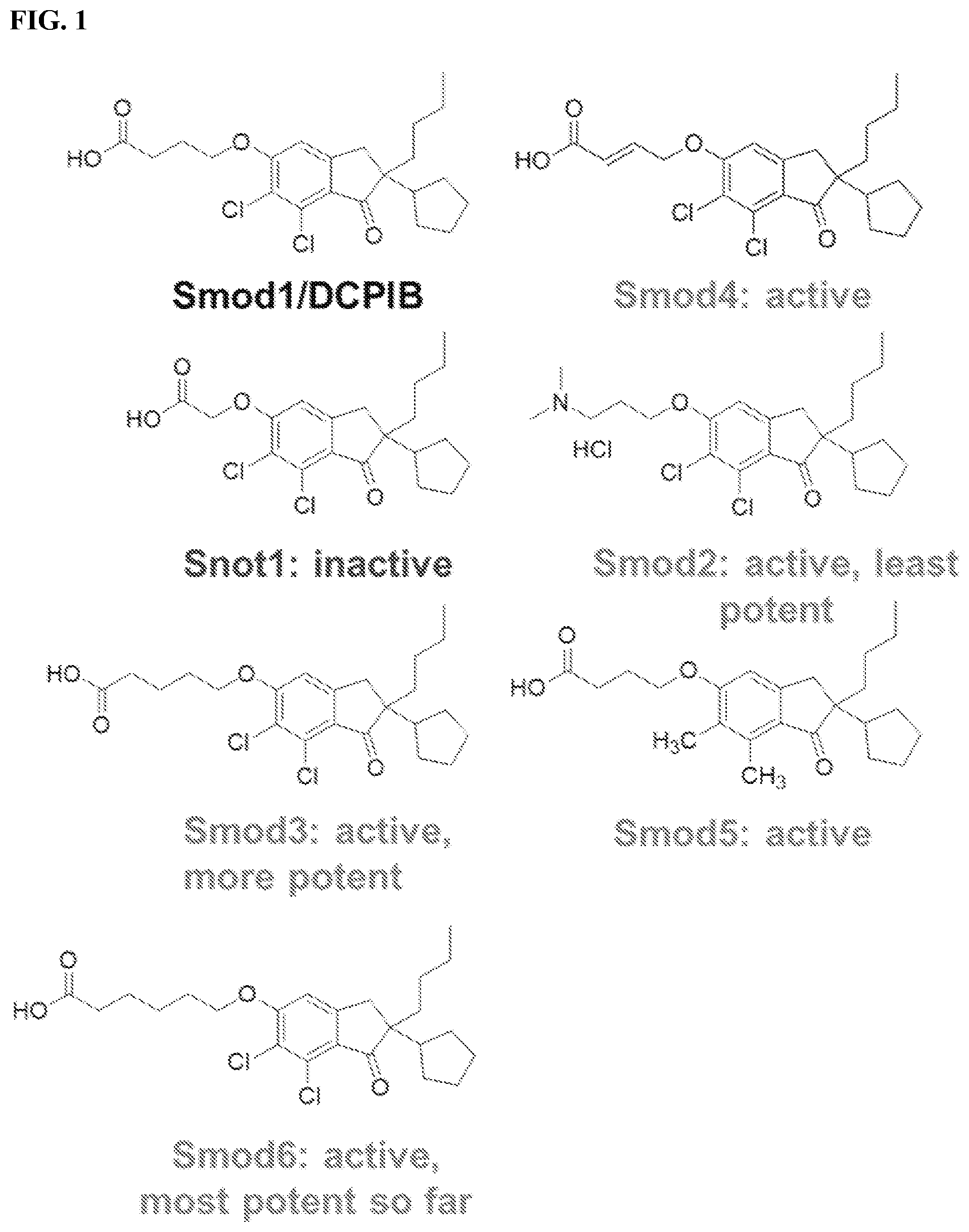 31. The compound of claim 30 wherein the compound has a higher potency at modulating or inhibiting a SWELL1 channel than an equivalent amount of DCPIB (4-[2[butyl-6,7-dichloro-2-cyclopentyl-2,3-dihydro-1-oxo-1H-inden-5-yl)oxy]butanoic acid).