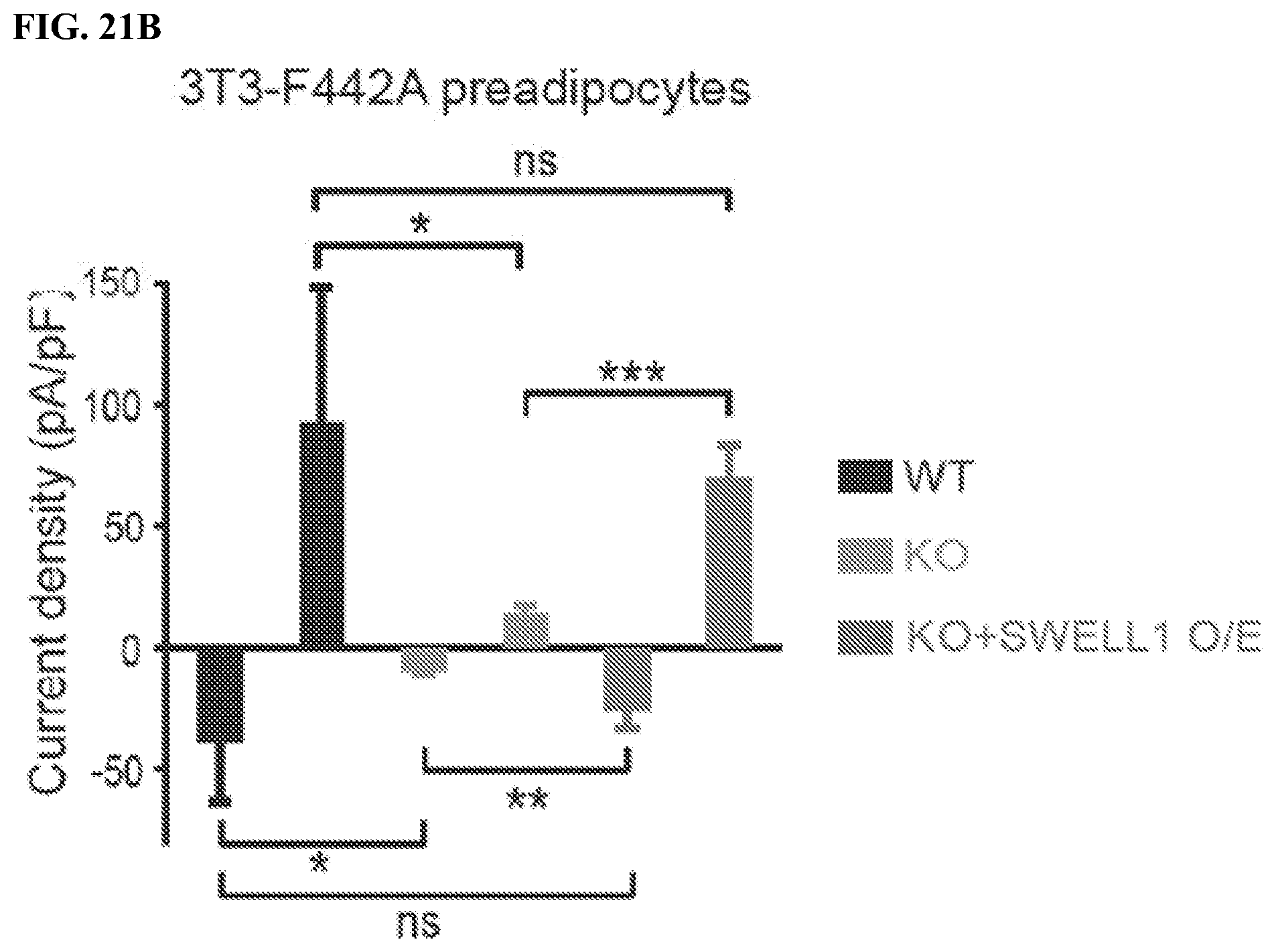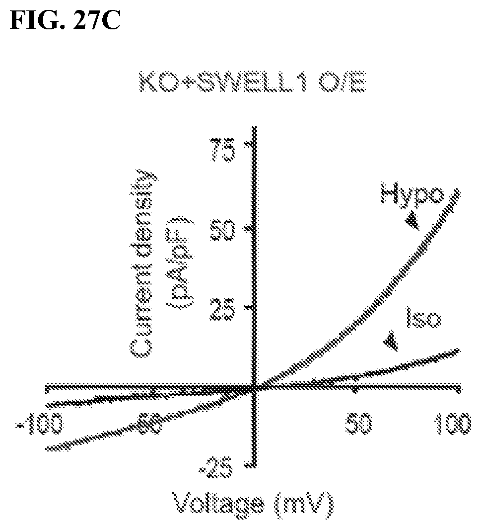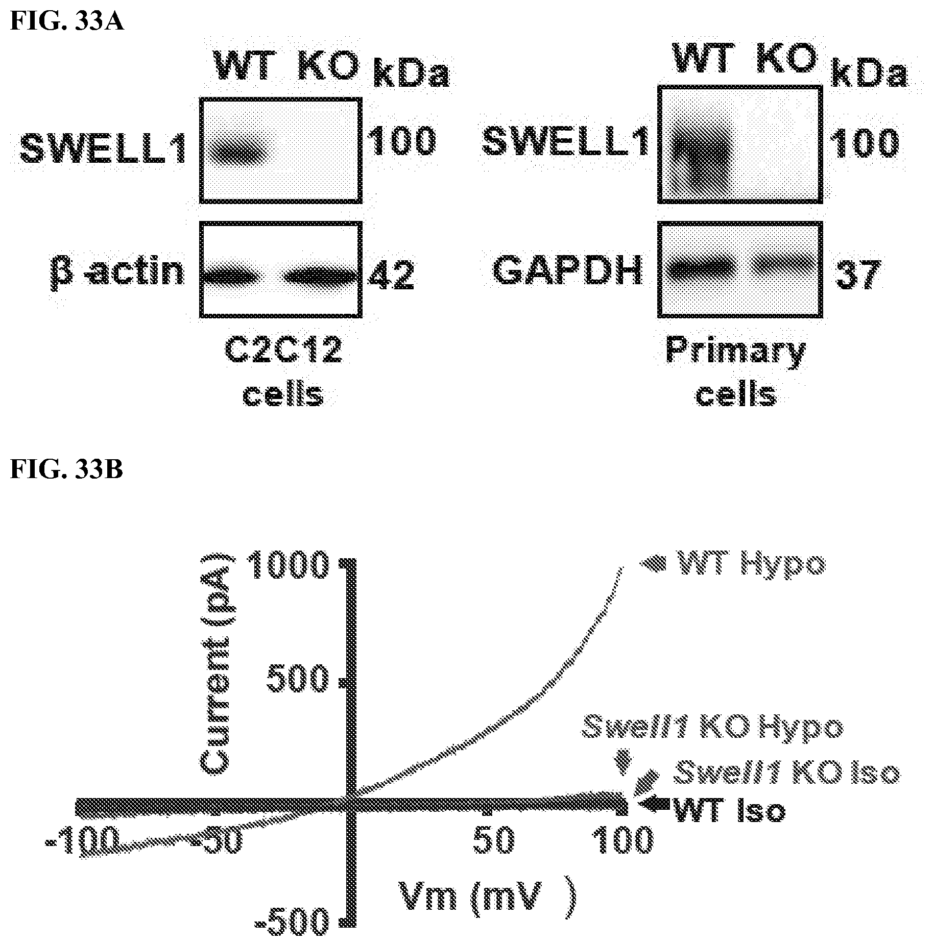 SWELL1 (LRRC8a) is the essential component of a hexameric ion channel signaling complex that encodes ICl,SWELL, or the volume-regulated anion current (VRAC). While the SWELL1-LRRC8 complex has been shown to regulate cellular volume in response to application of non-physiological hypotonic extracellular solutions, the physiological function(s) of this ubiquitously expressed ion channel signaling complex remain unknown. To determine the function of the SWELL1-LRRC8 channel complex in skeletal muscle, we genetically deleted SWELL1 from C2C12 mouse myoblasts using CRISPR/cas9 mediated gene editing as described previously (Zhang et al., 2017 and Kim et al., 2000), and from primary skeletal muscle cells isolated from SWELL1flflmice transduced with adenoviral Cre-mCherry (KO) or mCherry alone (WT control) (Zhang et al., 2017). SWELL1 protein Western blots confirmed robust SWELL1 ablation in both SWELL1 KO C2C212 myotubes and SWELL1 KO primary skeletal myotubes (FIG. 33A). Next, whole-cell patch clamp revealed that the hypotonically-activated (210 mOsm) outwardly rectifying current present in WT C2C12 myoblasts is abolished in SWELL1 KO C2C12 myoblasts (FIG. 33B), confirming SWELL1 as also required for ICl,SWELLor VRAC in skeletal muscle myoblasts. Remarkably, SWELL1 ablation is associated with impaired myotube formation in both C2C12 myoblasts and in primary skeletal satellite cells (FIG. 33C), with an 58% and 45% reduction in myotube area in C2C12 and skeletal muscle myotubes, respectively, compared to WT. As an alternative metric, myoblast fusion is also markedly reduced by 80% in SWELL1 KO C2C12 compared to WT, as assessed by myotube fusion index (number of nuclei inside myotubes/total number of nuclei; FIG. 33C).
