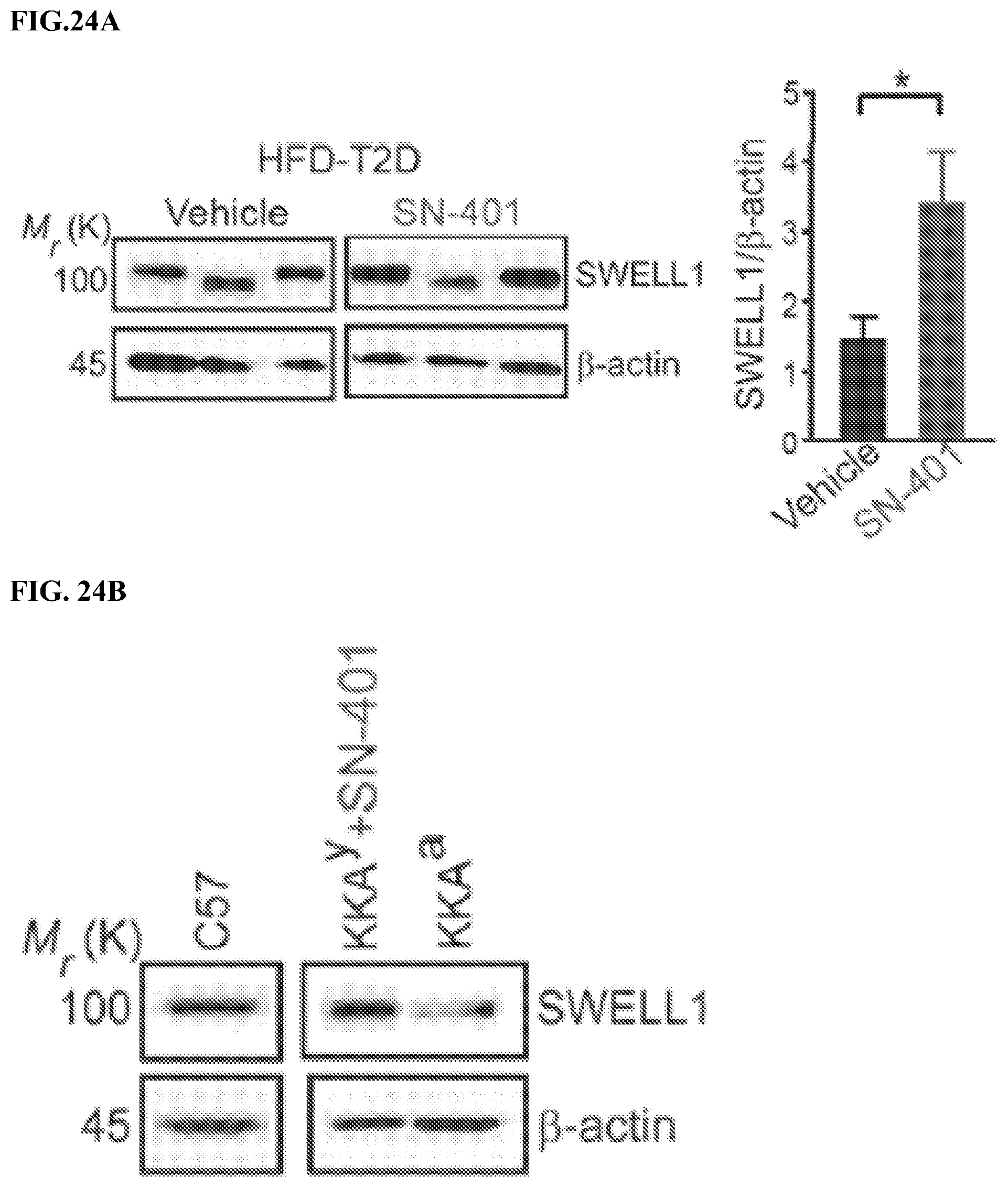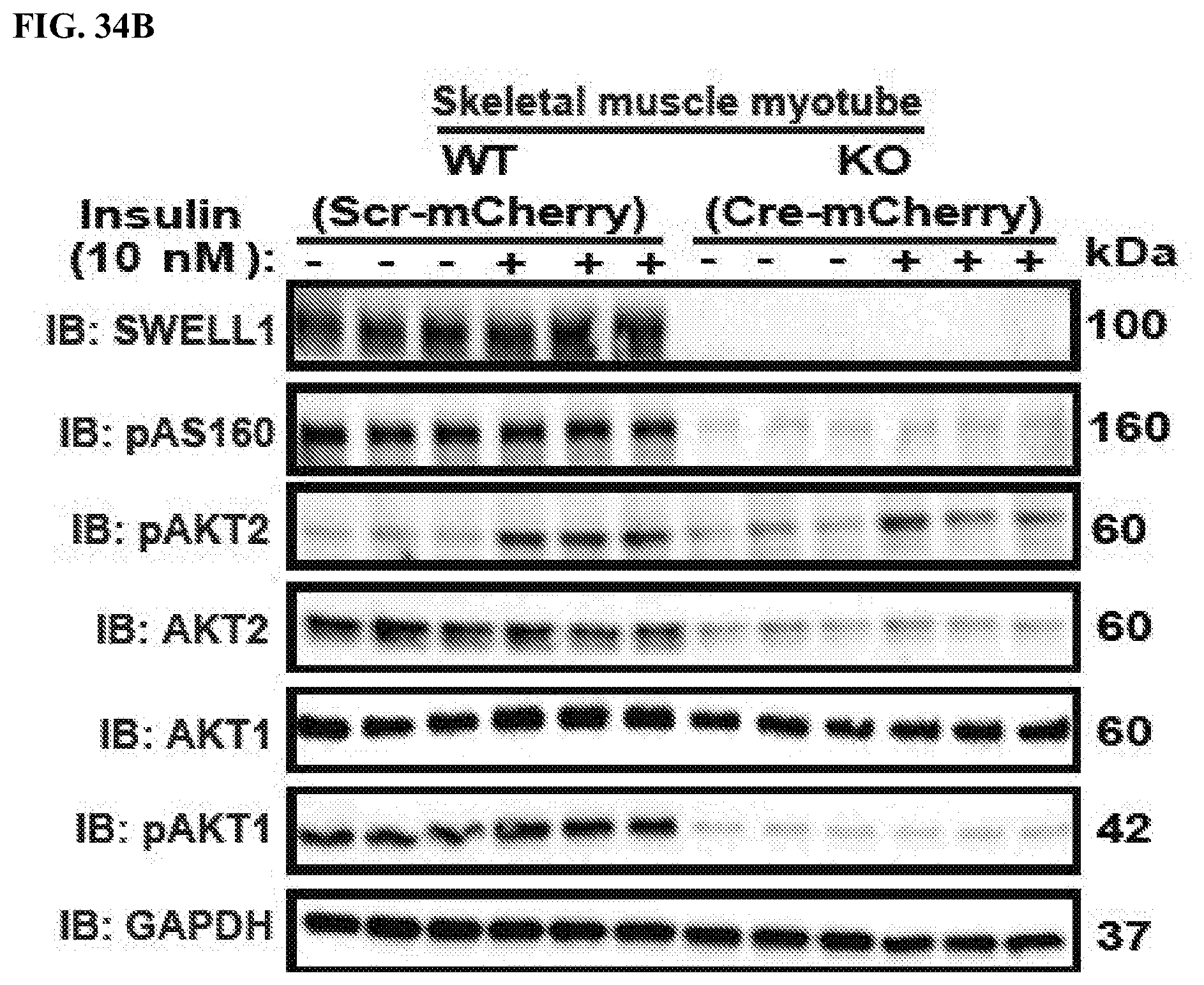 To further validate SWELL1-mediated effects on muscle differentiation and signaling we re-expressed SWELL1 in SWELL1 KO C2C12 myoblasts (SWELL1 O/E) and then examined myotube differentiation and basal activity of multiple intracellular signaling pathways by Western blot, including pAKT1, pAKT2, pAS160, p-p70S6K, pS6K and pERK1/2 as compared to WT and SWELL1 KO C2C12 myotubes. SWELL1 O/E to 2.12-fold WT levels fully rescues myotube development in SWELL1 KO myotubes (FIG. 35A), as quantified by restoration of SWELL1 KO myotube area to levels above WT (FIG. 35B). This rescue of SWELL1 KO myotube development upon SWELL1 O/E (FIGS. 35A and 35B) is associated with either restored (pAS160, AKT2, pAKT1, AKT1, p70S6K) or supra-normal (pAKT2, p-p70S6K, pS6K, pERK1/2) signaling (FIGS. 35C and 35D) compared to WT C2C12 myotubes. These data demonstrate that SWELL1 protein expression level strongly regulates skeletal muscle insulin signaling and myogenic differentiation.