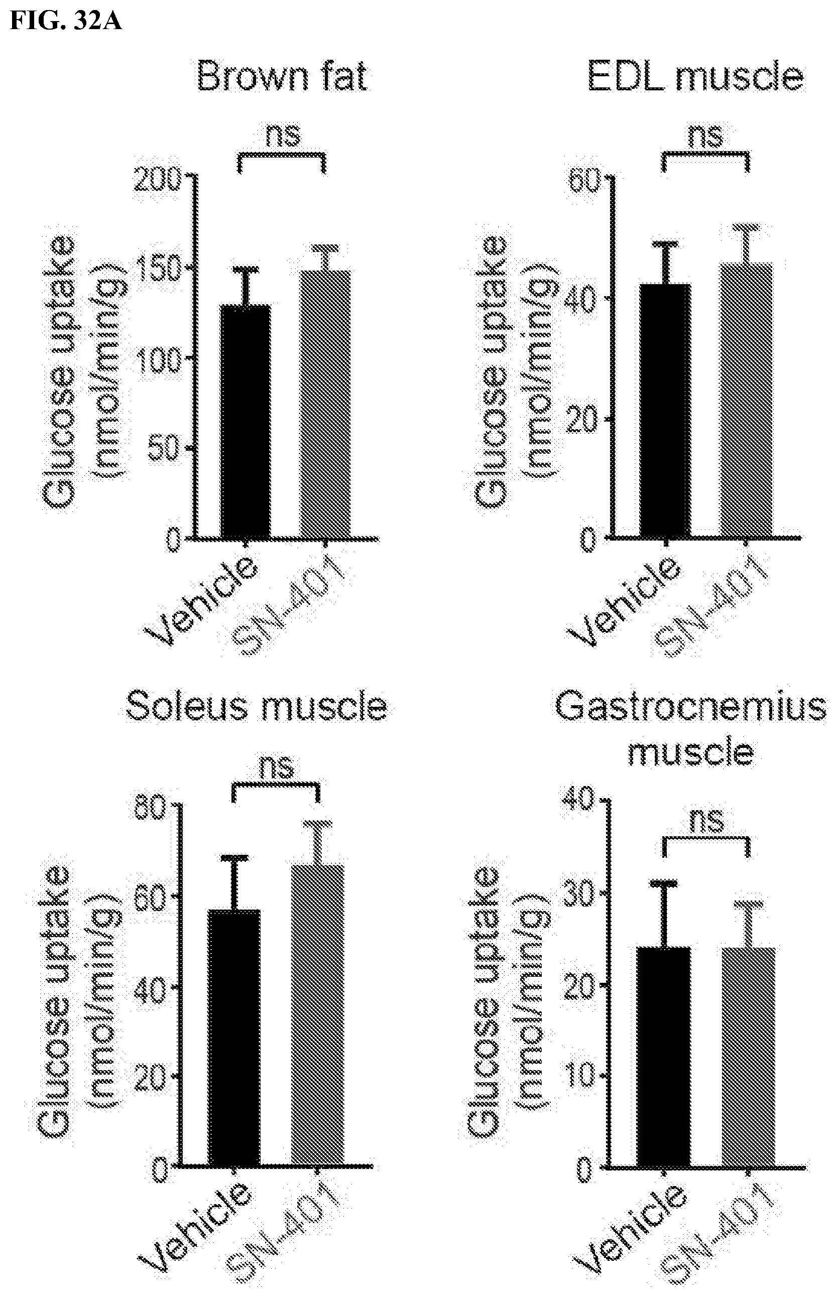 To determine whether these SWELL1 dependent differences in muscle endurance and force were due to impaired oxidative capacity, we next measured oxygen consumption rate (OCR) and extracellular acidification rate (ECAR) in WT and SWELL1 KO primary skeletal muscle cells, under basal and insulin-stimulated conditions (FIG. 39F). Oxygen consumption of SWELL1 KO primary myotubes are 26% lower than WT and, in contrast to WT cells, are unresponsive to insulin-stimulation (FIG. 39F), consistent with abrogation of insulin-AKT/ERK1/2 signaling upon skeletal muscle SWELL1 depletion. These relative changes persist in the presence of Complex V and III inhibitors, Oligomycin and Antimycin A (FIGS. 39F and 39G), showing that insulin-stimulated glycolytic pathways are primarily dysregulated upon SWELL1 depletion. In contrast, FCCP, which maximally uncouples mitochondria, abolishes differences in oxygen consumption between WT and SWELL1 KO primary muscle cells, showing that there might be no differences in functional mitochondrial content in SWELL1 KO muscle. To more directly measure glycolysis, we measured extracellular acidification rate (ECAR) in WT and SWELL1 KO primary myotubes. Insulin-stimulated ECAR increases are abolished in SWELL1 KO compared to WT cells, and these differences persist independent of electron transport chain modulators (FIG. 39H). These data show that SWELL1 regulation of skeletal muscle cellular oxygen consumption occurs at the level of glucose metabolism—potentially via SWELL1-dependent insulin-PI3K-AKT-AS160-GLUT4 signaling, glucose uptake and utilization. These findings in primary skeletal muscle cells are supported by marked transcriptional suppression numerous glycolytic genes: Aldoa, Eno3, GAPDH, Pfkm, and Pgam2; and glucose and glycogen metabolism genes: Phka1, Phka2, Ppp1r3c and Gys1, upon SWELL1 ablation in C2C12 myotubes (FIG. 41).
