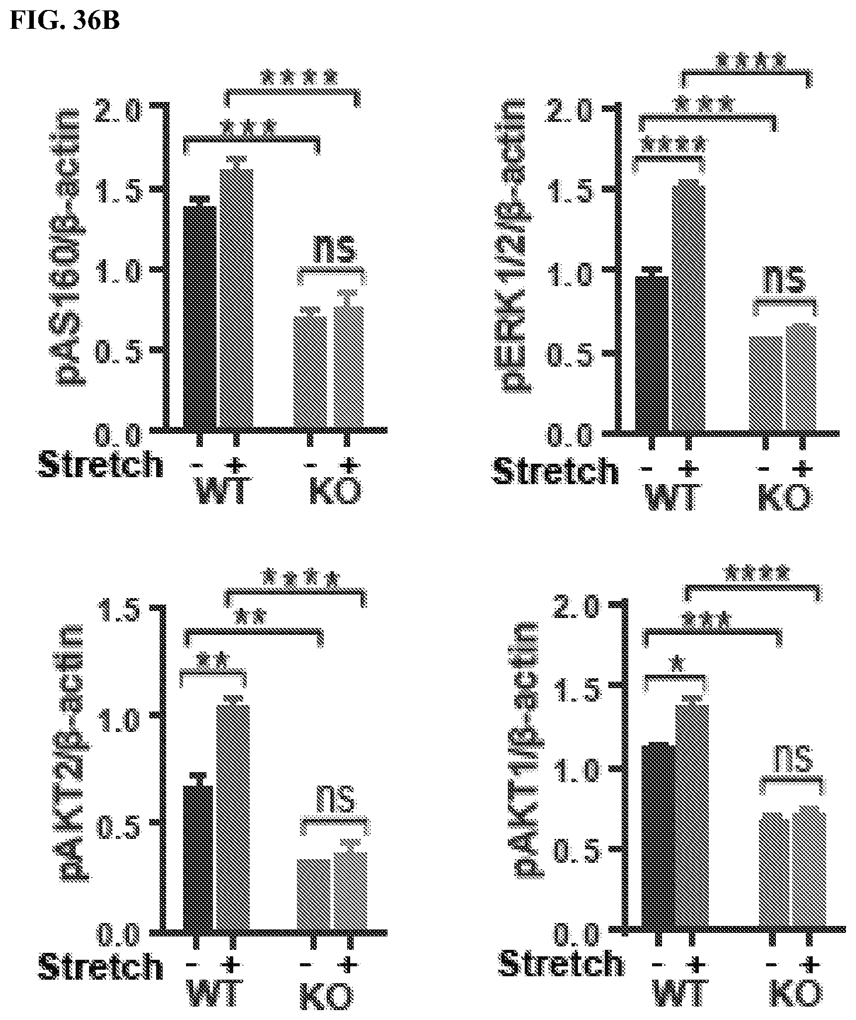 In a cellular context, there are numerous reports that VRAC and the SWELL1-LRRC8 complex that functionally encodes it is mechano-responsive. It is well established that mechanical stretch is an important regulator of skeletal muscle proliferation, differentiation and skeletal muscle hypertrophy and may be mediated by PI3K-AKT-MAPK signaling and integrin signaling pathways. To determine if SWELL1 is also required for stretch-mediated AKT and MAP kinase signaling in skeletal myotubes we subjected WT and SWELL1 KO C2C12 myotubes to 0% or 5% equiaxial stretch using the FlexCell stretch system. Mechanical stretch (5%) is sufficient to stimulate PI3K-AKT2/AKT1-pAS160-MAPK (ERK1/2) signaling in WT C2C12 in a SWELL1-dependent manner (FIGS. 36A and 36B). These data position SWELL1-LRRC8 as a co-regulator of both insulin and stretch-mediated PI3K-AKT-pAS160-MAPK signaling.