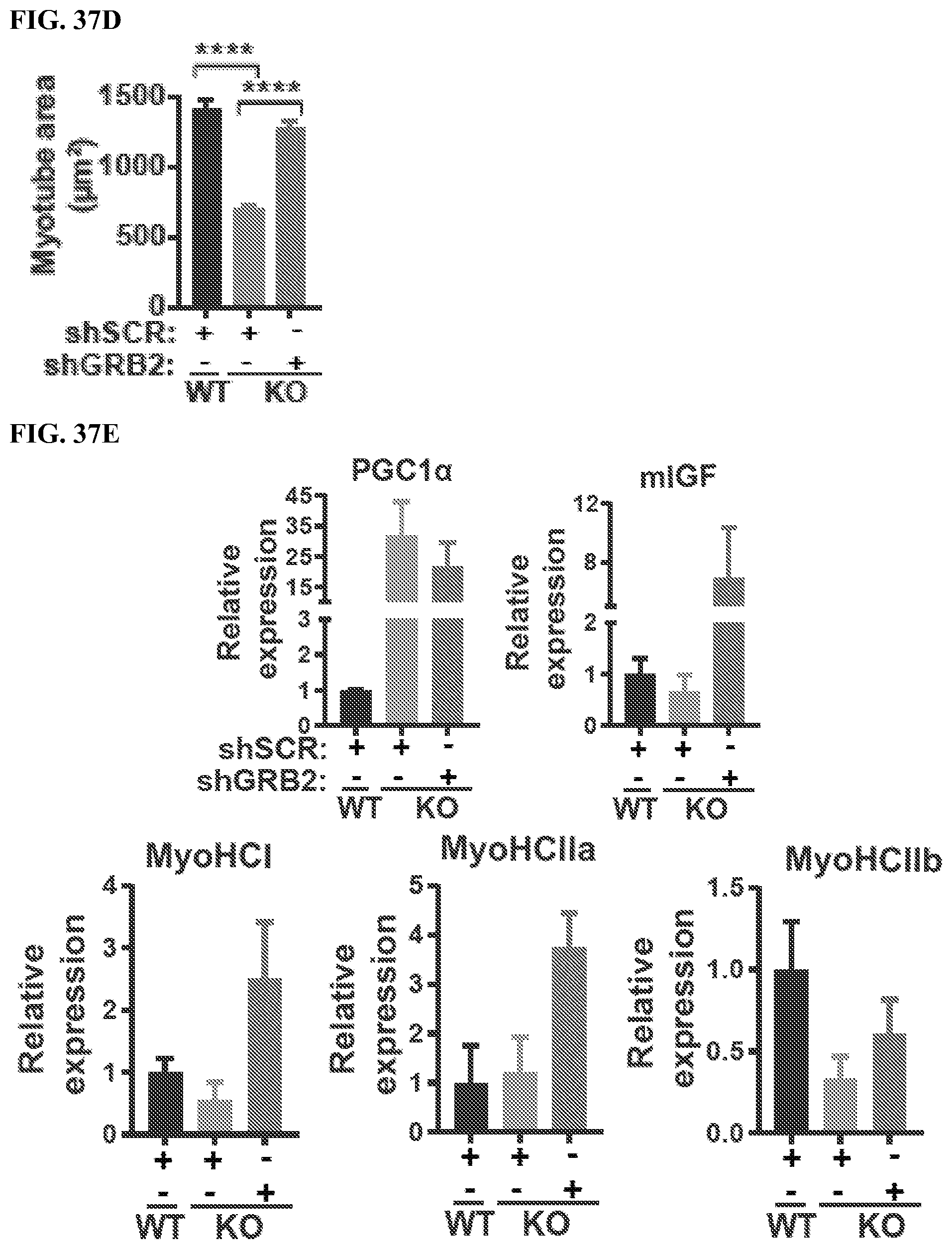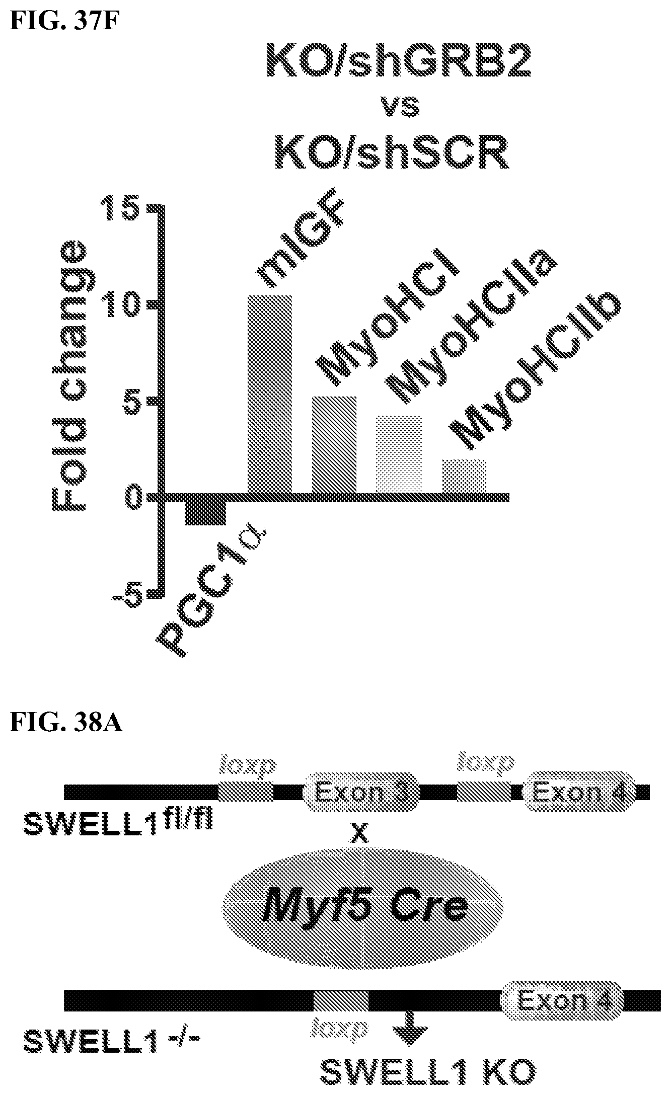 It has been reported earlier in both lymphocyte and adipocytes that the SWELL1-LRRC8 complex interacts with Growth factor Receptor-Bound 2 (GRB2) and regulates PI3K-AKT signaling, whereby GRB2 binds with IRS1/2 and negatively regulates insulin signaling. Indeed, GRB2 knock-down augments insulin-PI3K-MAPK signaling and induces myogenesis and myogenic differentiation genes. To determine if SWELL1 and GRB2 interact in C2C12 myotubes, we overexpressed C-terminal 3×Flag tagged SWELL1 in C2C12 cells followed by immunoprecipitation (IP) with Flag antibody. We observed significant GRB2 enrichment upon Flag IP from lysates of SWELL1-3×Flag expressing C2C12 myotubes, consistent with a GRB2-SWELL1 interaction (FIG. 37A). Based on the notion that SWELL1 titrates GRB2-mediated suppression of AKT/MAPK signaling, and that SWELL1 ablation results in unrestrained GRB2-mediated AKT/MAPK inhibition, we next tested if GRB2 knock-down (KD) may rescue myogenic differentiation in SWELL1 KO C2C12 myotubes. shRNA-mediated GRB2 KD in SWELL1 KO C2C12 myoblasts (SWELL1 KO/shGRB2; FIG. 37B) stimulates myotube formation (FIG. 37C) and increases myotube area (FIG. 37D), to levels equivalent to WT/shSCR (FIGS. 37C and 37D). Similarly, GRB2 KD in SWELL1 KO C2C12 myotubes induces myogenic differentiation markers IGF1, MyoHCl, MyoHClla and MyoHCIIb relative to both SWELL1 KO/shSCR and WT/shSCR (FIGS. 37E and 37F). These data are consistent with GRB2 suppression rescuing myotube differentiation in SWELL1 KO C2C12, and supports a model in which SWELL1 regulates myogenic differentiation by titrating GRB2-mediated signaling.