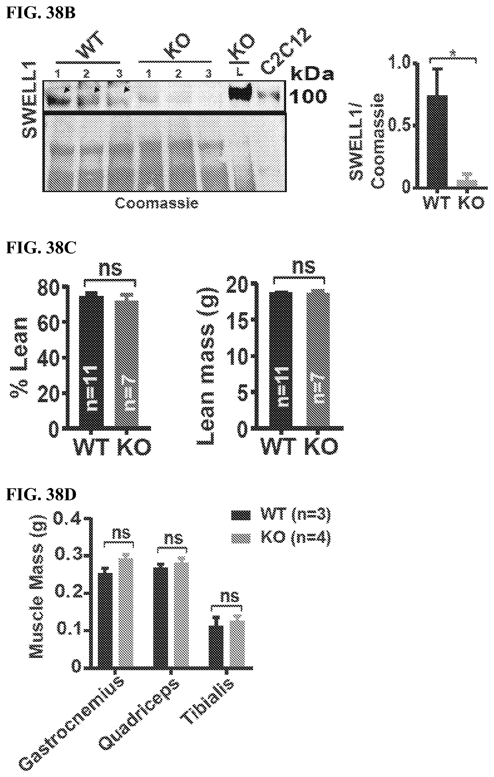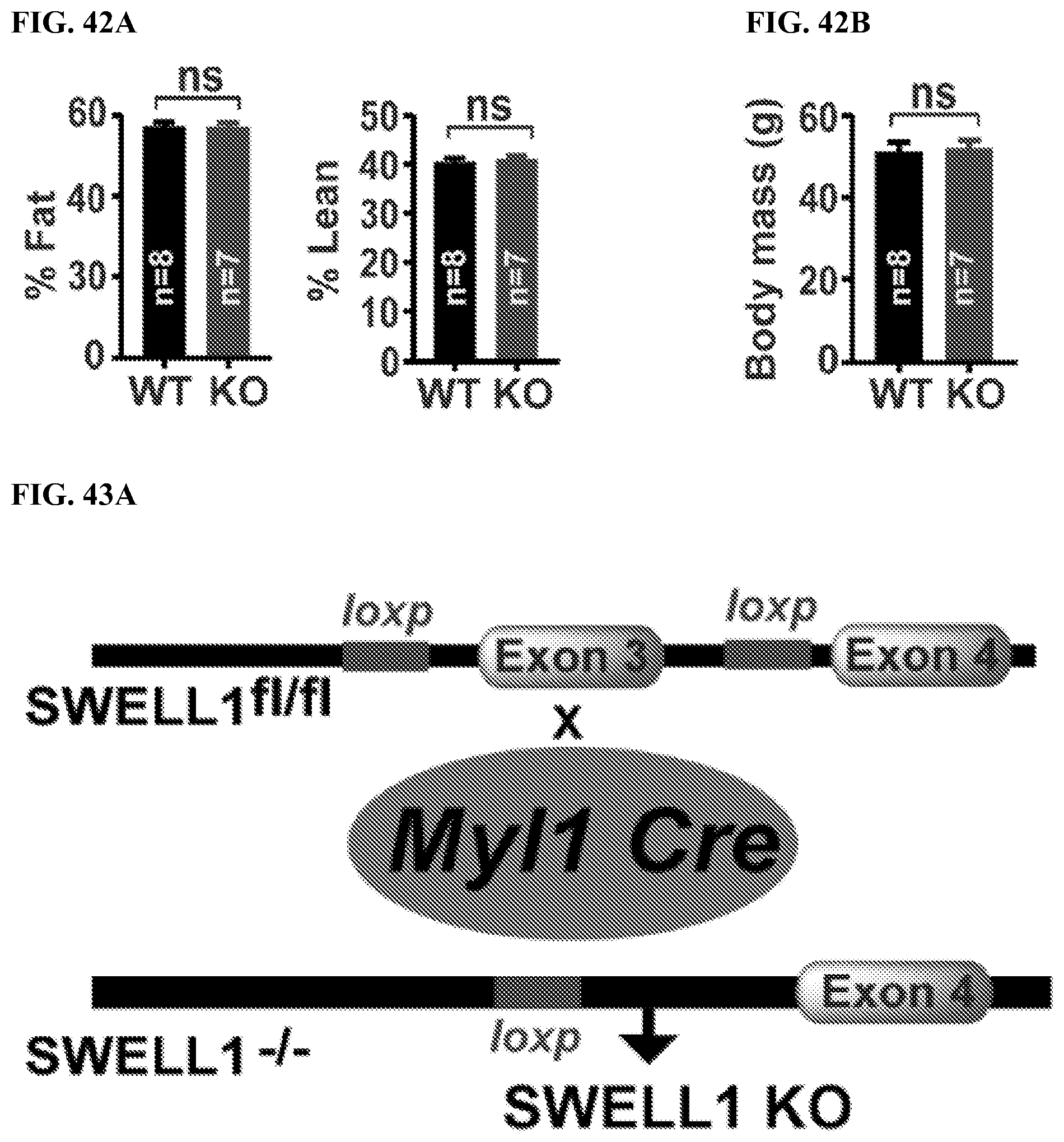 To examine the physiological consequences of SWELL1 ablation in vivo, we generated skeletal muscle specific SWELL1 KO mice using Cre-LoxP technology by crossing Myf5-Cre mice with SWELL1fl/flmice (Myf5 KO; FIG. 38A), and confirmed robust skeletal muscle SWELL1 depletion in Myf5 KO gastrocnemius muscle, 12.3-fold lower than WT controls (FIG. 38B). Remarkably, in contrast to the severe impairments in skeletal myogenesis observed in both SWELL1 KO C2C12 and primary skeletal myotubes in vitro (FIGS. 33, 35, and 37), Myf5 KO develop skeletal muscle mass comparable to WT littermates, based on Echo/MRI body composition (FIG. 38C) and gross muscle weights (FIG. 38D), and are born at normal mendelian ratios (Table 11, below). However, histological examination reveals a 27% reduction in skeletal myocyte cross-sectional area in Myf5 KO as compared to WT (FIG. 38E), showing a requirement for SWELL1 in skeletal muscle cell size regulation in vivo. This is potentially due to reductions in myotube fusion, as observed in C2C12 and primary skeletal muscle cells in vitro (FIG. 33), but occurring to a lesser degree in vivo. These data indicate that the profound impairments in myogenesis observed in vitro may reflect a very early requirement for SWELL1 signaling in skeletal muscle development (prior to SWELL1 protein elimination by Myf5-Cre mediated SWELL1 recombination), or other fundamental differences in myogenic differentiation processes in vitro versus in vivo.
