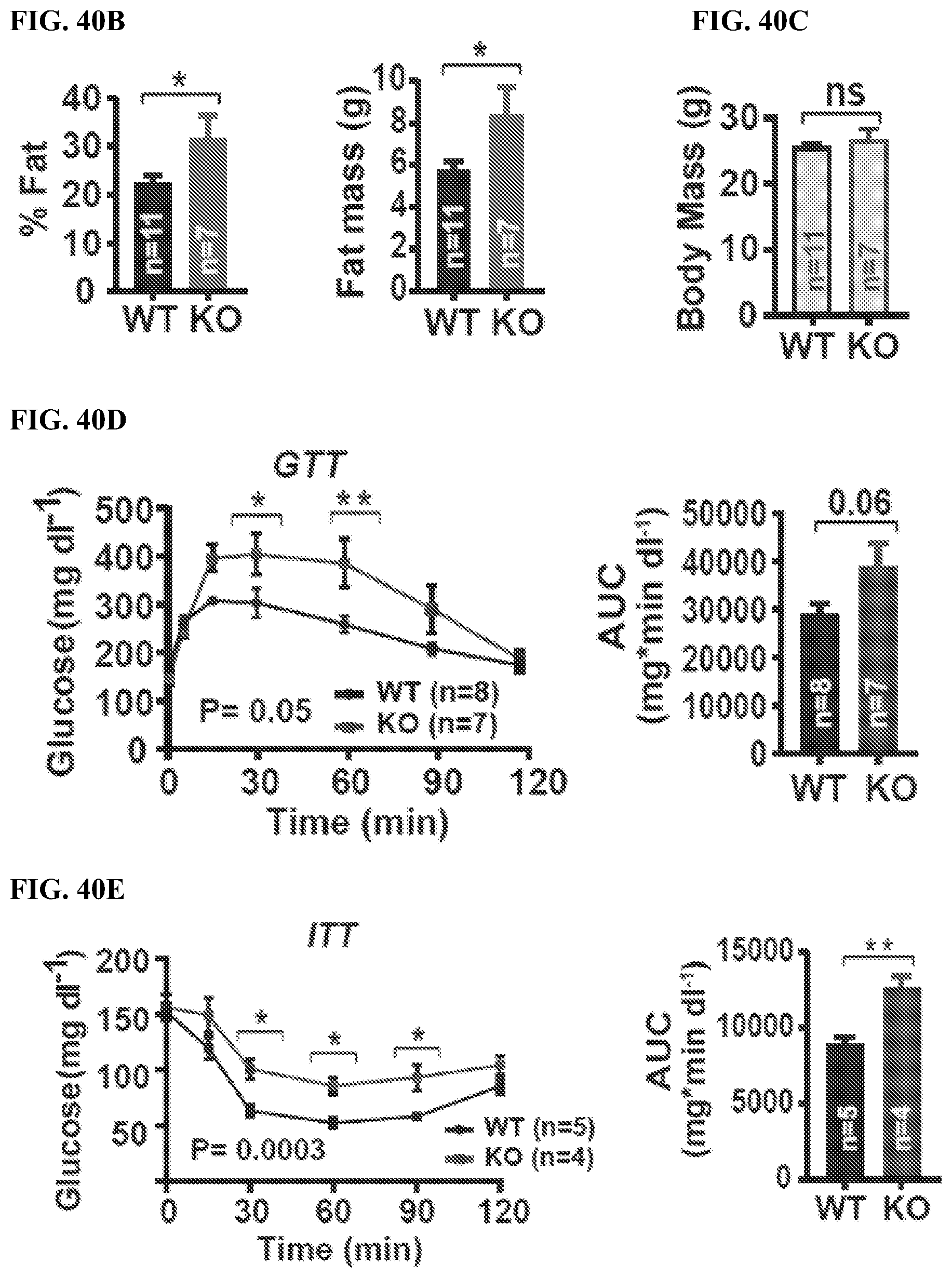 Guided by evidence of impaired insulin-PI3K-AKT-AS160-GLUT4 signaling observed in SWELL1 KO C2C12 and primary myotubes we next examined systemic glucose homeostasis and insulin sensitivity in WT and Myf5 KO mice by measuring glucose and insulin tolerance. On a regular chow diet, there are no differences in either glucose tolerance or insulin tolerance (FIG. 40A) between WT and Myf5 KO mice. However, over the course of 16-24 weeks on chow diet Myf5 KO mice develop 29% increased adiposity based on body composition measurements (FIG. 40B) compared to WT, with no significant difference in lean mass (FIG. 38C) or in total body mass (FIG. 40C). When Myf5 KO mice are raised on a high-fat-diet (HFD) for 16 weeks there is no difference in adiposity observed (FIG. 42) compared to WT mice, but glucose tolerance is impaired (FIG. 40D) and there is mild insulin resistance in HFD Myf5 KO mice as compared to WT (FIG. 40E).