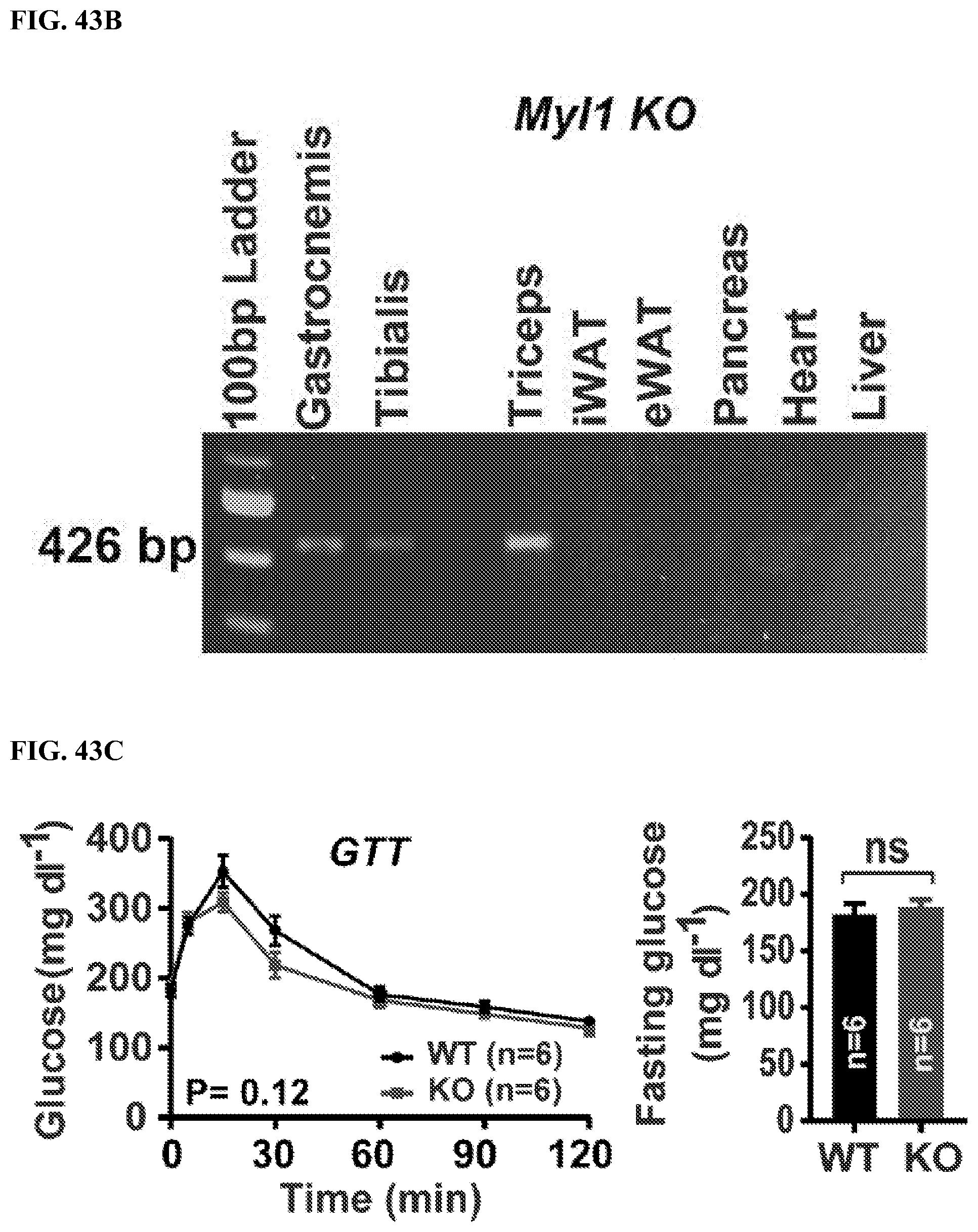 Since Myf5 is also expressed in brown fat, it is possible that these metabolic phenotypes arise from SWELL1-mediated effects in brown fat and consequent changes in systemic metabolism. To rule out this possibility, we repeated a subset of the above experiments in a skeletal muscle targeted KO mouse generated by crossing the Myl1-Cre and SWELL1fl/flmice (Myl1-Cre;SWELL1fl/fl) or Myl1 KO (FIG. 43A), since Myl1-Cre is restricted to mature skeletal muscle (FIG. 43B), and excludes brown fat. Similar to Myf5 KO mice, Myl1 KO mice fed a regular chow diet, have normal glucose tolerance (FIG. 43C), but exhibit 24% reduced exercise capacity on treadmill testing, as compared to WT (FIG. 43D). Also, Myl1 KO mice develop increased visceral adiposity over time on regular chow, based on 24% increased epididymal adipose mass normalized to body mass (FIG. 43E), with no differences in inguinal adipose tissue, muscle mass (FIG. 43F), or total body mass (FIG. 43G). These data show that impaired skeletal muscle glucose uptake in Myl1 KO and Myf5 KO mice are compensated for by increased adipose glucose uptake and de novo lipogenesis, which contribute to preserved glucose tolerance, at the expense of increased adiposity in skeletal muscle targeted SWELL1 KO mice raised on a regular chow diet. However, overnutrition-induced obesity, and the associated impairments in adipose and hepatic glucose disposal may uncover glucose intolerance and insulin resistance in skeletal muscle targeted SWELL1 KO mice.