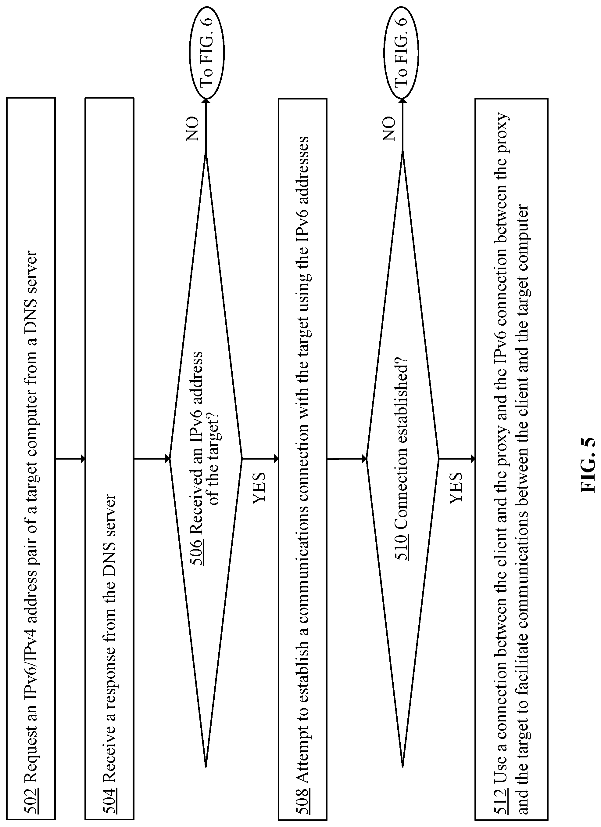 5.0. IMPROVEMENTS PROVIDED BY CERTAIN EMBODIMENTS 6.0. HARDWARE IMPLEMENTATION 7.0. GENERAL CONSIDERATIONS 1.0. Overview In some embodiments, an automated IPv6/IPv4 fallback approach for proxy networks is presented. The approach allows extending an IP address allocation policy to allow the proxy to assign, to identification-information of a client, an address pair comprising an IPv6 address and an IPv4 address of the proxy at the same time when the association is created. The IP address pair of the proxy is assigned to the identification-information of the client in the same assigning step, and thus it is readily-available to the proxy when the proxy attempts to establish either an IPv6-based connection or an IPv4-based connection with another computer. For simplicity of the description, the extended address allocation policy is referred herein also as the “extended policy” or the “policy.” According to the extended policy, the process described herein involves associating, to identification-information of a client, an IP address pair including an IPv6 address and an IPv4 address of the proxy. This is different than in conventional approaches in which just one IP address (either an IPv6 address or an IPv4 address) of the proxy is assigned to the identification-information of the client. A proxy may apply the extended policy when the proxy receives, for example, a request from a client to authenticate to the proxy and/or to connect to a target computer. Upon receiving the request, the proxy applies the extended policy to create an association between the identification-information of the client and an address pair including an IPv6 address and an IPv4 address of the proxy that the proxy selects from a pool of its own, available IP addresses. One of the benefits of the presented technology is the ability to utilize the IPv6 addresses more broadly and reliably than it was done in the past. The presented approach includes an extended address allocation policy for the proxy networks that provides the automated mechanisms for a concurrent assignment of both an IPv6 address and an IPv4 address of the proxy to the identification information of the client. In some embodiments, the approach allows utilizing the IPv6 address first, and if the utilization of the IPv6 address fails for some reason, automatically falling back to utilizing the IPv4 address without any modifications to the already-created addresses allocation. The presented policy allows creating a 1:1 relation between identification-information of a client and an address pair including both an IPv6 address and an IPv4 address of the proxy. Since a pool of available IPv4 addresses is about to be exhausted in the next decade or so, and since fewer IPv4 addresses are available for assignments, using the IP address pairs including IPv6 and IPv4 addresses solves the limitations of the IPv4 address space. According to the present approach, both the IPv6 addresses and IPv4 addresses of the proxy are used in the allocation policy. Using both an IPv6 address and an IPv4 address of a proxy in the address allocation assignment allows taking an advantage of a very large IPv6 address space and, and also allows the legacy computers and servers that are configured only with IPv4 addresses (but not with the IPv6 addresses) to be also supported by the proxies. For example, if a target computer supports the IPv6 protocol, then the proxy may establish an IPv6-based communications connection between the proxy and the target. However, if the target supports only the IPv4 protocol (but does not support the IPv6 protocol), then the proxy may establish an IPv4-based communications connection between the proxy and the target based on the IPv4 address of the proxy and the IPv4 address of the target. The term “client” may be interpreted differently depending on a situation. In some situations, a client may correspond to a client computer. In some other situations, a client may correspond to a user application executing on a client computer. The significance of the different interpretations that may be assigned to the term “client” will be described later. Identification-information of a client may be determined in a variety of ways. For example, if a username of the client uniquely identifies the client in the network in which the proxy is implemented, then the proxy may assign an IP address pair including an IPv6 address and an IPv4 address of the proxy to the username. However, if the username is not unique, but an IP address of the client computer is, then the proxy may assign an IP address pair including an IPv6 address and an IPv4 address of the proxy to the client's IP address. However, if a client computer is a multi-user platform, then an IP address of the client computer may not uniquely identify a particular client supported by the client computer. In these situations, the client-identification-information may include not just an IP address of the client, but also a port ID of the port on which the proxy received the request from the client. Most likely a tuple including the IP address of the client and the proxy ID of the proxy's port will uniquely identify the client. In this example, the proxy may assign an IP address pair including an IPv6 address and an IPv4 address of the proxy to the tuple including the client's IP address and the proxy's port ID. Examples of different ways of determining the client-identification-information and assignments are in Assigning a pair of IP addresses, including an IPv6 address and an IPv4 address of the proxy, to identification-information of a client provides many benefits that are unavailable in conventional systems. In conventional systems, when a user tries to authenticate to a proxy, the proxy selects either one of its own IPv6 address or one of its own IPv4 address (but not both) and assigns the selected IP address to the client-identification-information. Hence, in the conventional systems, t