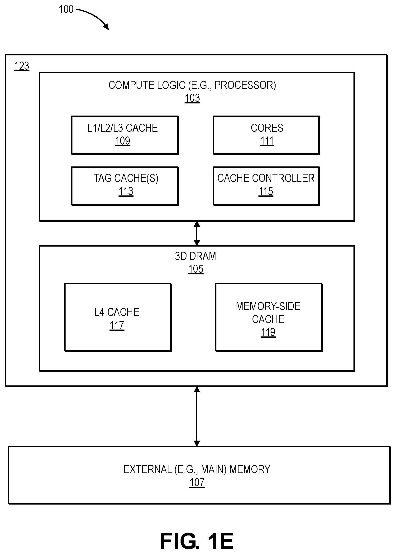 The descriptions are generally related to processor and memory technology. Dynamic random-access memory (DRAM) generally includes an array of bit cells, each cell capable of storing a bit of information. A typical cell configuration consists of a capacitor for storing a charge that represents the bit being stored and an access transistor that provides access to the capacitor during read and write operations. The access transistor is connected between a bitline and the capacitor and is gated (turned on or off) by a wordline signal. During a read operation, the stored bit of information is read from the cell via the associated bitline. During a write operation, a bit of information is stored into the cell from the bitline via the transistor. The cells are dynamic in nature, and therefore must be periodically refreshed. DRAM that is integrated on the same die or multi-chip module (MCM) as a processor or other compute logic is referred to as embedded DRAM (eDRAM). Embedded DRAM may have some performance advantages compared to external DRAM in a different package than the processor; however, existing eDRAM technology has a higher cost-per-bit compared to external DRAM and is also limited in its ability to scale. The following description includes discussion of figures having illustrations given by way of example of implementations of embodiments of the invention. The drawings should be understood by way of example, and not by way of limitation. As used herein, references to one or more “embodiments” or “examples” are to be understood as describing a particular feature, structure, and/or characteristic included in at least one implementation of the invention. Thus, phrases such as “in one embodiment” or “in one example” appearing herein describe various embodiments and implementations of the invention, and do not necessarily all refer to the same embodiment. However, they are also not necessarily mutually exclusive. Descriptions of certain details and implementations follow, including a description of the figures, which may depict some or all of the embodiments described below, as well as discussing other potential embodiments or implementations of the inventive concepts presented herein. Tightly integrated compute logic and three-dimensional (3D) memory can enable large on-package caches. In one example, a 3D DRAM is stacked with and integrated with compute logic in the same package. The compute logic may include, for example, one or more processor cores, SRAM cache(s), and cache control circuitry. The 3D DRAM includes multiple layers of DRAM cells on a die. The multiple layers of DRAM cells and the compute logic are connected with one another with vias through the multiple layers, without the need to route signals through an underlying PCB. The integrated 3D DRAM enables forming fast caches that are significantly larger than conventional caches. In one example, the integrated 3D DRAM includes a large level 4 (L4) cache, a large memory-side cache, or both an L4 cache and a memory-side cache. However, the large capacity of the integrated L4 and/or memory-side caches leads to significant tag overhead both in terms of space and tag access time. In one example, the compute logic includes one or more tag caches to cache recently accessed tags from the L4 cache, the memory-side cache, or both. A cache controller in the compute logic is to receive a request from one of the processor cores to access an address and compare tags in the tag cache with the address. In response to a hit in the tag cache, the cache controller accesses data from the L4 cache at a location indicated by an entry in the tag cache, without performing a tag lookup in the L4 cache. Similarly, in a system with a memory-side cache on the integrated 3D DRAM instead of an L4 cache, a tag cache in the compute logic can store tags from the memory-side cache. In a system with both a memory-side cache and an L4 cache on the integrated 3D DRAM, the compute logic can include two tag caches (or a partitioned tag cache) to store tags for the memory-side cache and the L4 cache. The tag caches reduce the instances in which the L4 cache tags and memory-side cache tags are accessed, which can enable lower latency cache accesses. The large integrated DRAM caches may be formed from multiple interconnected DRAM layers on a die. Conventionally, memory and processing logic are fabricated on different dies. DRAM dies conventionally include a single DRAM layer. For example, For example, In addition to varying orientation (e.g., 3D DRAM over or under the compute logic), the compute logic 103 and 3D DRAM 105 may occupy the same or similar area (footprint) or may have different sizes and occupy different areas. In the illustrated example, the 3D DRAM 105 includes an L4 cache 117 and a memory-side cache 119. In other examples, the 3D DRAM may include only an L4 cache or only a memory-side cache. The L4 cache is one level of cache in a cache hierarchy, and in one example, may be considered the last level cache (LLC). In one example, the L4 cache 117 is shared by more than one processor core. In one example, the memory-side cache 119 only caches addresses and data from a local attached memory (e.g., from the local external memory device 107, but not from a remote external memory attached to another socket and/or in a different domain). In contrast, in one example, the L4 cache 117 may cache data and addresses from both a local and remote memory. In one example, one or both of the L4 cache 117 and the memory-side cache 119 are set-associative caches. However, other cache placement policies may be implemented (e.g., fully associative, or other cache placement policies). One or both of the L4 cache 117 and the memory-side cache 119 may be “banked” into multiple banks or partitions. The compute logic includes one or more processor cores 111 and one or more levels of cache 109 (e.g., level 1 (L1), level 2 (L2), level 3 (L3), etc.). The one or 