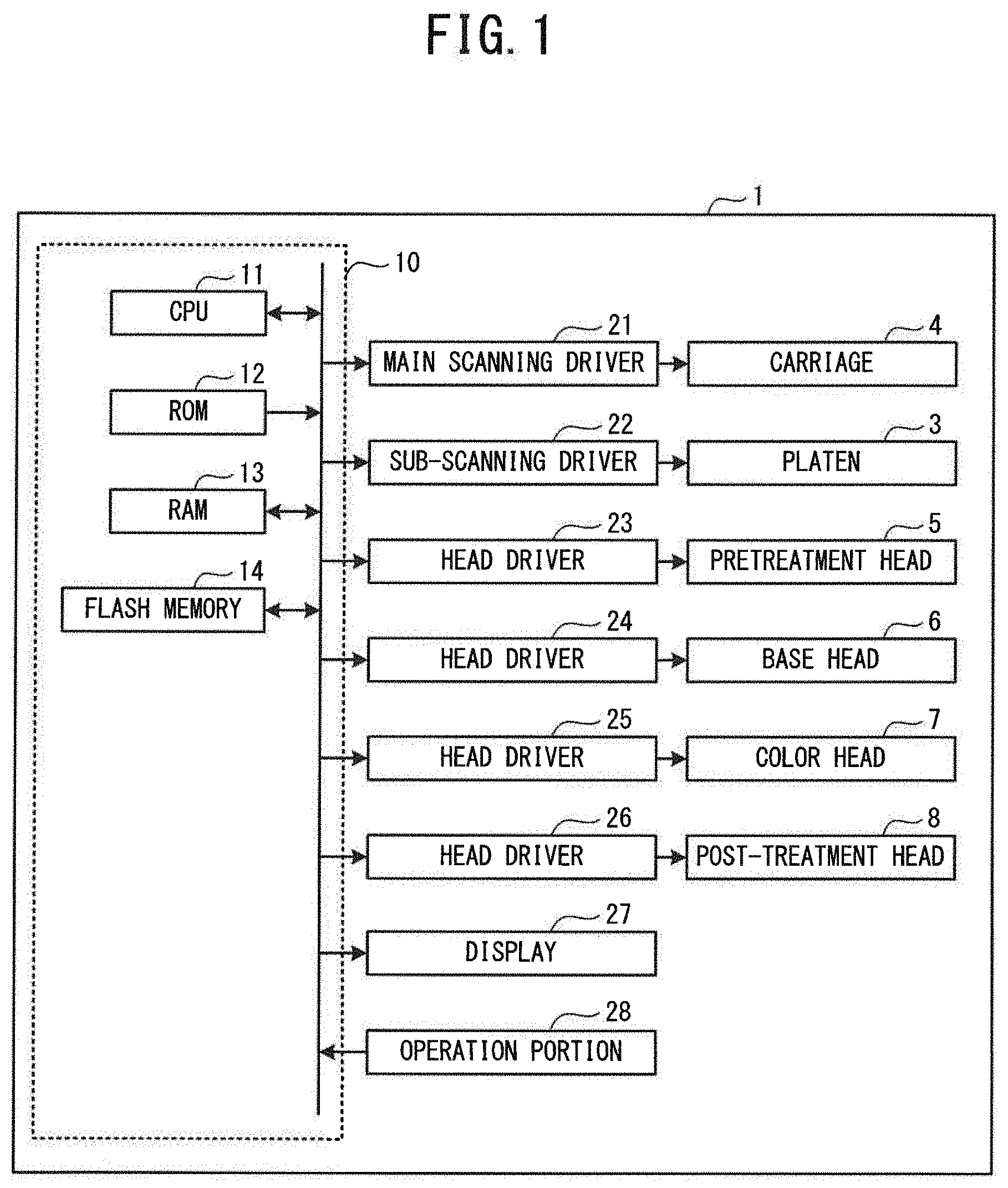 In the present disclosure, various modifications can be made to the above-described embodiment. Various modified examples explained below can be respectively combined insofar as contradictions do not arise. For example, in the above-described embodiment, the printer 1 may be a type other than the inkjet printer, and may be a laser printer, a tape printer, or the like. Some or all of the pretreatment head 5, the base head 6, the color head 7, and the post-treatment head 8 may be a line head.