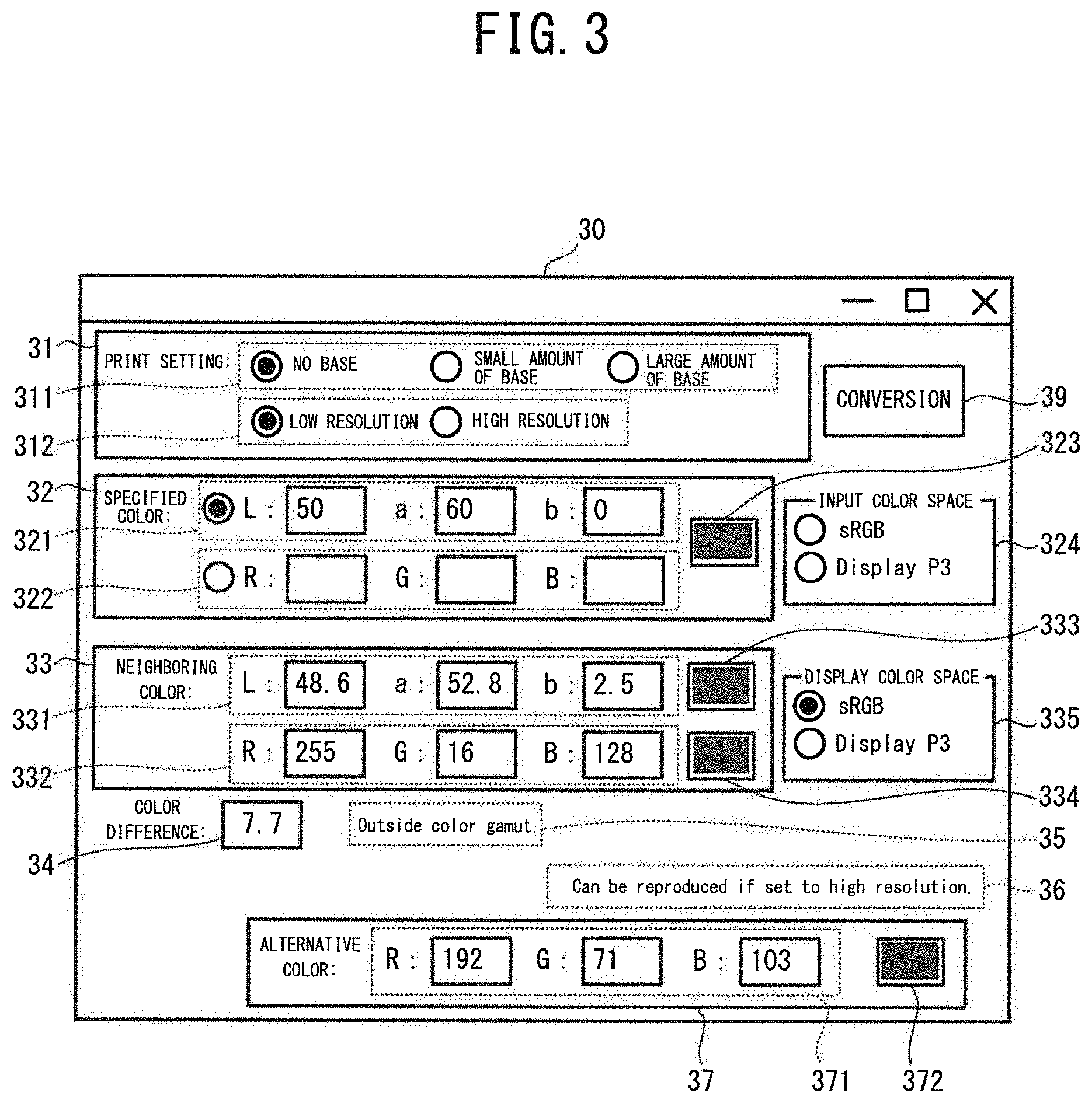 The CPU 11 displays “Can be reproduced even at low resolution.” in the alternative print setting display region 36. “Can be reproduced even at low resolution.” indicates that, even if the high resolution (the target print settings) is changed to the low resolution (the second alternative print settings), the printer 1 can reproduce the specified color using a color in the print setting-based color gamut. In other words, even if the print settings are changed from the target print settings to the second alternative print settings, the printer 1 can suppress the print color from becoming distant from the specified color.