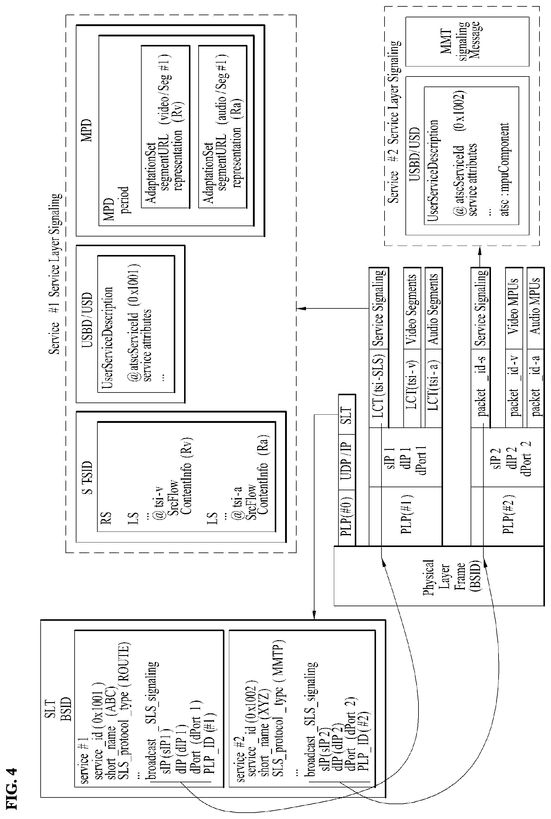 {5/15 120 6/15 108 7/15 96 8/15 84 9/15 72 10/15 60 11/15 48 12/15 36 13/15 24 5/15 30 6/15 27 7/15 24 8/15 21 9/15 18 10/15 15 11/15 12 12/15 9 13/15 6 Option Each TI group contains one TI block and is mapped directly 1 to one frame as shown in (a). This option is signaled in PLS2-STAT by DP_TI_TYPE = ‘0’ and DP_TI_LENGTH = ‘1’ (NTI = 1). Option Each TI group contains one TI block and is mapped to 2 more than one frame. (b) shows an example, where one TI group is mapped to two frames, i.e., DP_TI_LENGTH = ‘2’ (PI = 2) and DP_FRAME_INTERVAL (IJUMP = 2). This provides greater time diversity for low data- rate services. This option is signaled in PLS2-STAT by DP_TI_TYPE = ‘1’. Option Each TI group is divided into multiple TI blocks and is 3 mapped directly to one frame as shown in (c). Each TI block may use a full TI memory so as to provide a maximum bit-rate for a DP. This option is signaled in PLS2-STAT by DP_TI_TYPE = ‘0’ and DP_TI_LENGTH = NTI, while PI = 1. p = 0; for i = 0;i < NcellsN′xBLOCK {GENERATE (Rn,s,i, Cn,s,i); Vi= NrCn,s,j+ Rn,s,j if Vi< NcellsNxBLOCK { Zn,s,p= Vi; p = p + 1; } } 0x00 Value gener- 0b0000000000000001 USBD/USD is ated by OR contained in operation this bundle applied on 0b0000000000000010 S-TSID is the following contained in values this bundle 0b0000000000000100 MPD is contained in this bundle 0x01-0x03 16-bits hashed value To enable the derived from the url client to of Service Layer filter the Signaling fragment fragment that has instance url in question before assembling LCT packets ≥0x04 . . . Reserved MODE FOR INVENTION