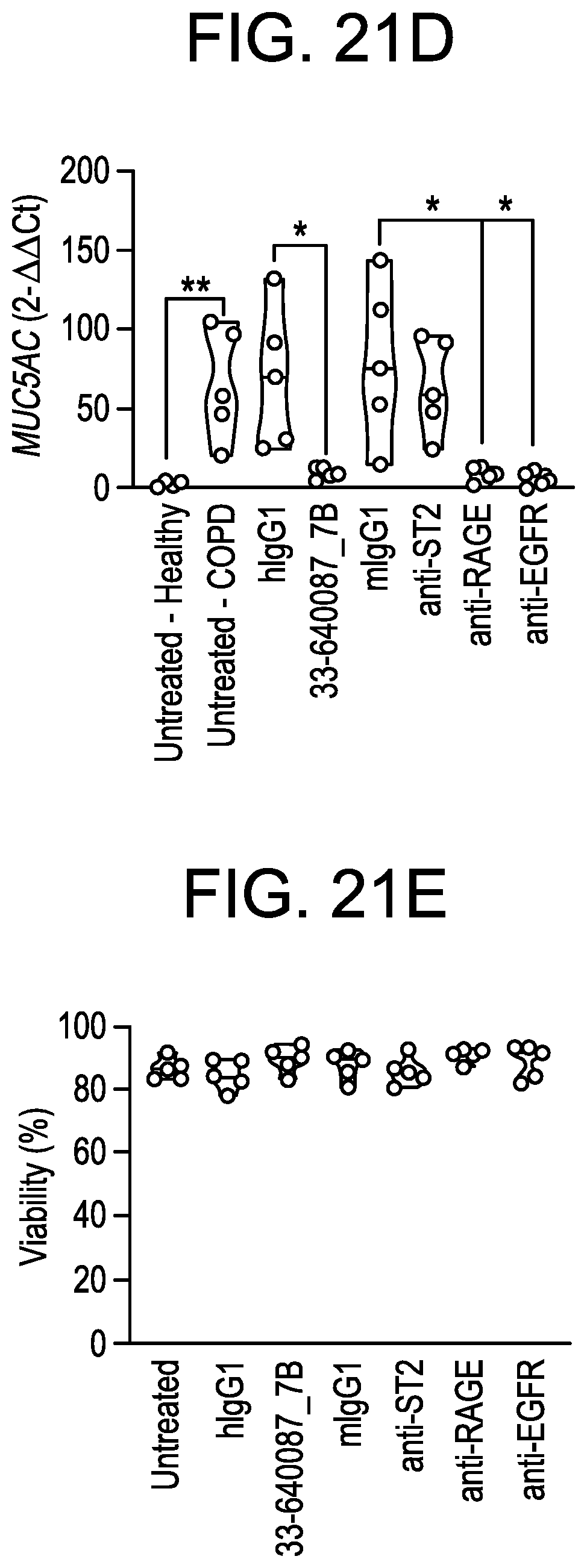 COPD ALI were cultured in the presence of anti-IL-33 (33-640087_7B), anti-RAGE or anti-EGFR neutralizing antibodies. All three treatments resulted in reduced MUC5AC+goblet cell numbers (FIG. 21A-D). No treatments affected the viability of the ALI cultures (FIG. 21E), confirming that the treatment phenomenon is not an artefact or a result of antibody toxicity. Consistent with previous results, anti-ST2 treatment did not result in reduction of goblet cell numbers, providing further evidence that this is a disease phenotype mediated directly by IL-33, principally ox-IL-33, through the oxIL-33-RAGE-EGFR pathway. The effect of anti-IL-33 antibody (33-640087_7B) on COPD ALI cultures was further confirmed in immunohistochemistry analysis where blockade of IL-33 resulted in decreased goblet cell numbers in pairwise analysis (FIGS. 22A and 22B). After treatment with anti-IL-33 antibody (33-640087_7B), the epithelium of the COPD ALI culture resembled healthy epithelium as shown in FIG. 20A.