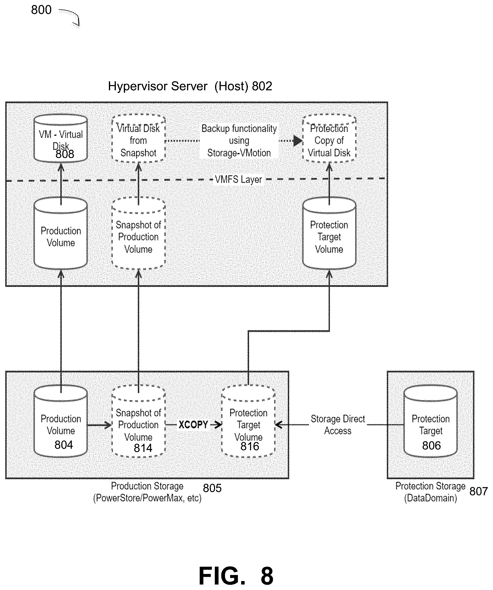 taking a snapshot copy of the production volume; preparing the protection volume to receive backup data from the production volume; exposing, through first a mapping, the production volume snapshot copy and prepared protection volume, through a second mapping, to a hypervisor host as if they are two regular virtual machine file system (VMFS) volumes; and performing the backup operation for the VMFS based virtual machines by offloading the data copy operation to the storage system of at least one of the production volume or protection volume to enable a direct transfer of data without involving the hypervisor host. 11. The method of 12. The method of taking a full backup of the production volume followed by one or more regular incremental backups; receiving, for the full backup, an entire range of blocks by the protection storage as part of an XCOPY operation, the entire range representing an entire Virtual Disk region; and finding, for the incremental backup, an overlap of changed blocks of storage logical units (LU) and XCOPY block ranges to get the changed blocks of the Virtual Disk. 13. The method of 14. The method of 15. The method of 16. The method of 17. The method of 18. The method of importing the backup copy from the protection target to the production storage as a volume using a Storage Direct/Direct Access feature. exporting the imported backup copy to the hypervisor host as a volume, to act as a source in XCOPY; provisioning a new destination volume is in production storage; exporting the provisioned volume to the host to act as a destination in XCOPY; and performing an SV-Motion-process using XCOPY of Virtual Disk(s) from the Storage Direct/Direct Access volume to snapshot the source volume to the new destination volume. 19. A system for transferring data directly from primary storage to secondary storage in a virtualized network including virtual machine (VM) based storage, comprising: