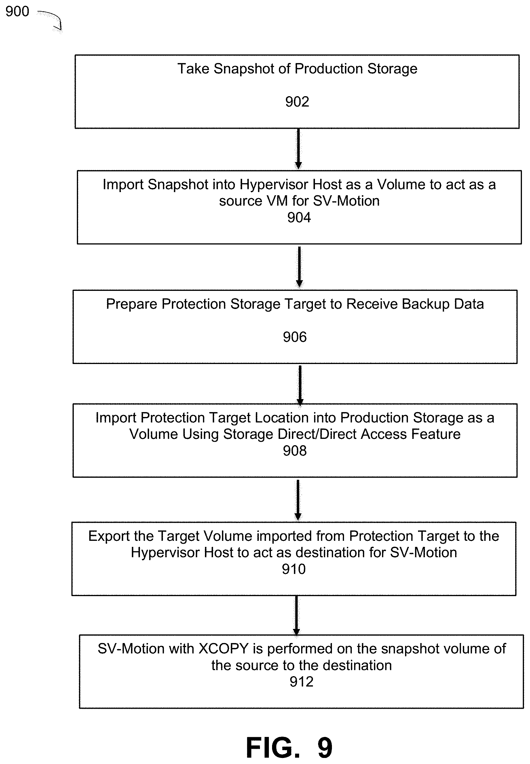 The present application is claims priority to Indian Patent Application No. 202111023668 filed on May 27, 2021, entitled “Storage Assisted Virtual Machine Backups Using Storage VMOTION and XCOPY,” and assigned to the assignee of the present application, and is related to U.S. Patent Application entitled “System and Method for Data Migration Across Storage Systems,” docket no. 115630.01. Embodiments are generally directed to large-scale backup systems, and more specifically to directly storing virtual machine data in secondary storage from primary storage. Data protection comprising backup and recovery software products are crucial for enterprise-level network clients. Customers rely on backup systems to efficiently back up and recover data in the event of user error, data loss, system outages, hardware failure, or other catastrophic events to allow business applications to remain in service or quickly come back up to service after a failure condition or an outage. Secure and reliable backup processes form the basis for many information technology (IT) services. Today there are several models of IT services offered as a service (″aS), such as IaaS (infrastructure as a service), PaaS (platform as a service), SaaS (software as a service), and so on. In all these cases, digital businesses are transitioning to Pay-Per-Use model in which compute, network, and storage resources are provided as services, which can be charged either together or as separate components. In such scenarios, customers want to count every available resource for production usage. In addition, backup solutions are required for customers to protect their data. Most of the present backup solutions consume compute and network resources of a production system to accomplish data movement during backup/restore operations. Such resource usage can represent a significant cost of the IT operations of the business. One significant issue in present large scale virtualized systems that move data from a production environment as primary storage to a protection environment as protection storage is that data must be fed from the production storage to a hypervisor to virtual machines, such as through a Vproxy process, and then to secondary storage layer. This requires quite a few steps in the data transmission chain. What is needed, therefore, is a backup solution that alleviates the resource constraints on the production host in virtual machine (e.g., VMware) environments. What is further needed is a system that can transfer data to be backed up directly from primary to secondary storage without going through the different virtualization layers that are currently used. The subject matter discussed in the background section should not be assumed to be prior art merely as a result of its mention in the background section. Similarly, a problem mentioned in the background section or associated with the subject matter of the background section should not be assumed to have been previously recognized in the prior art. The subject matter in the background section merely represents different approaches, which in and of themselves may also be inventions. DellEMC, NetWorker, Data Domain, Data Domain Restorer, and PowerProtect Data Manager (PPDM) are trademarks of DellEMC Corporation. In the following drawings like reference numerals designate like structural elements. Although the figures depict various examples, the one or more embodiments and implementations described herein are not limited to the examples depicted in the figures. A detailed description of one or more embodiments is provided below along with accompanying figures that illustrate the principles of the described embodiments. While aspects of the invention are described in conjunction with such embodiment(s), it should be understood that it is not limited to any one embodiment. On the contrary, the scope is limited only by the claims and the described embodiments encompass numerous alternatives, modifications, and equivalents. For the purpose of example, numerous specific details are set forth in the following description in order to provide a thorough understanding of the described embodiments, which may be practiced according to the claims without some or all of these specific details. For the purpose of clarity, technical material that is known in the technical fields related to the embodiments has not been described in detail so that the described embodiments are not unnecessarily obscured. It should be appreciated that the described embodiments can be implemented in numerous ways, including as a process, an apparatus, a system, a device, a method, or a computer-readable medium such as a computer-readable storage medium containing computer-readable instructions or computer program code, or as a computer program product, comprising a computer-usable medium having a computer-readable program code embodied therein. In the context of this disclosure, a computer-usable medium or computer-readable medium may be any physical medium that can contain or store the program for use by or in connection with the instruction execution system, apparatus or device. For example, the computer-readable storage medium or computer-usable medium may be, but is not limited to, a random-access memory (RAM), read-only memory (ROM), or a persistent store, such as a mass storage device, hard drives, CDROM, DVDROM, tape, erasable programmable read-only memory (EPROM or flash memory), or any magnetic, electromagnetic, optical, or electrical means or system, apparatus or device for storing information. The computer-readable storage medium or computer-usable medium may be any combination of these devices or even paper or another suitable medium upon which the program code is printed, as the program code can be electronically captured, via, for instance, optical scanning of the paper or other medium, then compiled, interpreted, or otherwise processed in a suitable manner, if necessary, and then stor
